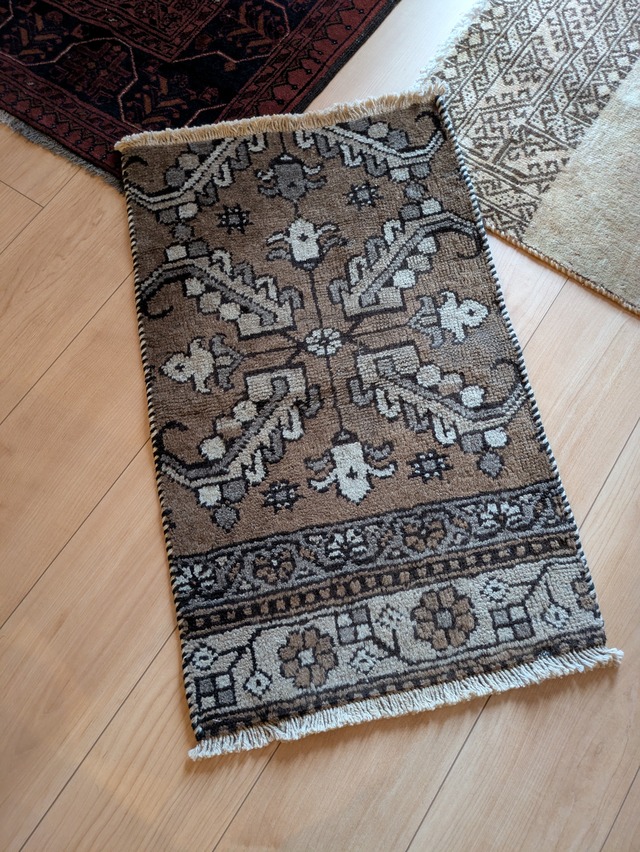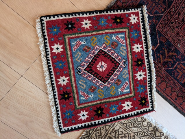 39×43cm ミニサイズのヤラメ絨毯です。 ヤラメ族が織るメダリオンが特徴的です。 ギャッベよりも目が細かく、軽くて薄くてしなやかです。 お部屋の素敵なアクセントになること間違いない1枚です。 ※商品の色は明るさや照明の色、角度などにより写真とは異なって見えることがございます。ご了承くださいませ。