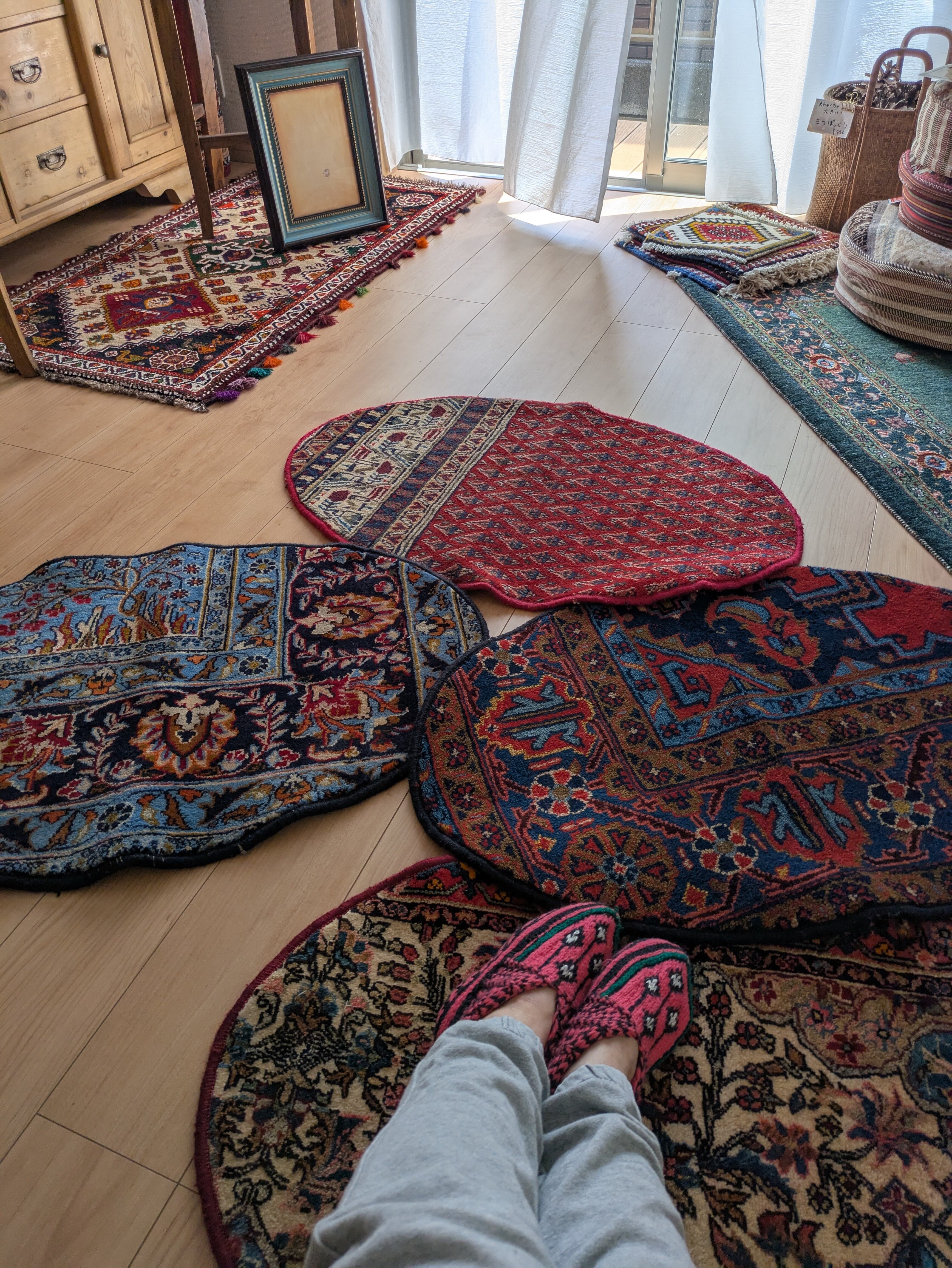 ヴィンテージのトライバルをリメイクして作った、オーバルのラグです。玄関マットにもおすすめのサイズです。その他にも足元のアクセントにいろいろなところでお使いいただけるかと思います。