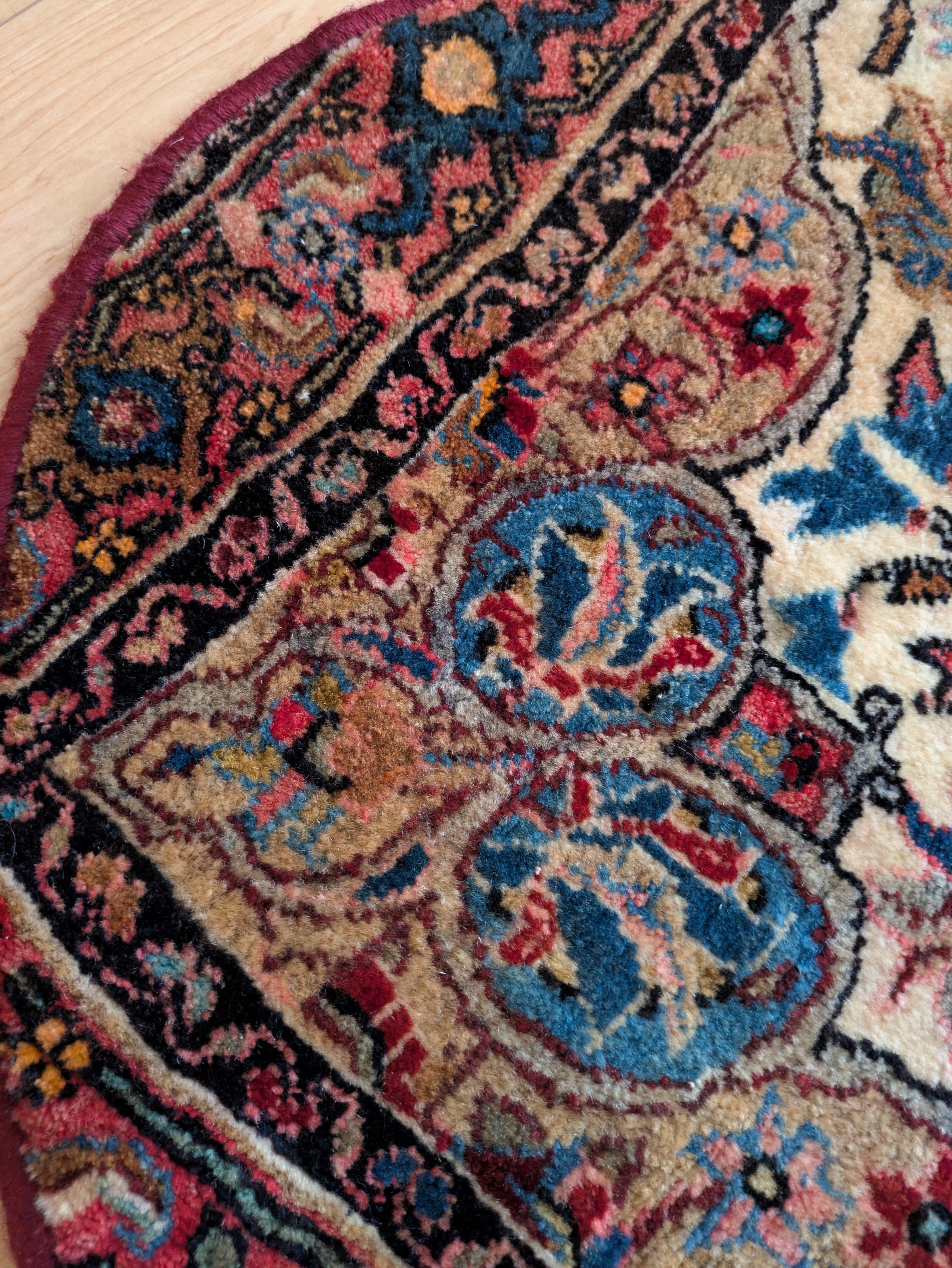 ヴィンテージのトライバルをリメイクして作った、オーバルのラグです。玄関マットにもおすすめのサイズです。その他にも足元のアクセントにいろいろなところでお使いいただけるかと思います。