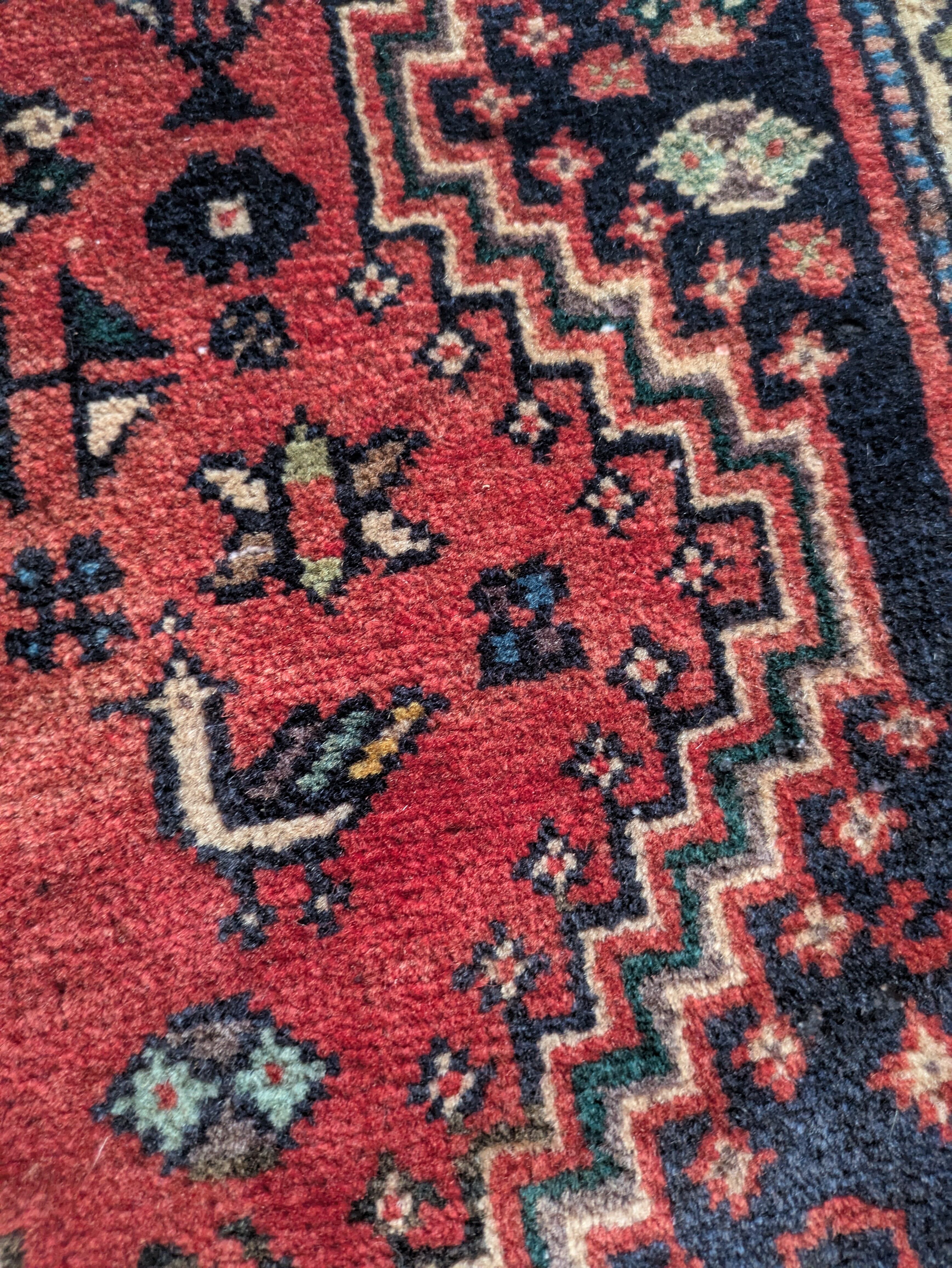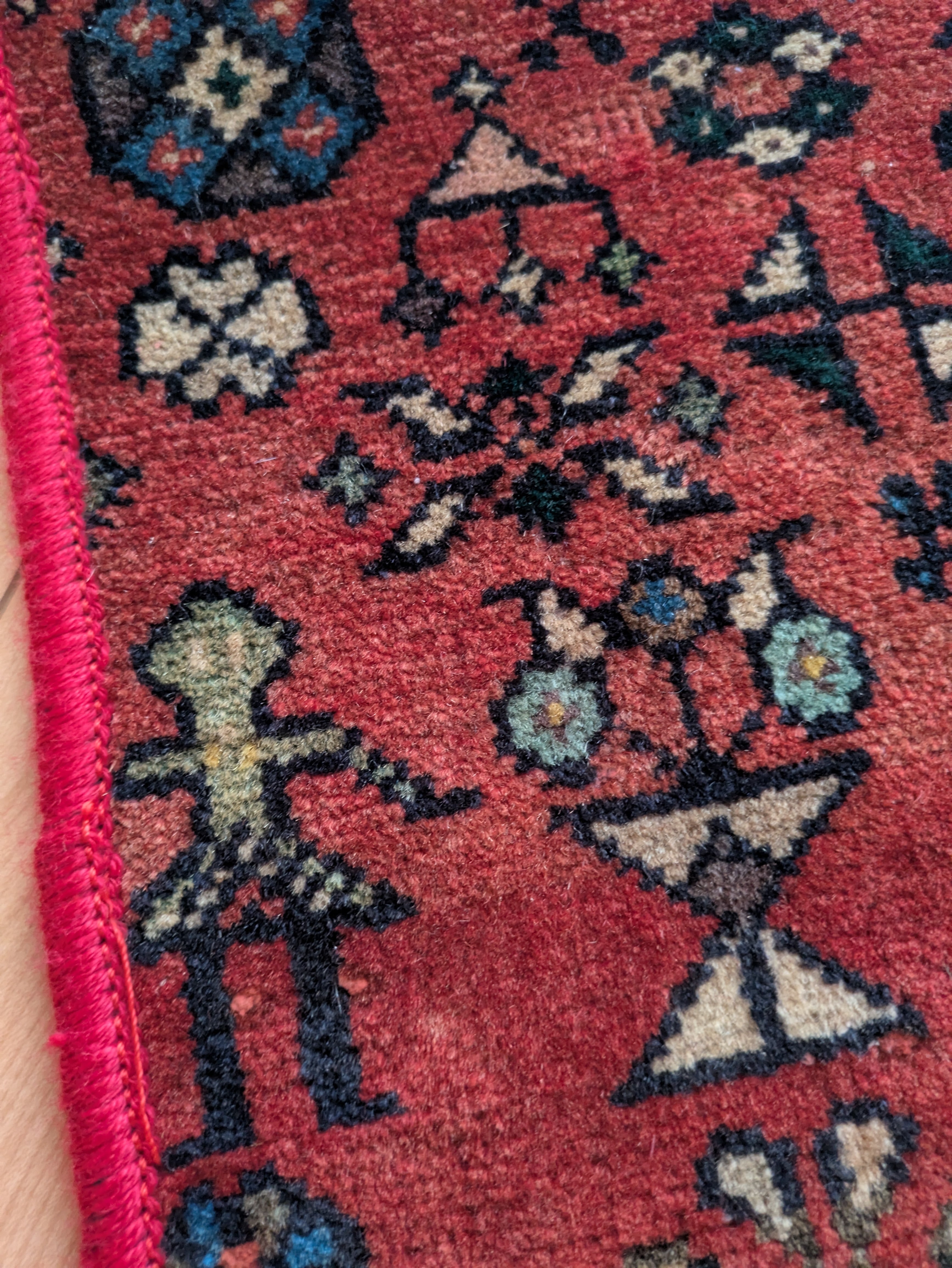 こちらの絨毯には神の使者である鳥や、子孫繁栄を願う女の子の柄、お花のように見えるオオカミの足跡、魔除けの文様である横向きのSの柄。。。など、たくさんの柄が織り込まれています。