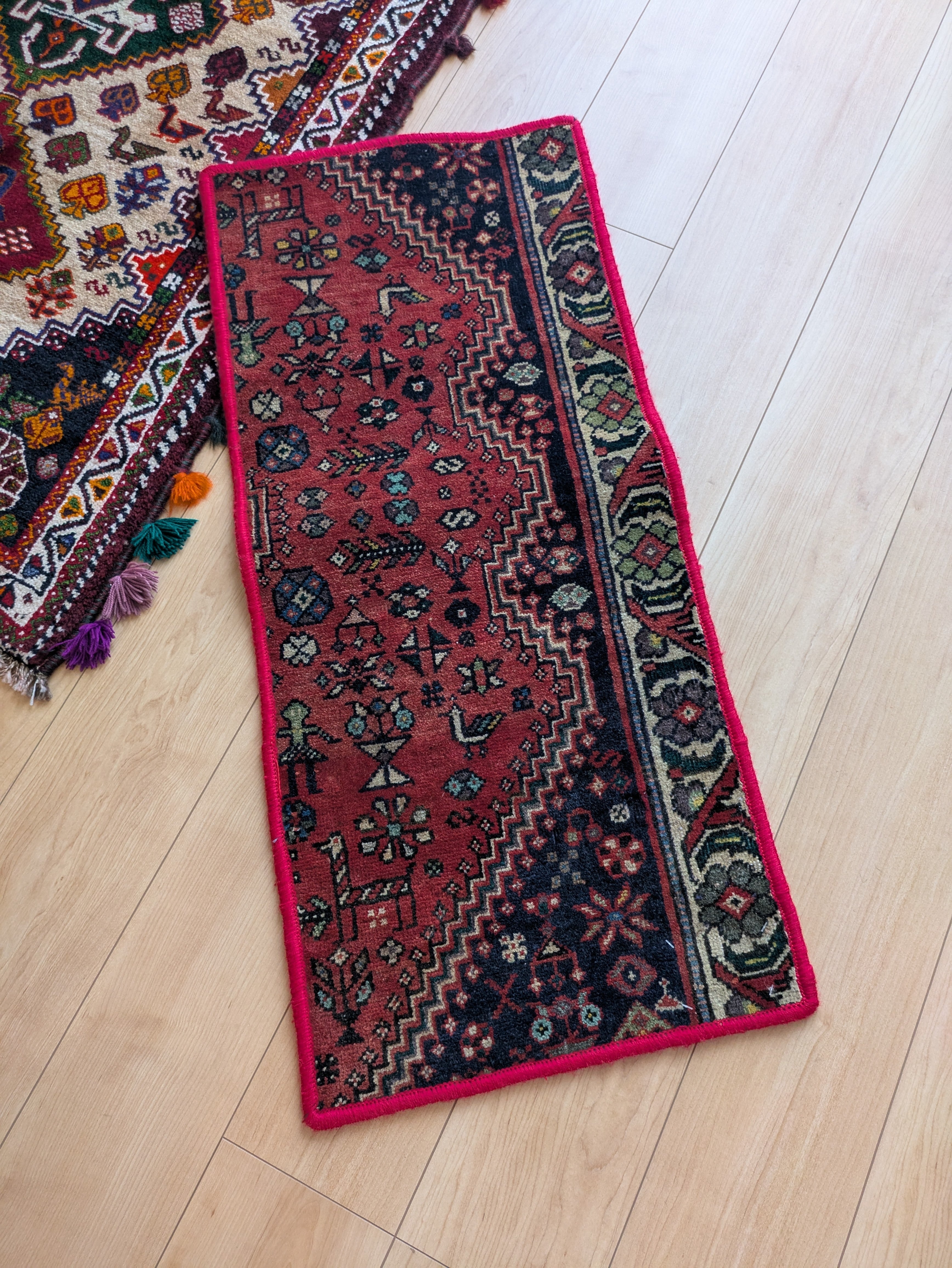 ヴィンテージのラグをリメイクして作ったので、色柄の出方は唯一無二の一点ものです。