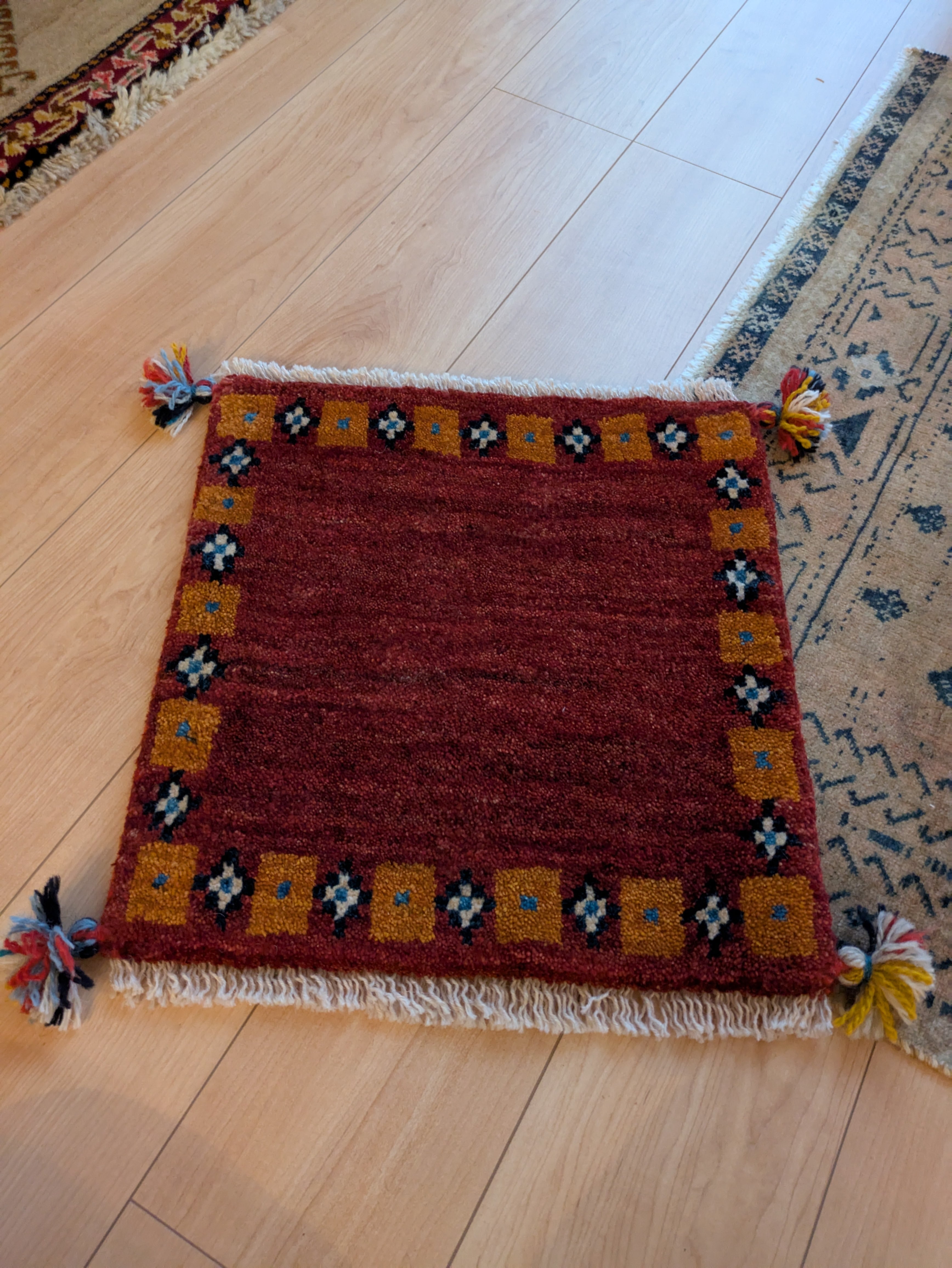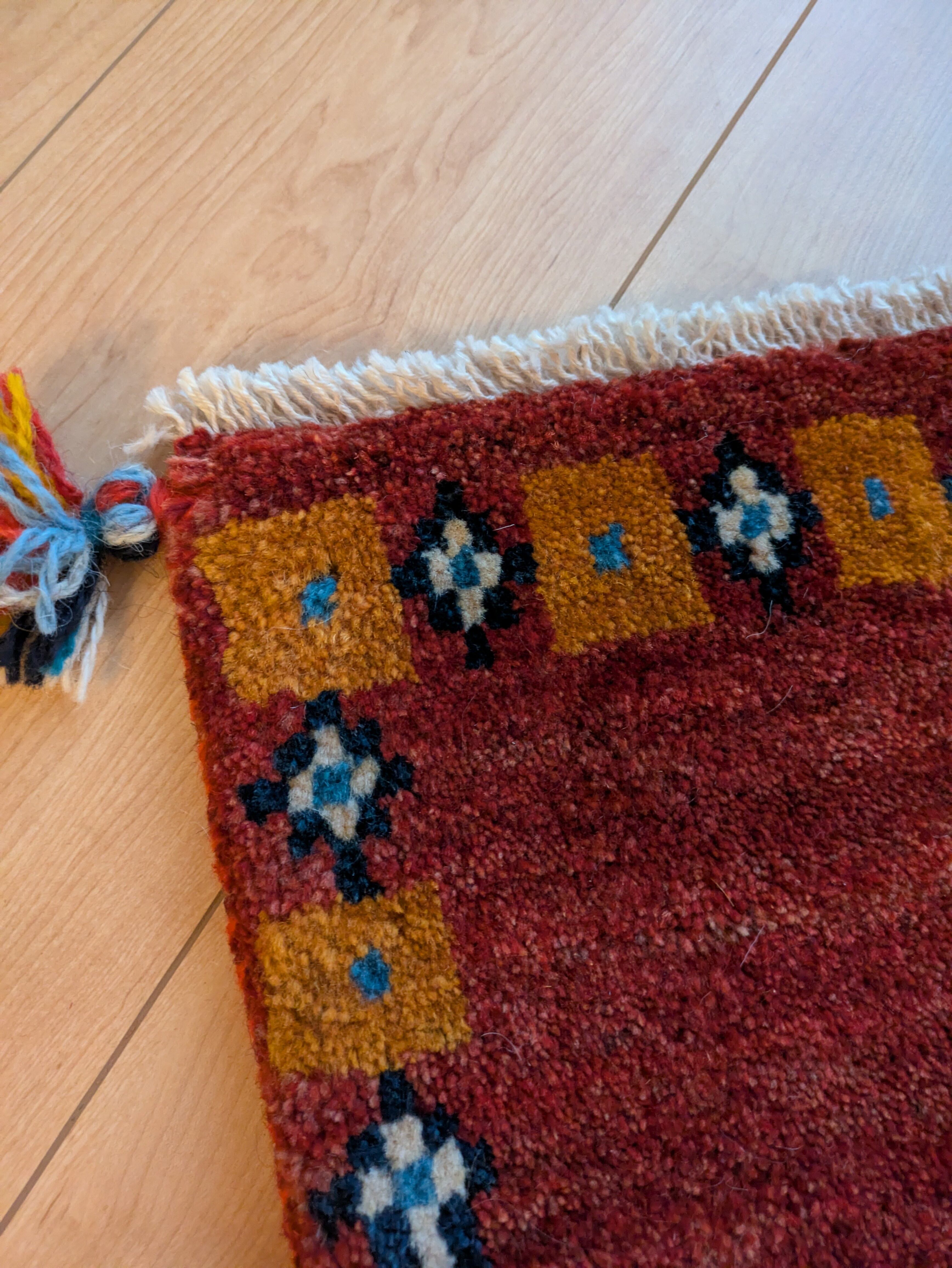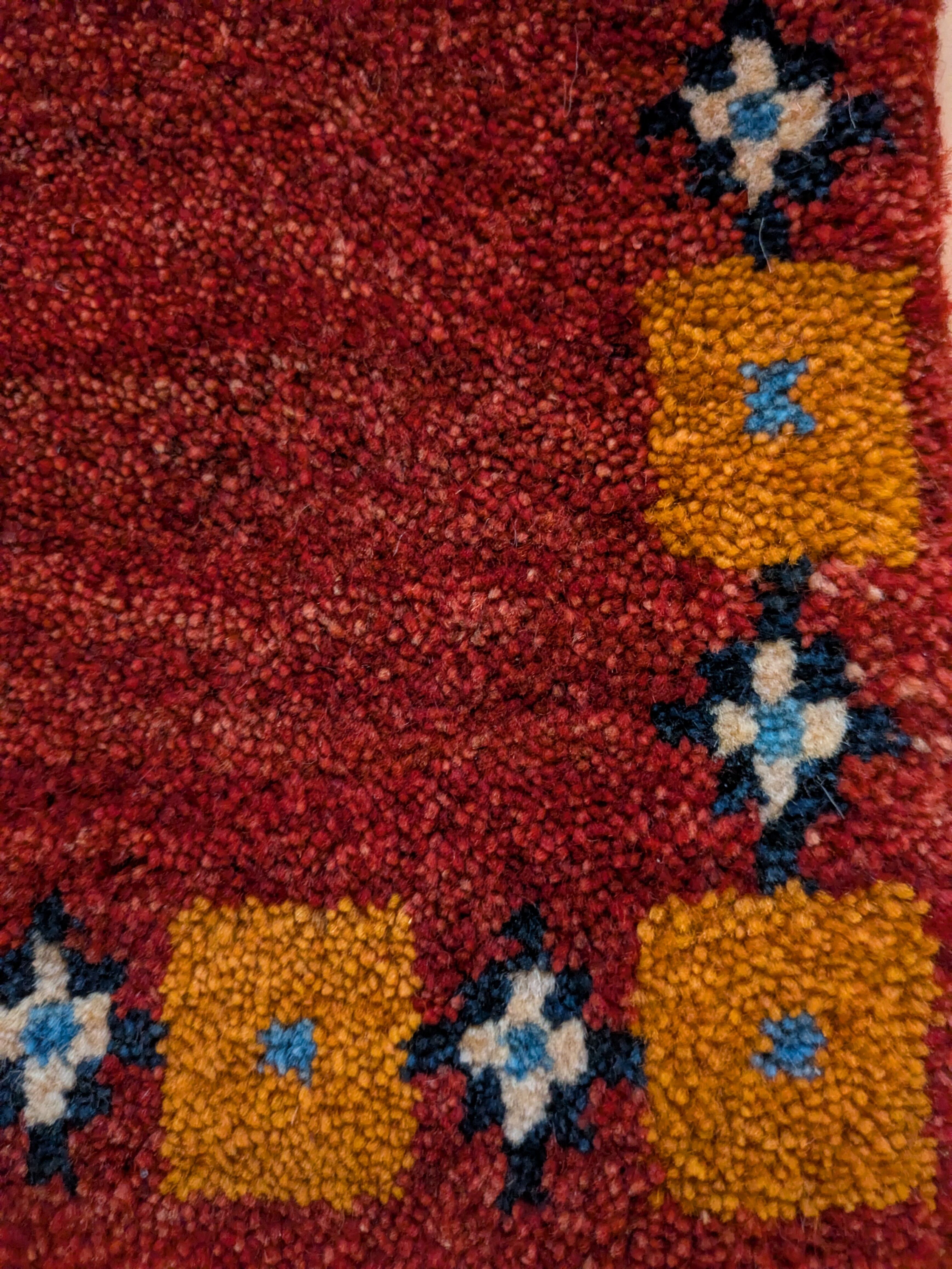 深い赤とオレンジで落ち着いた雰囲気のギャッベです。色違いもございます。
