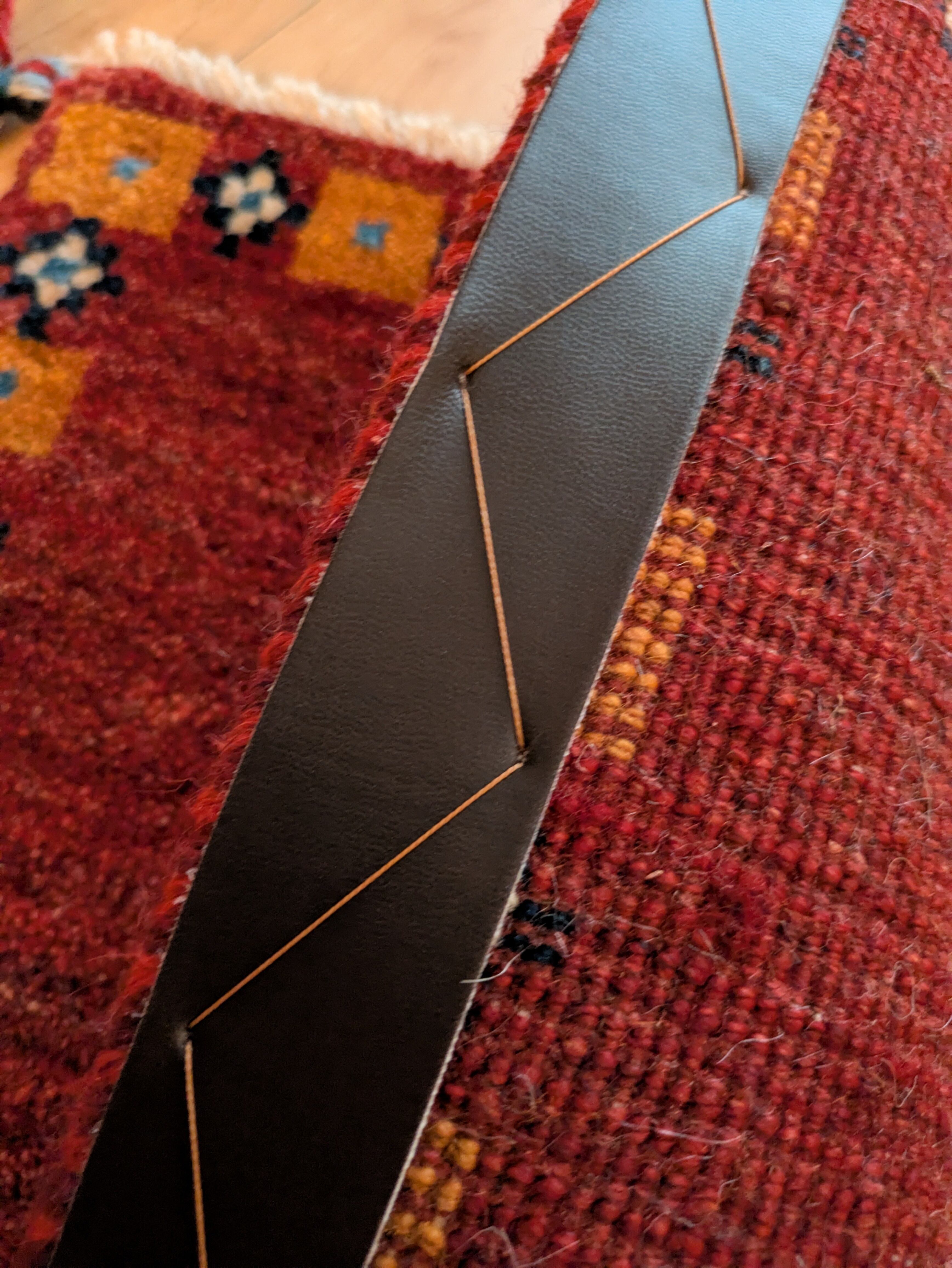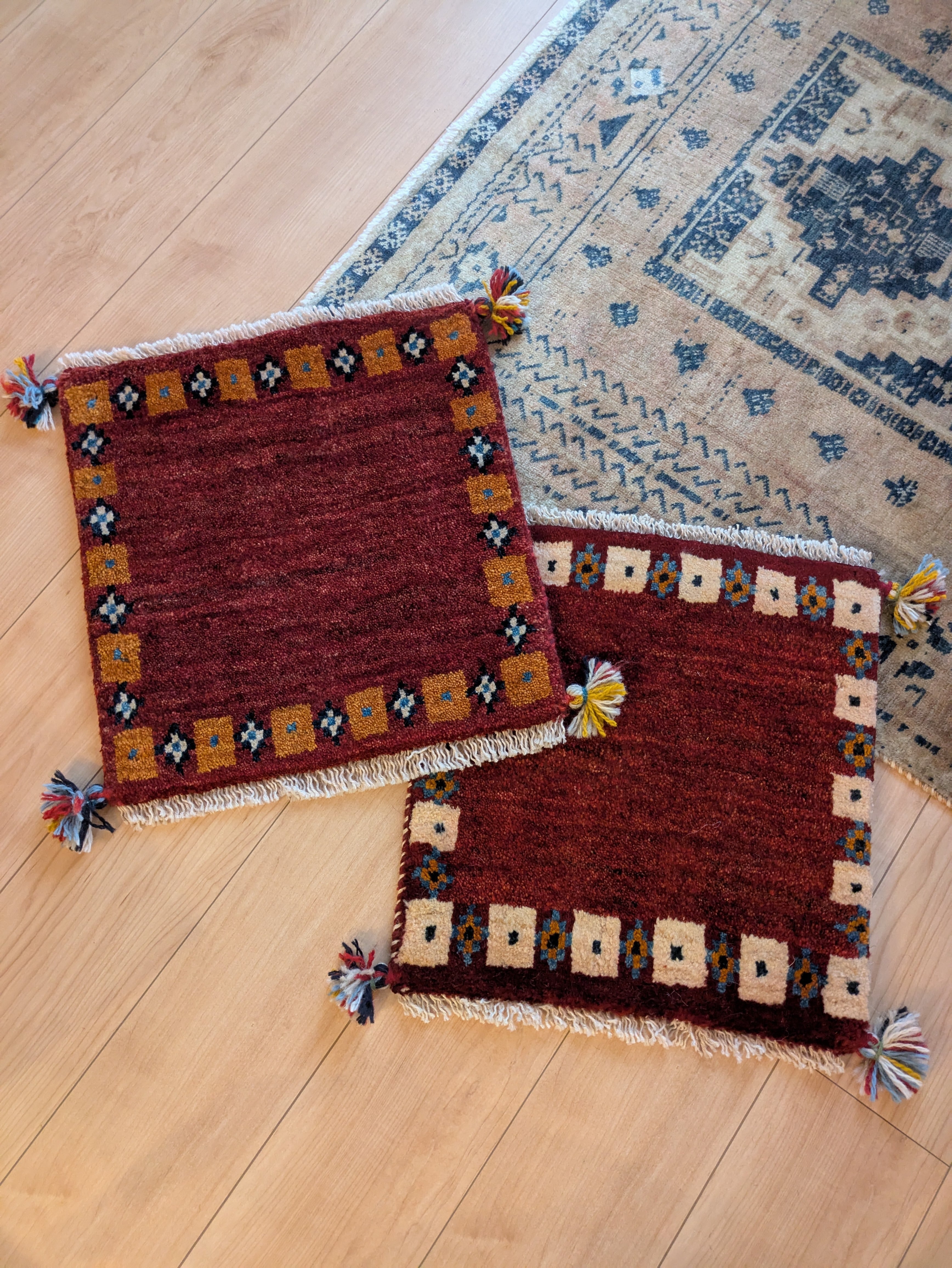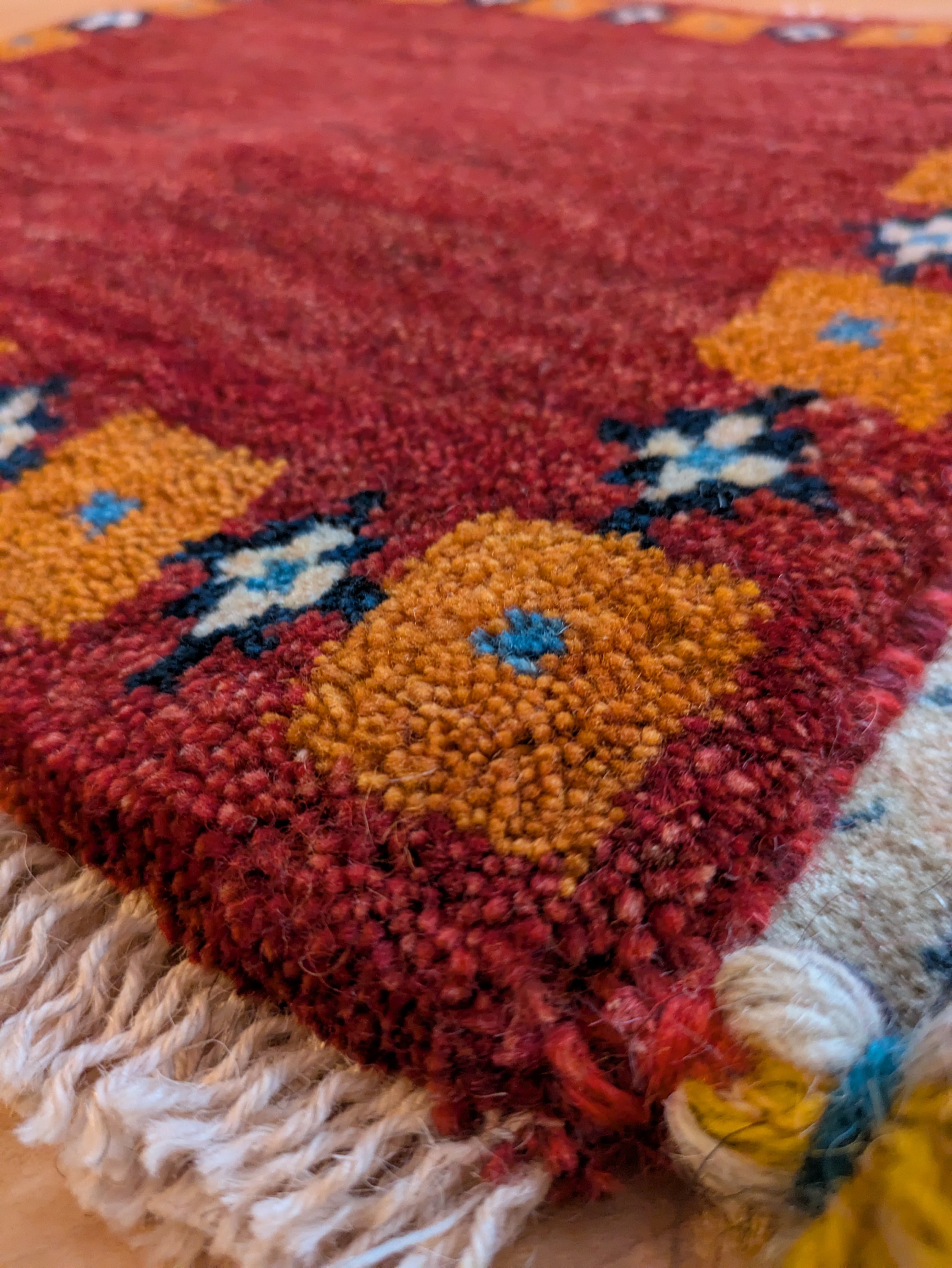 深い赤とオレンジで落ち着いた雰囲気のギャッベです。色違いもございます。