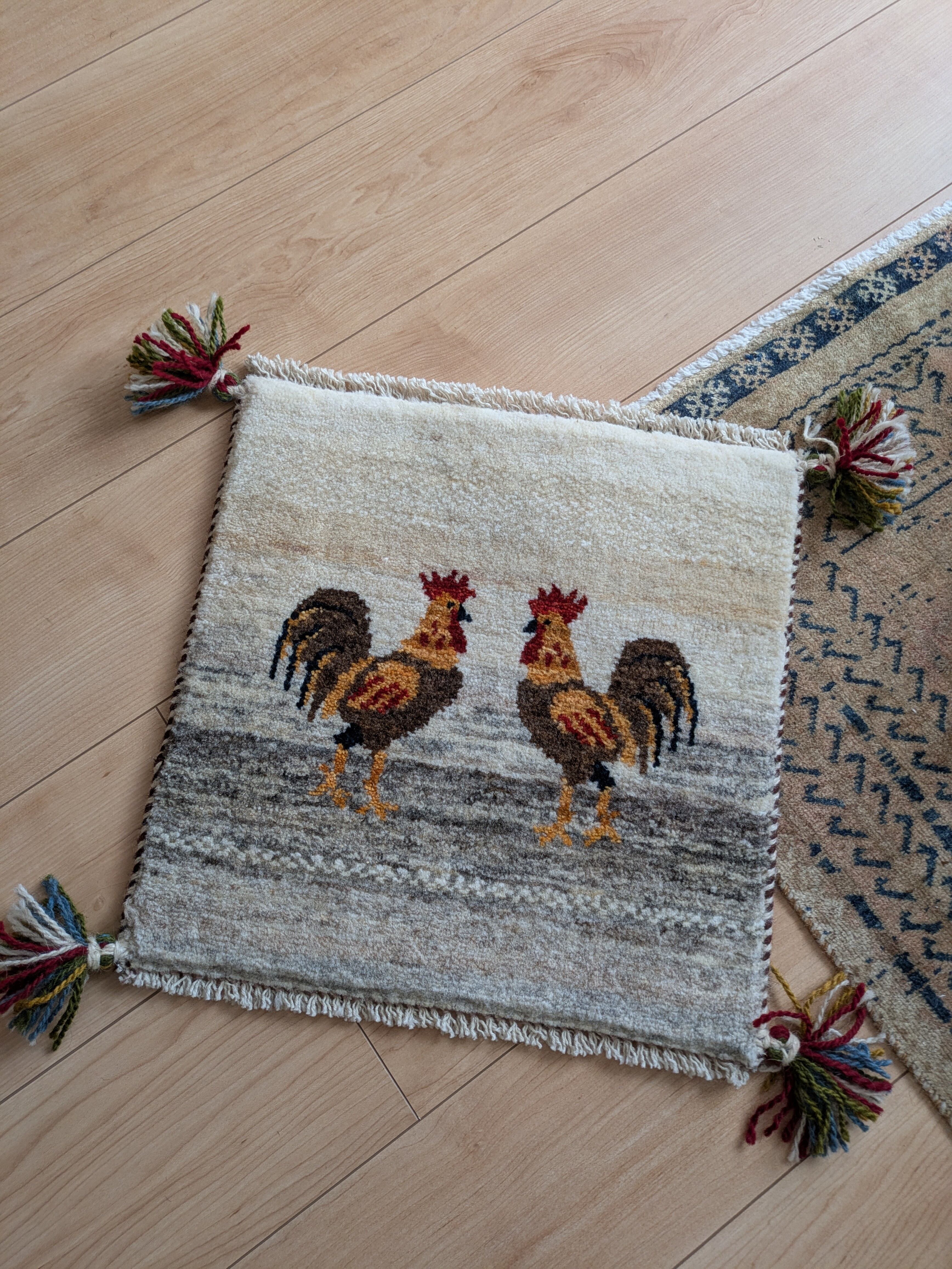 向かい合ったニワトリくんたちがとても可愛らしいギャッベてす。