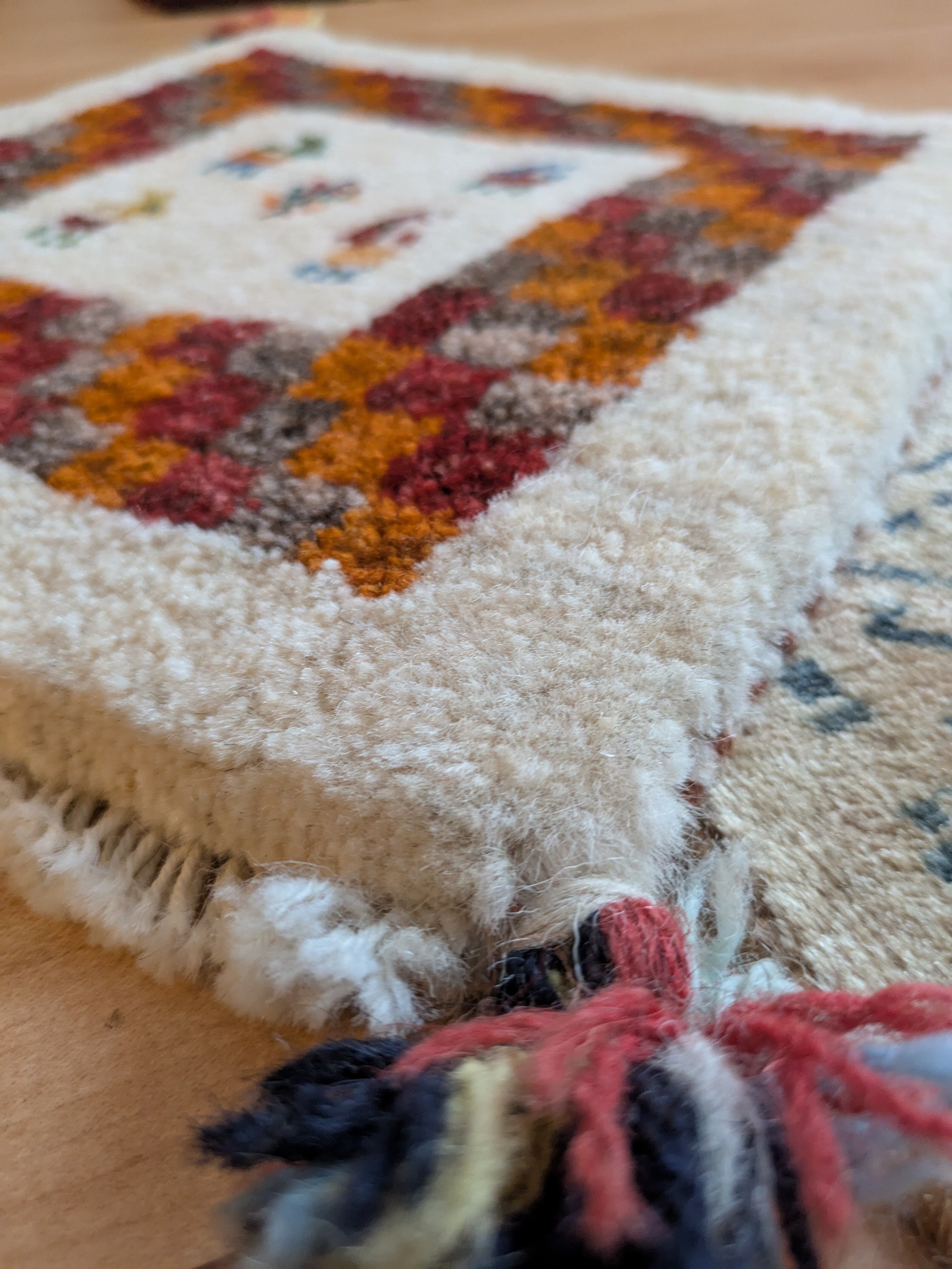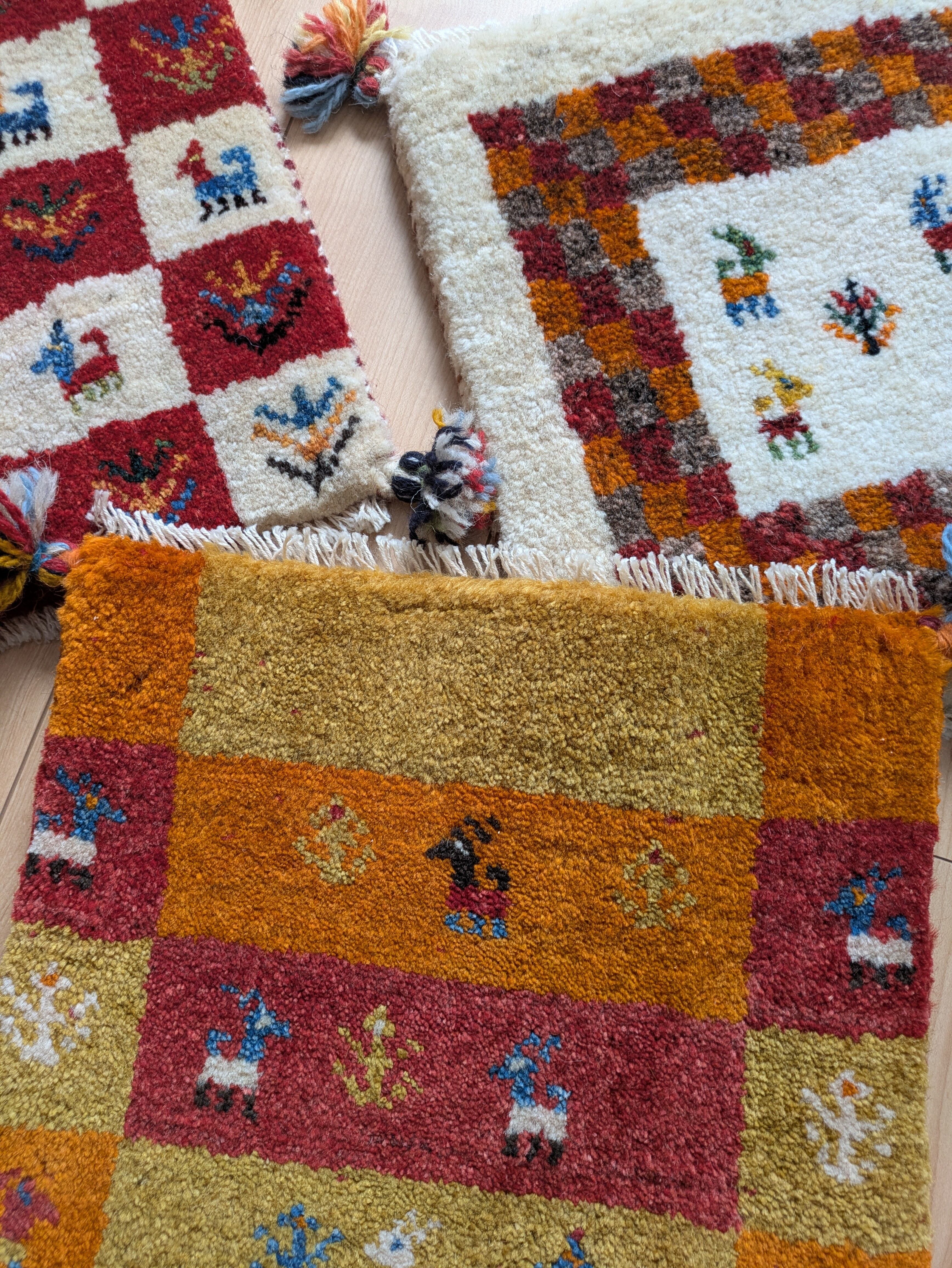 ナチュラルホワイトのベースで、厚さもしっかりあります。市松模様の中に集合している鹿と生命の木がかわいらしい1枚です。
