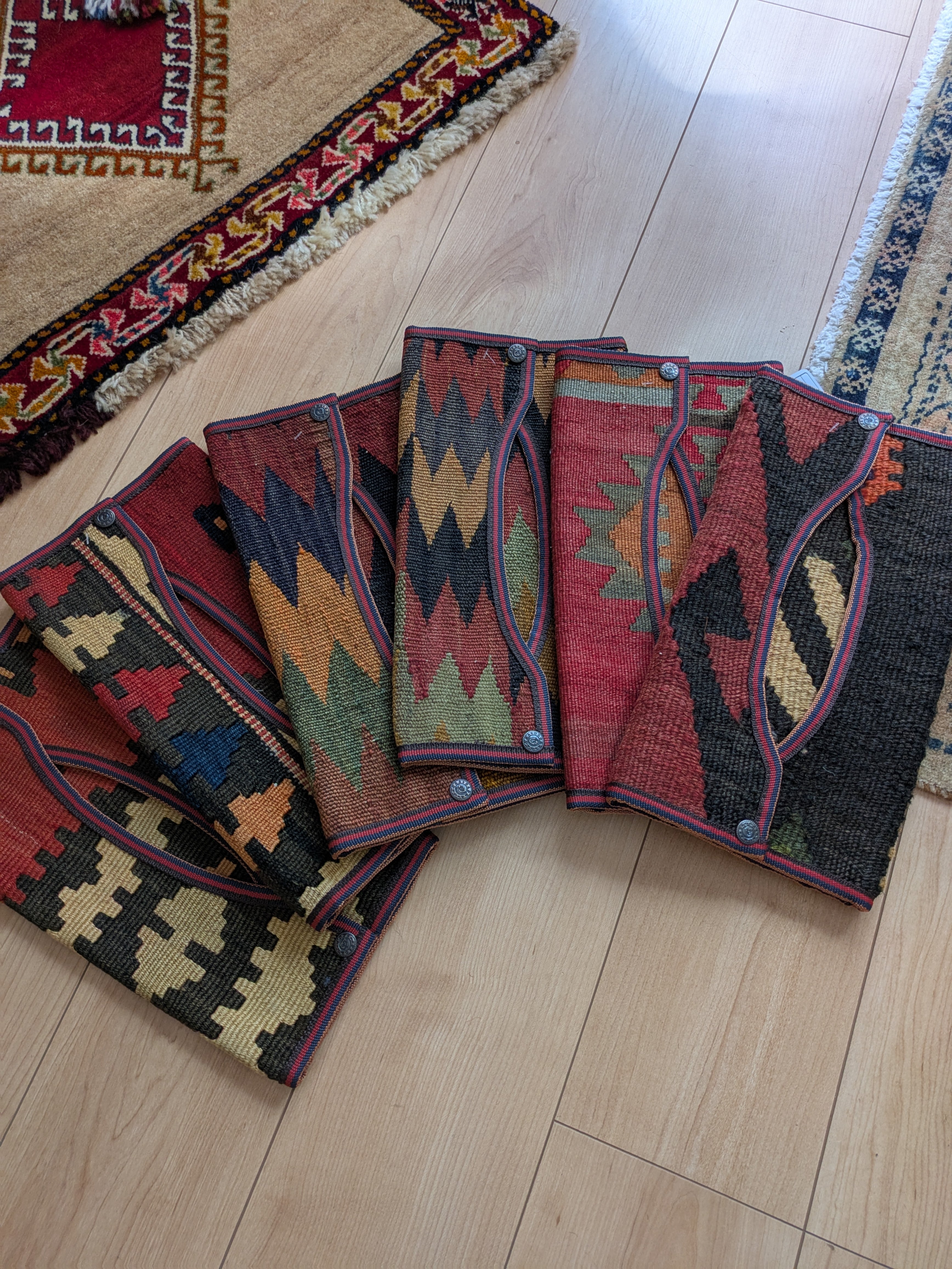 キリムの織り方やデザインは、その土地ごとに異なり、無数の色とりどりの糸が組み合わさった美しい模様が特徴です。その模様を活かし、丁寧に仕上げました。柄の出方がそれぞれ違うので唯一無二の一点ものです。