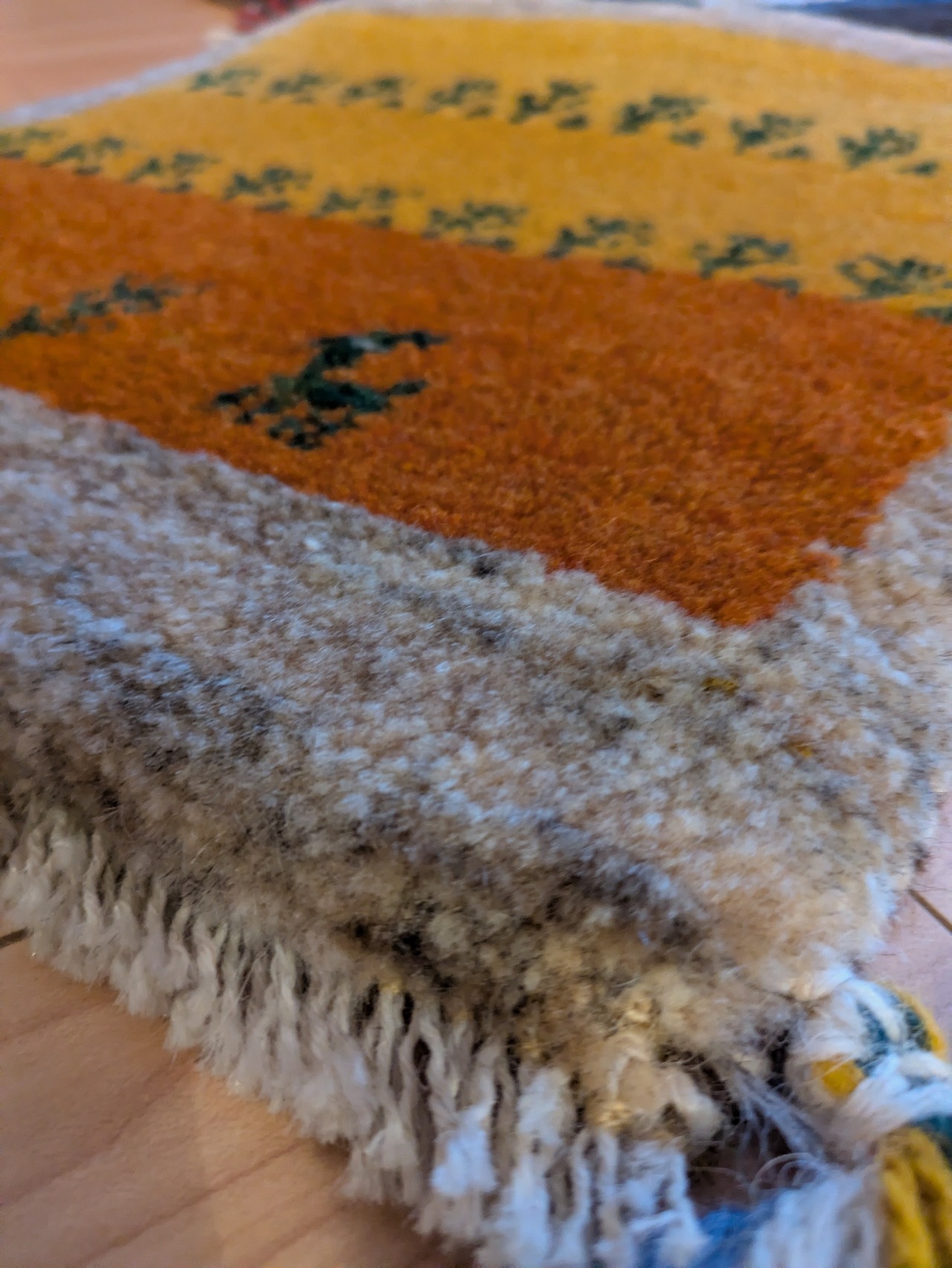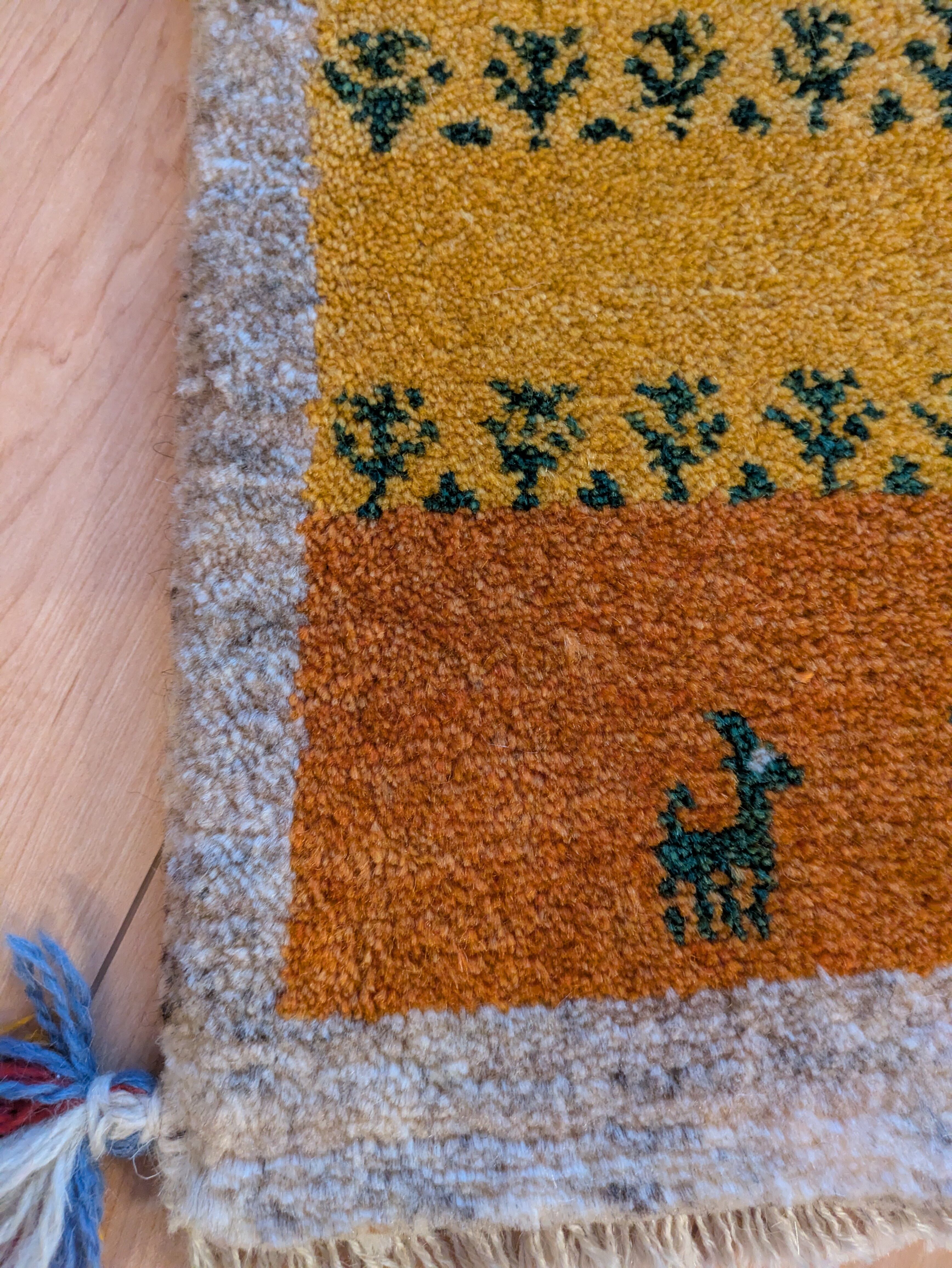 黄色からオレンジのグラデーションに、グリーンの生命の木と鹿の柄がかわいいギャッベです。
