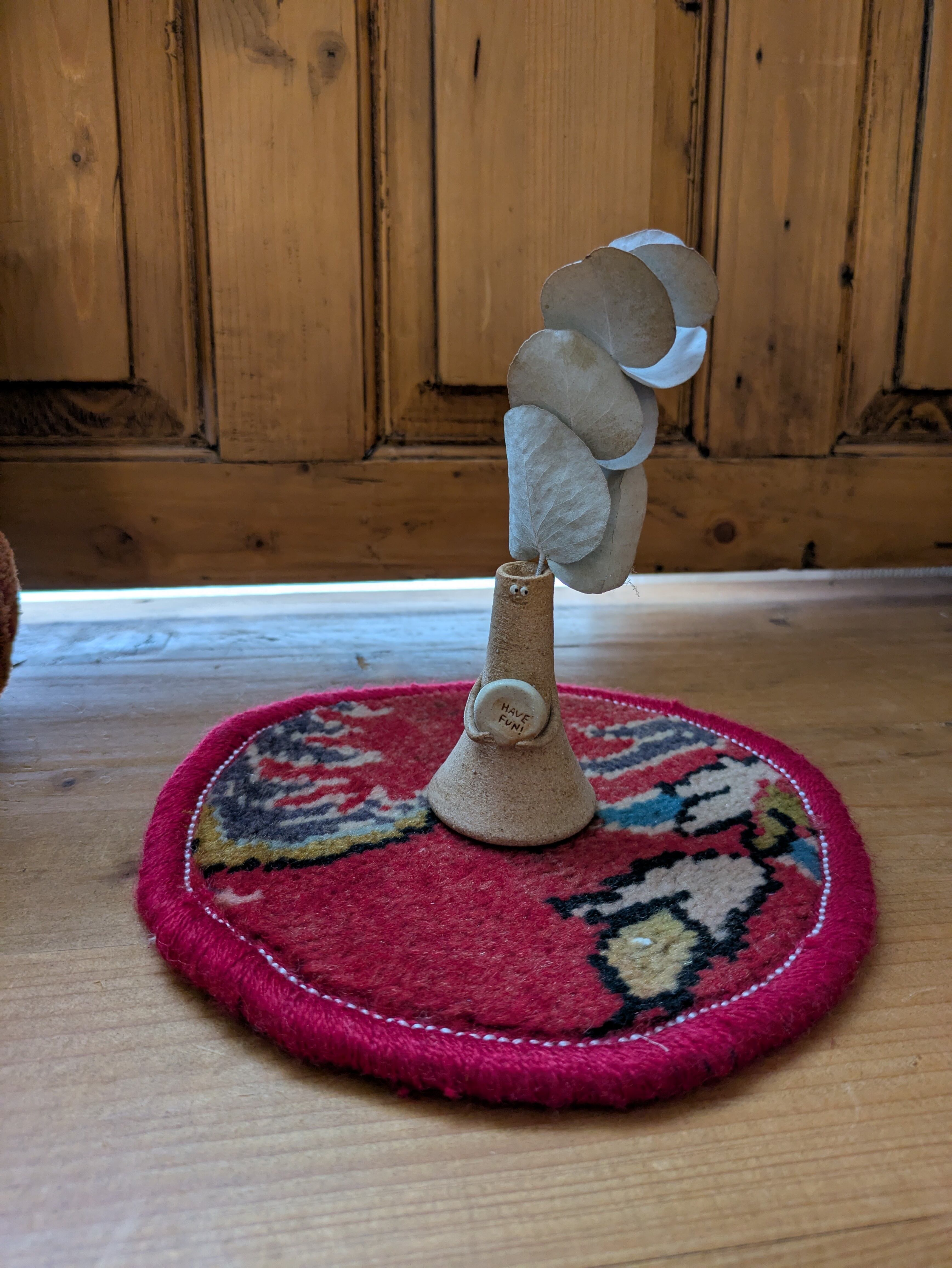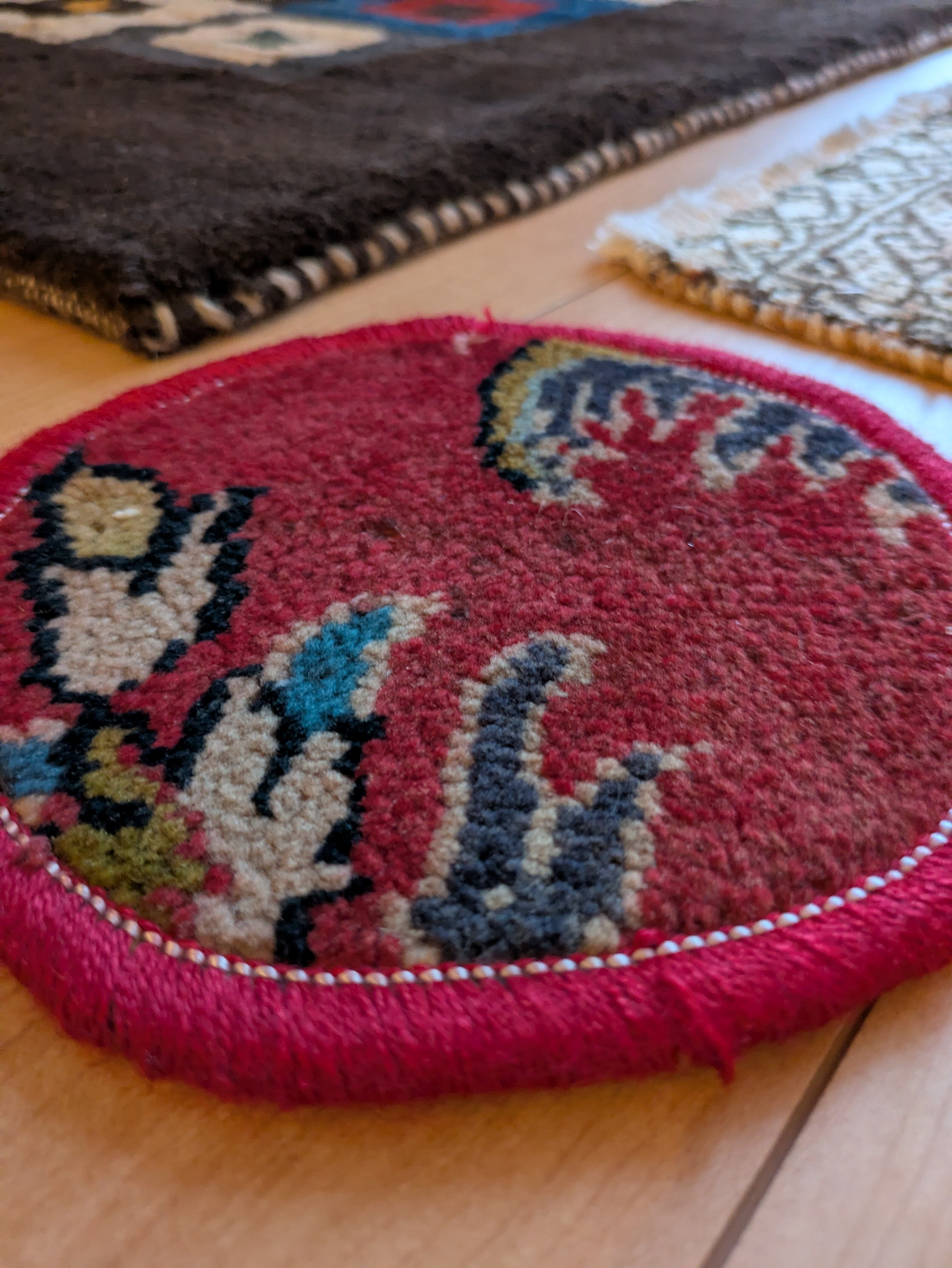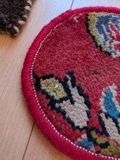 ヴィンテージのトライバルラグをリメイクして作った、小さい丸いラグです。