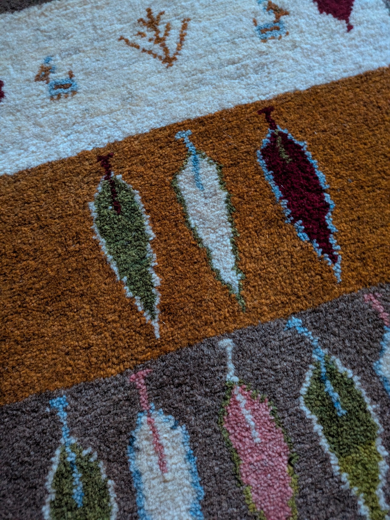 ナチュラルベースにピンクと水色が入っているのも珍しいです。絶妙な色合わせで、オールシーズン敷ける1枚かと思います。