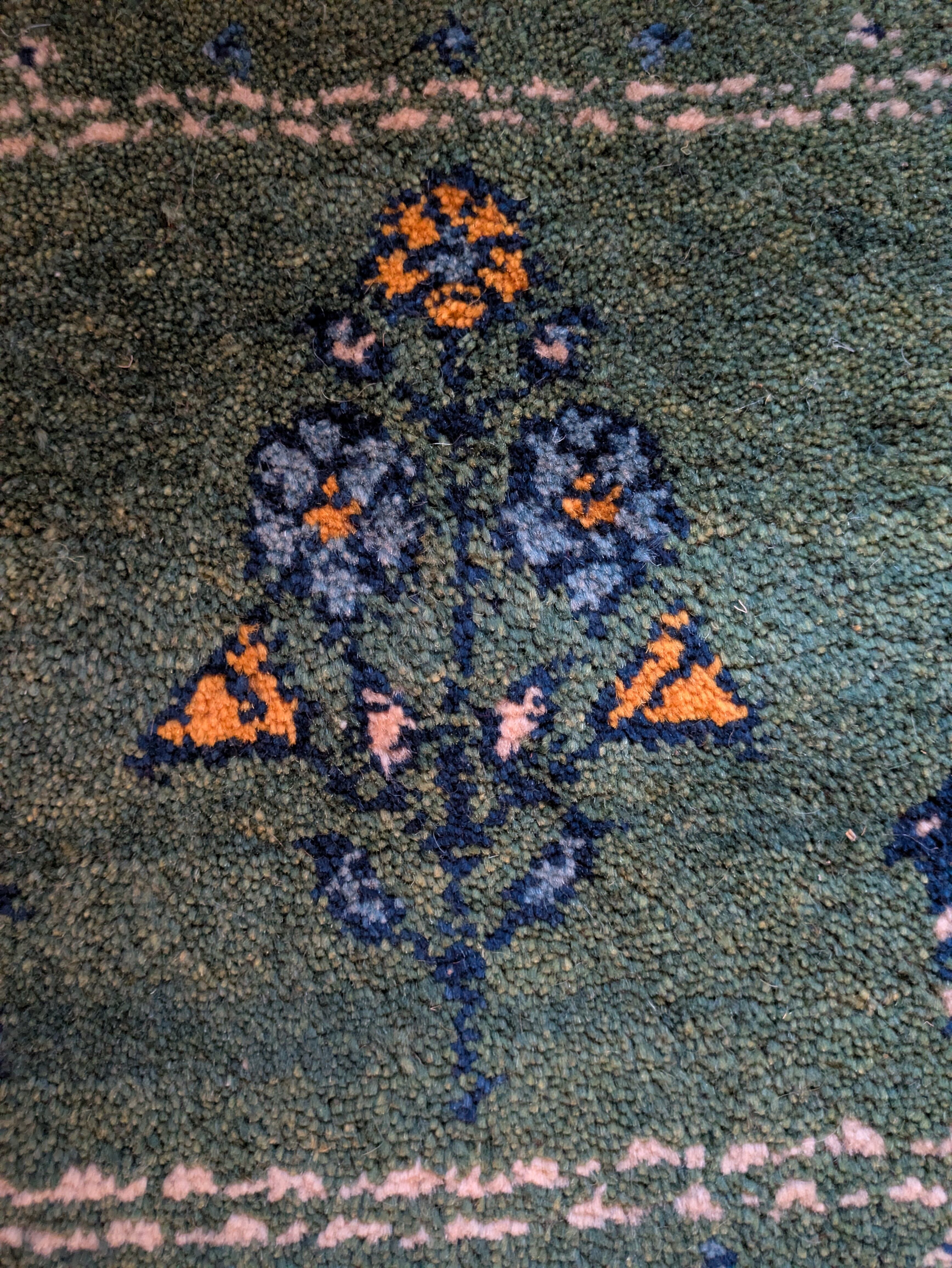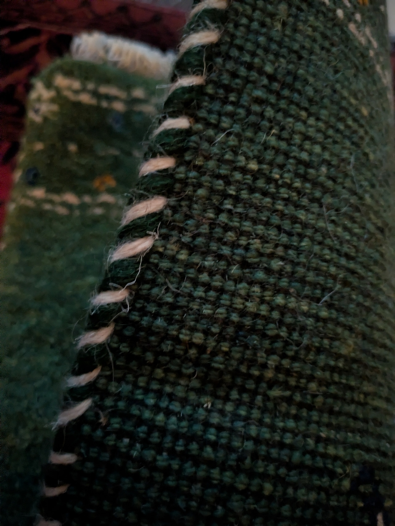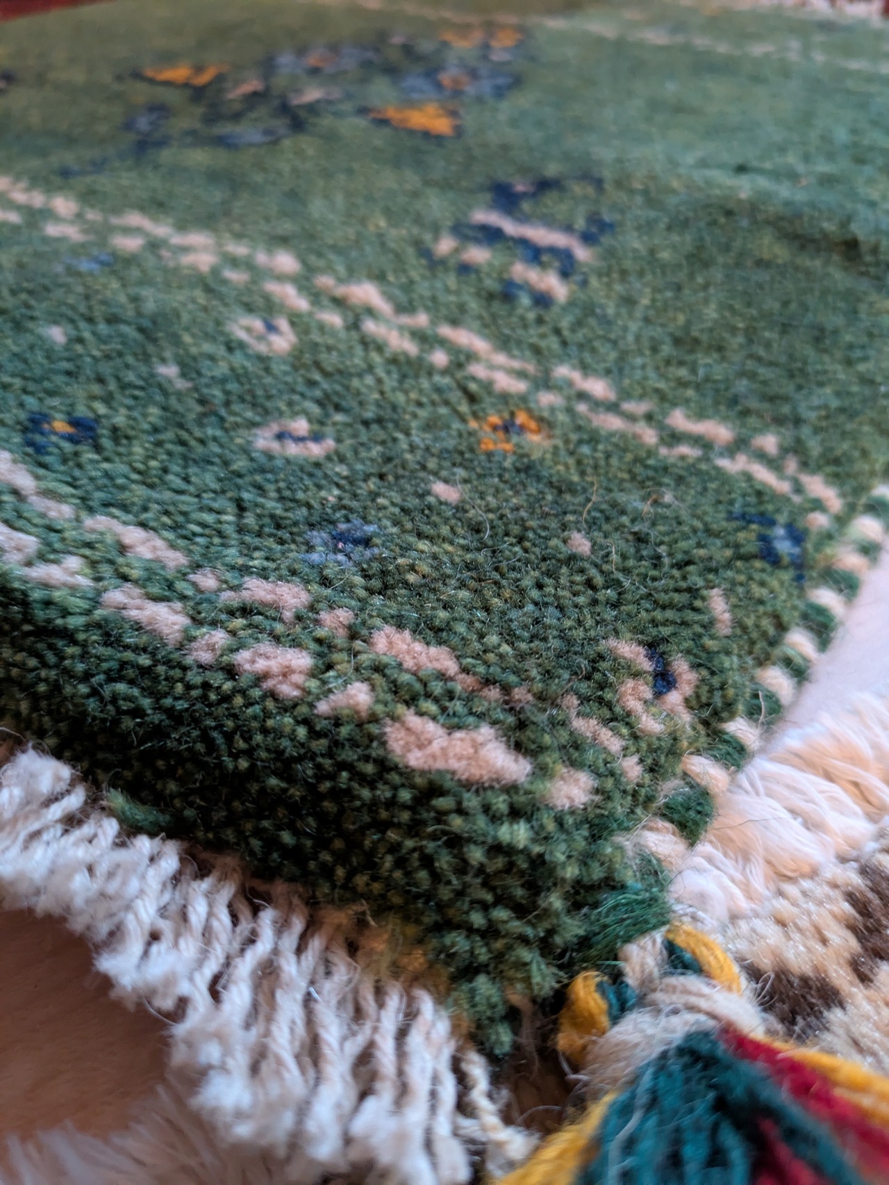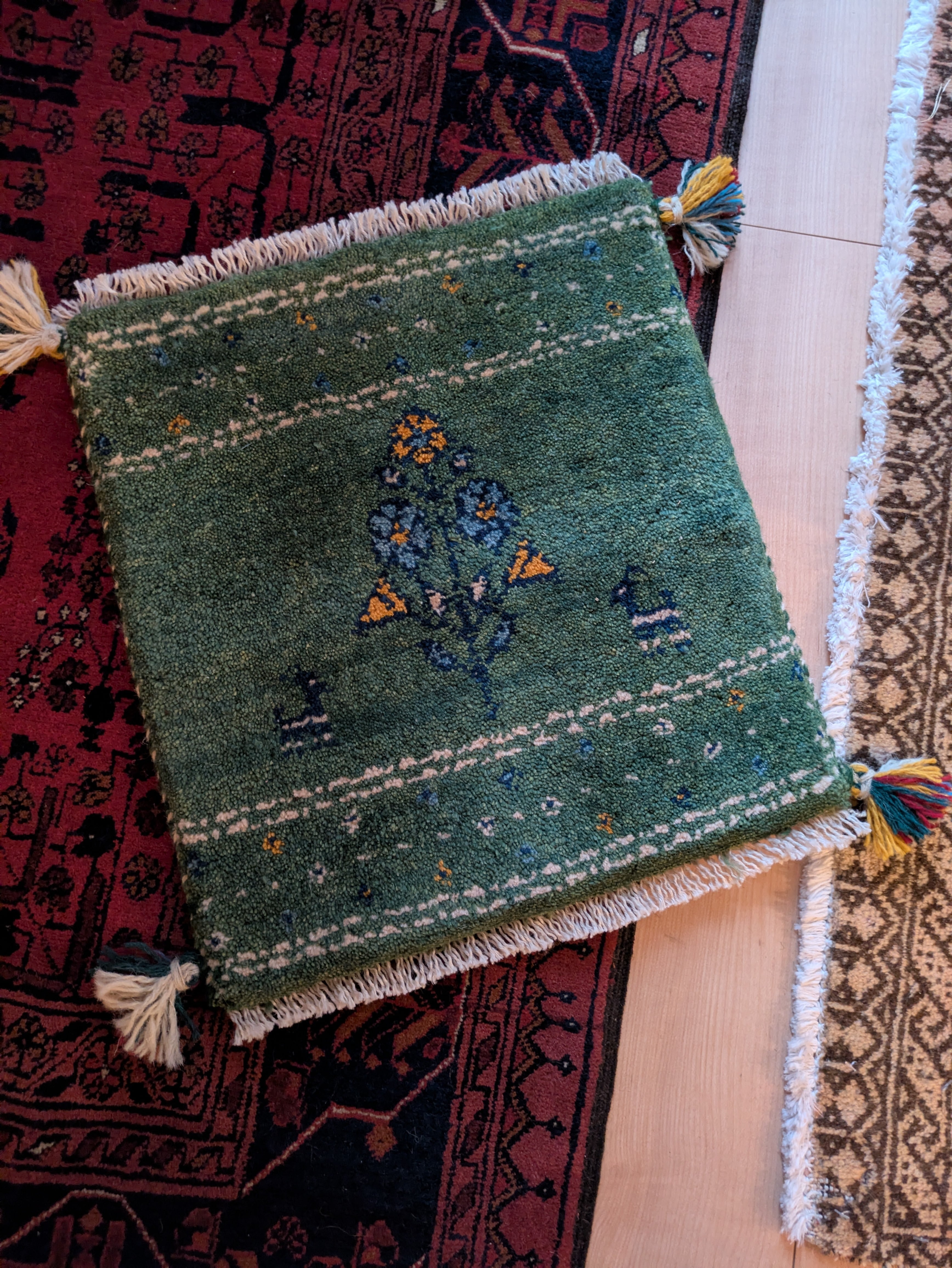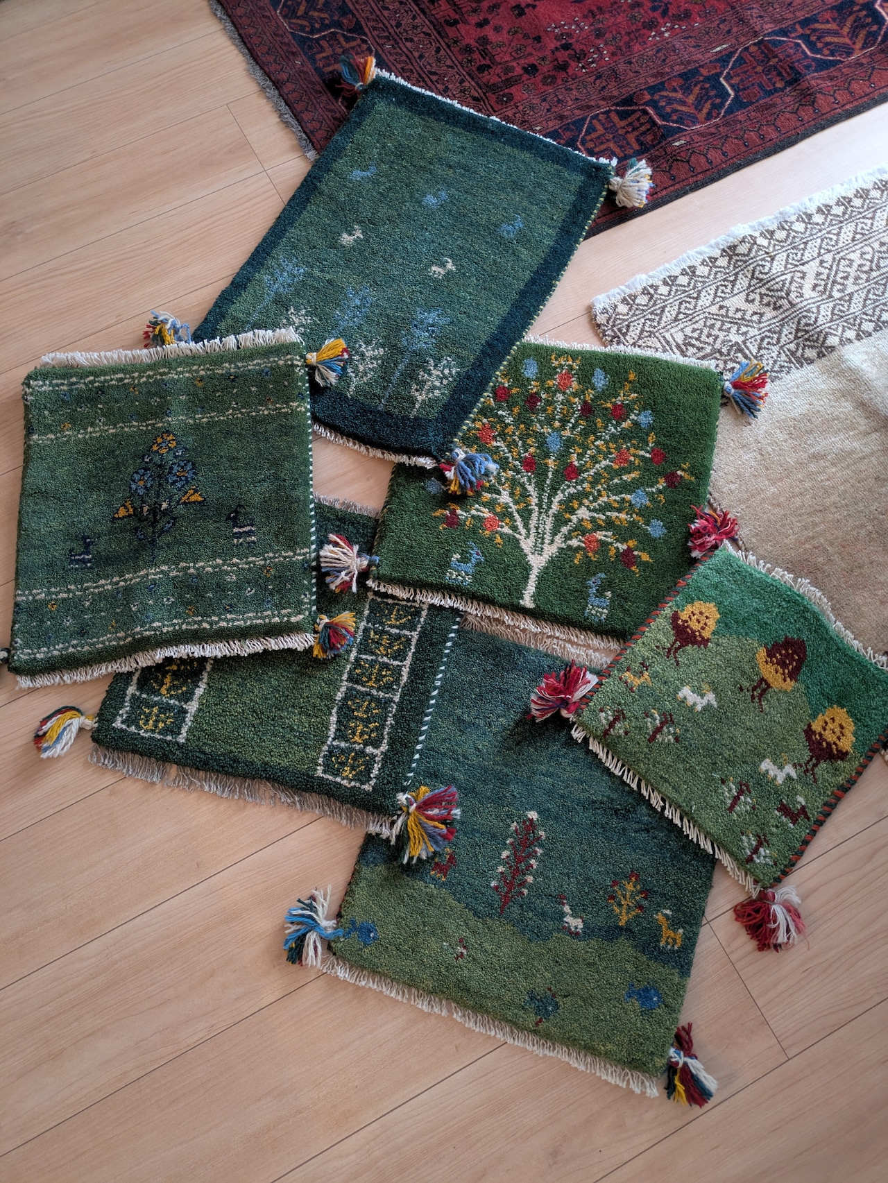 生命の木?お花を中心に向かい合った鹿も2色で織り込まれています。