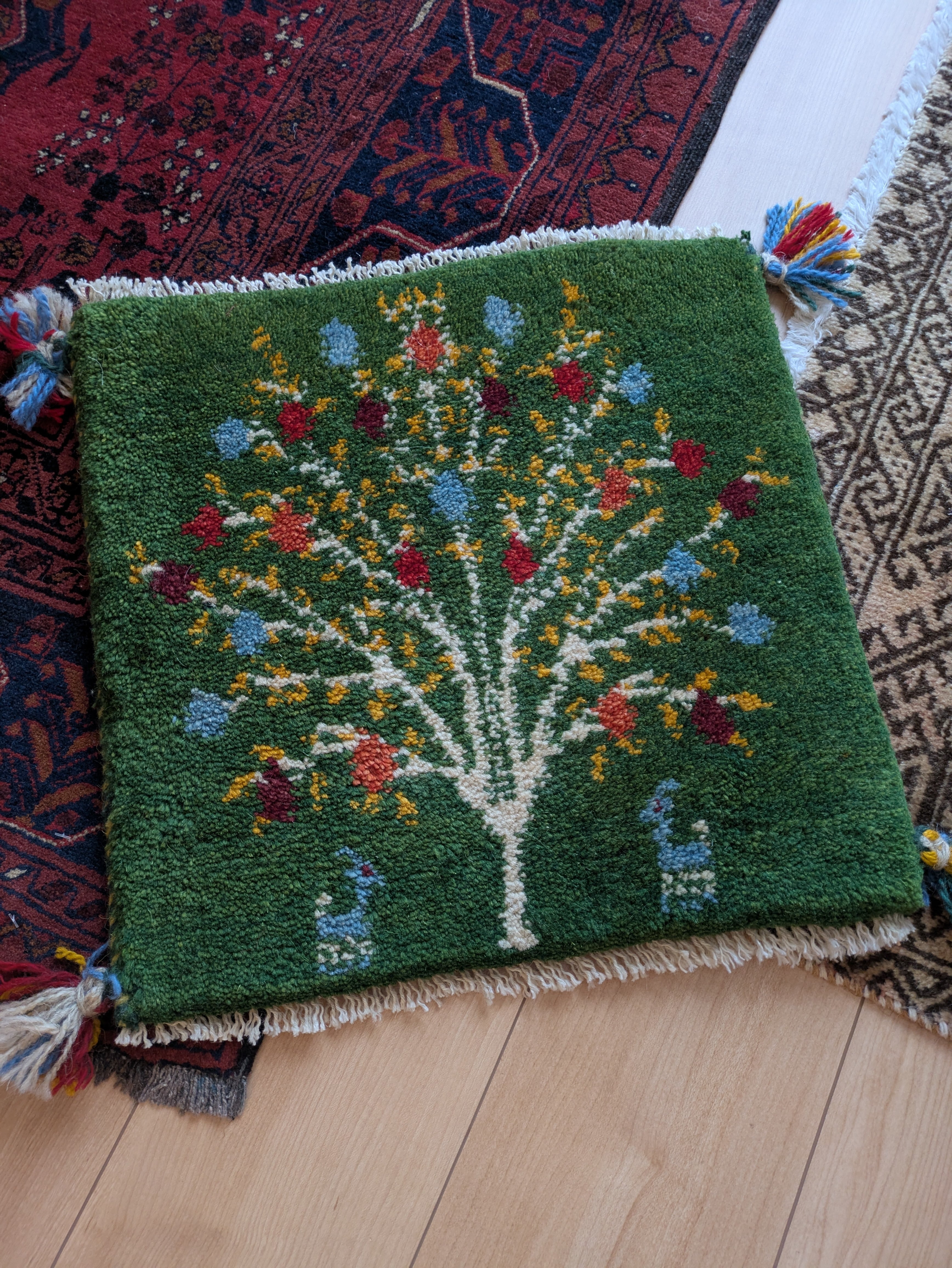 美しいグリーンベースにザクロの木がカラフルに織り込まれています。木を境に向かい合った鹿たちもかわいらしい1枚です。