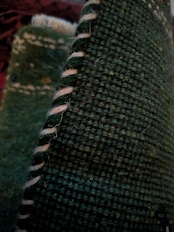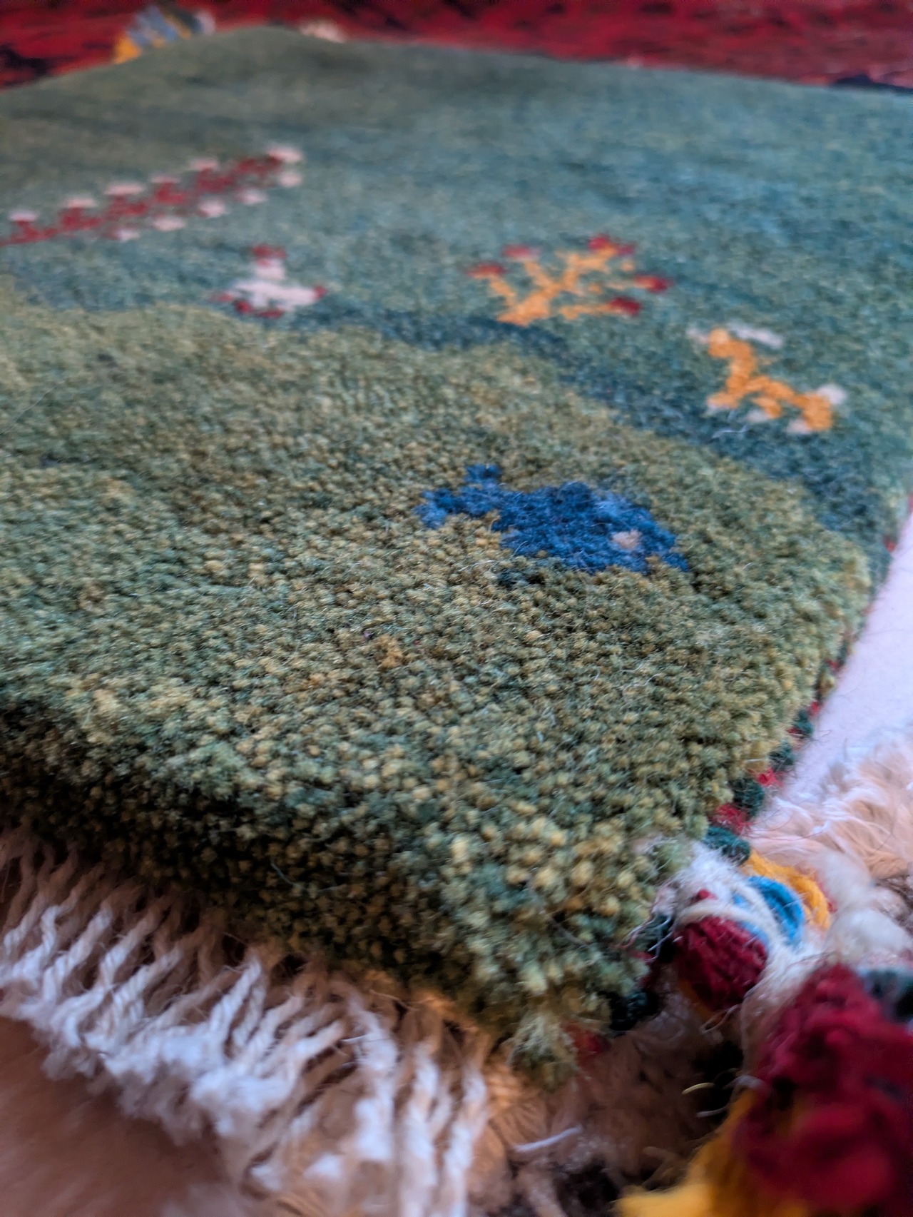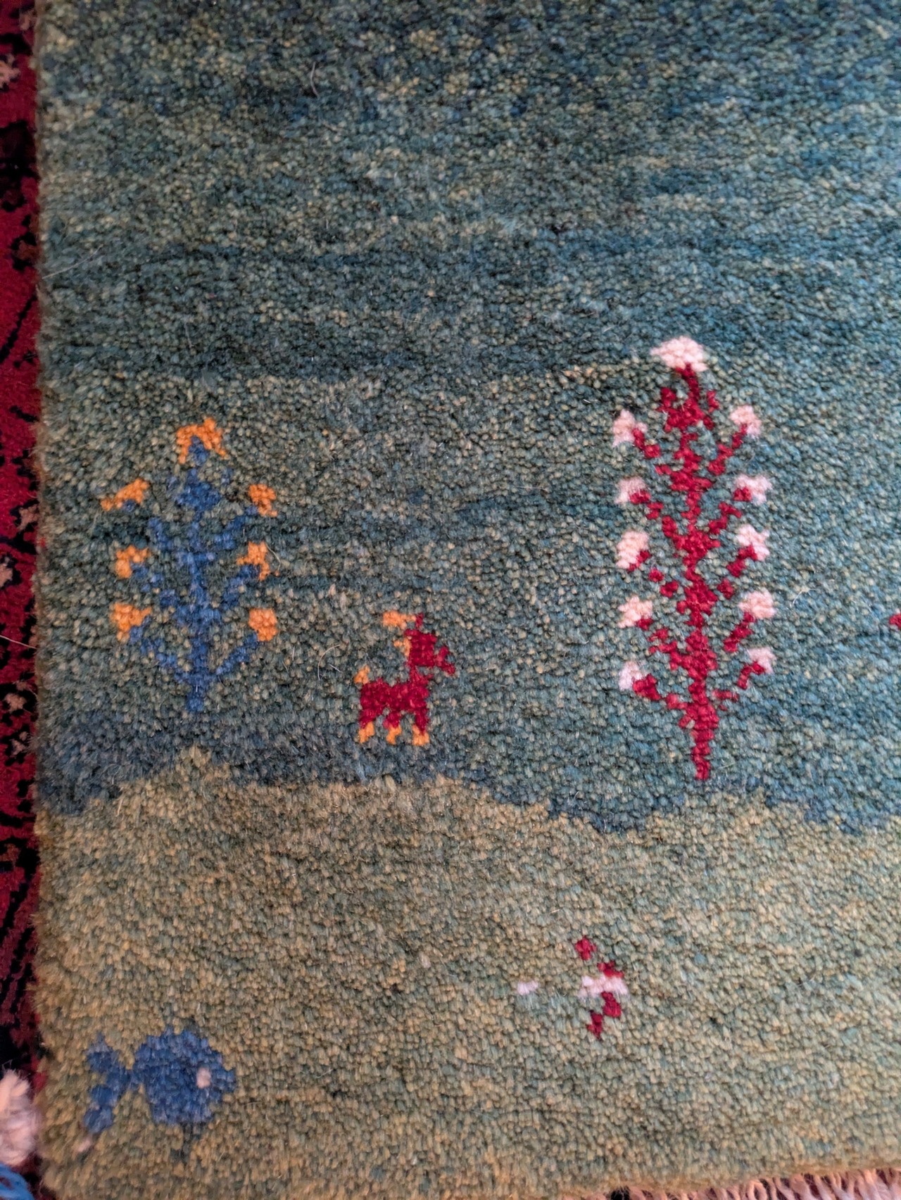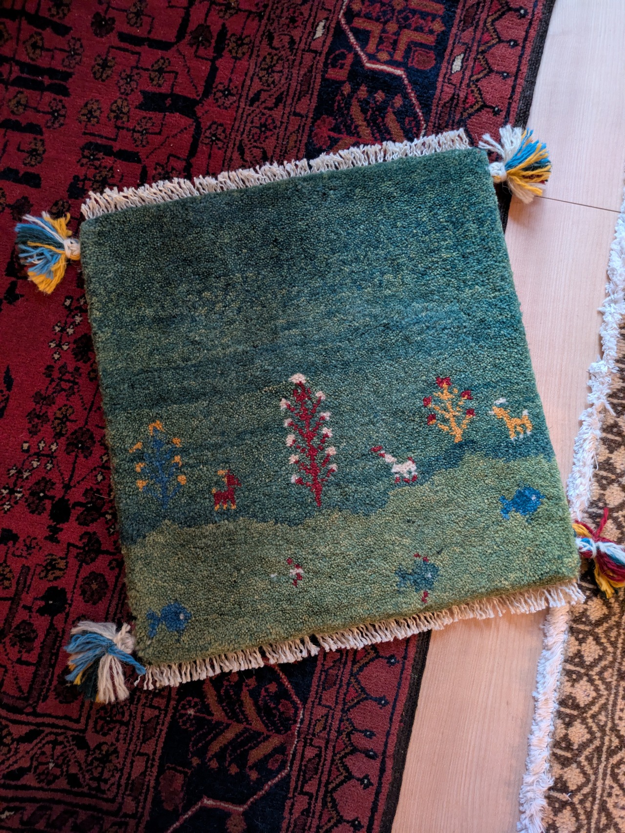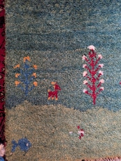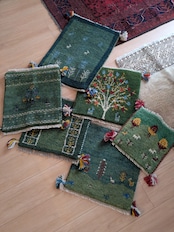 ギャッベには珍しい、お魚柄が織り込まれています。水中と陸をグリーンのグラデーションで美しく表現しています。