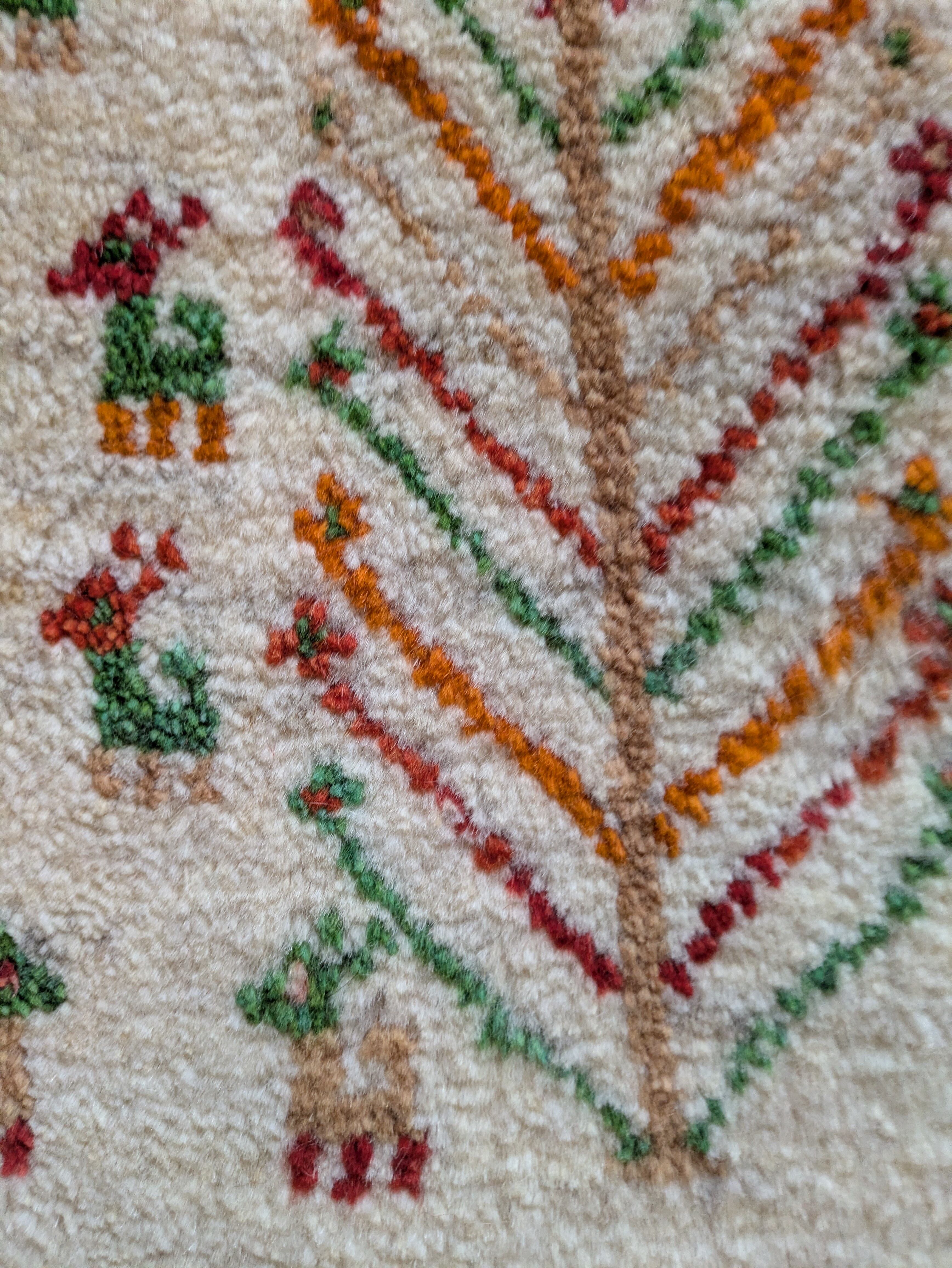 生命の木と鹿柄のナチュラルベースのミニギャッベです。染めていない原毛が柔らかくしなやかです。