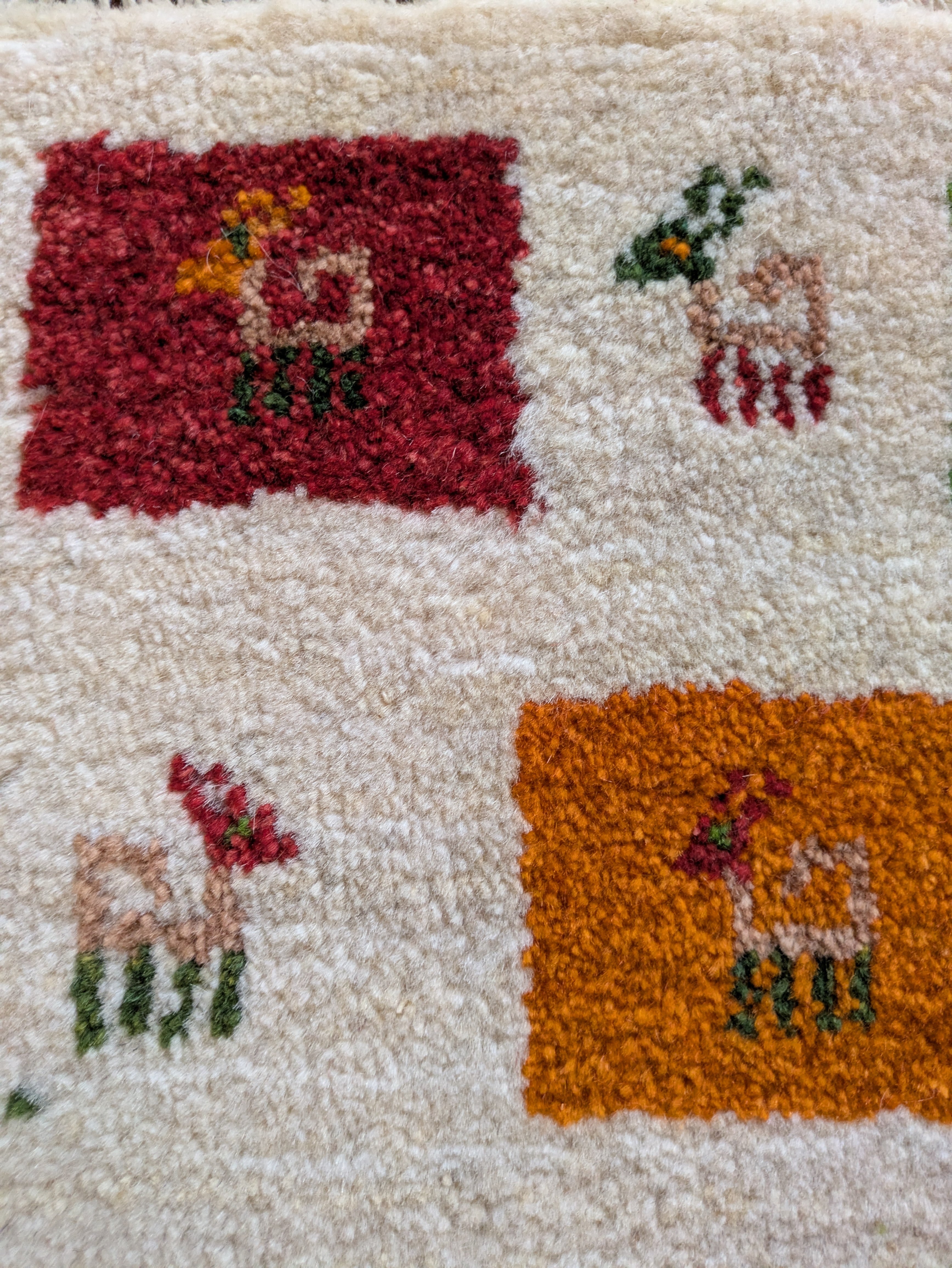 生命の木と鹿柄のナチュラルベースのミニギャッベです。染めていない原毛が柔らかくしなやかです。