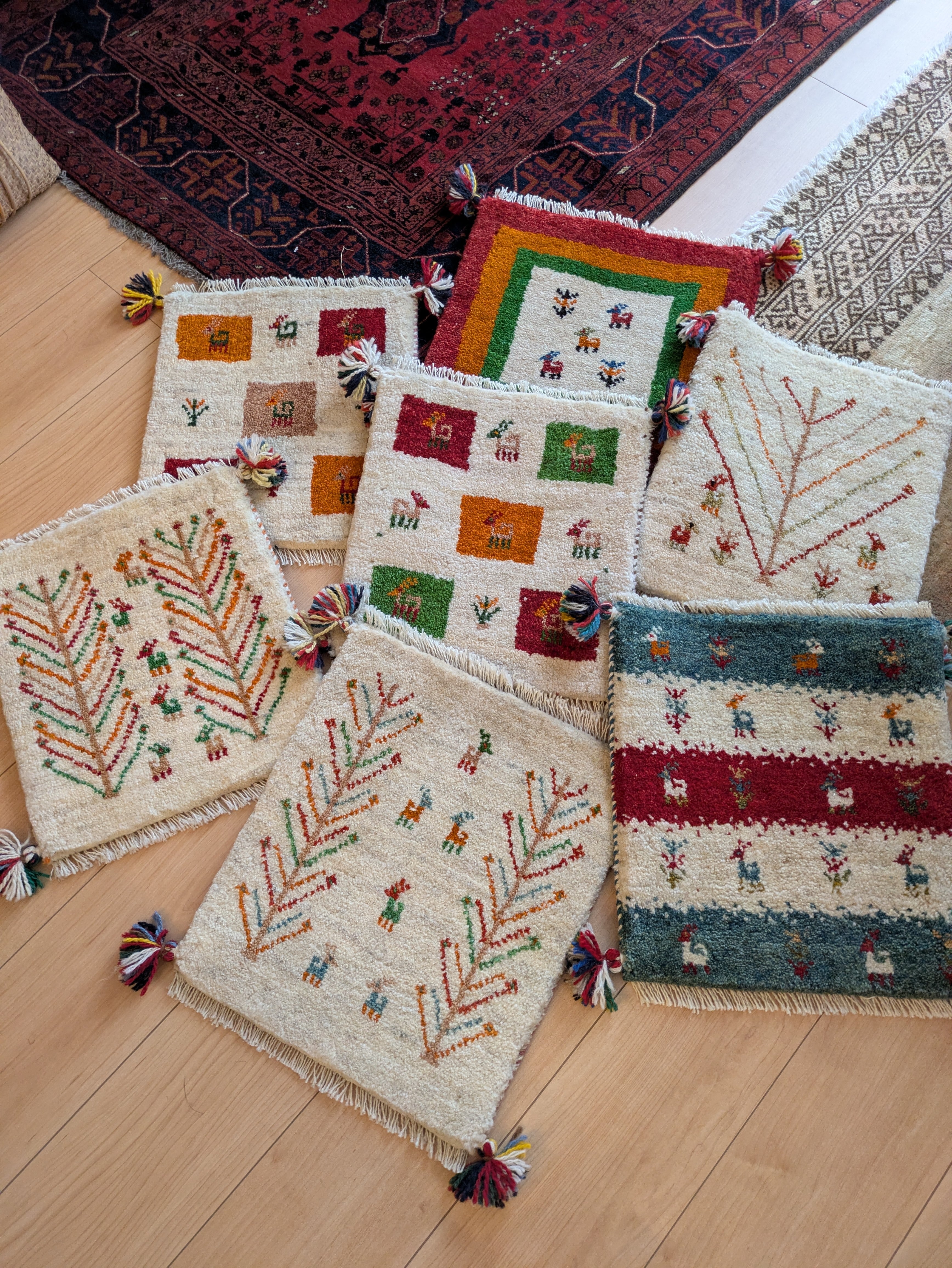 生命の木と鹿柄のナチュラルベースのミニギャッベです。染めていない原毛が柔らかくしなやかです。