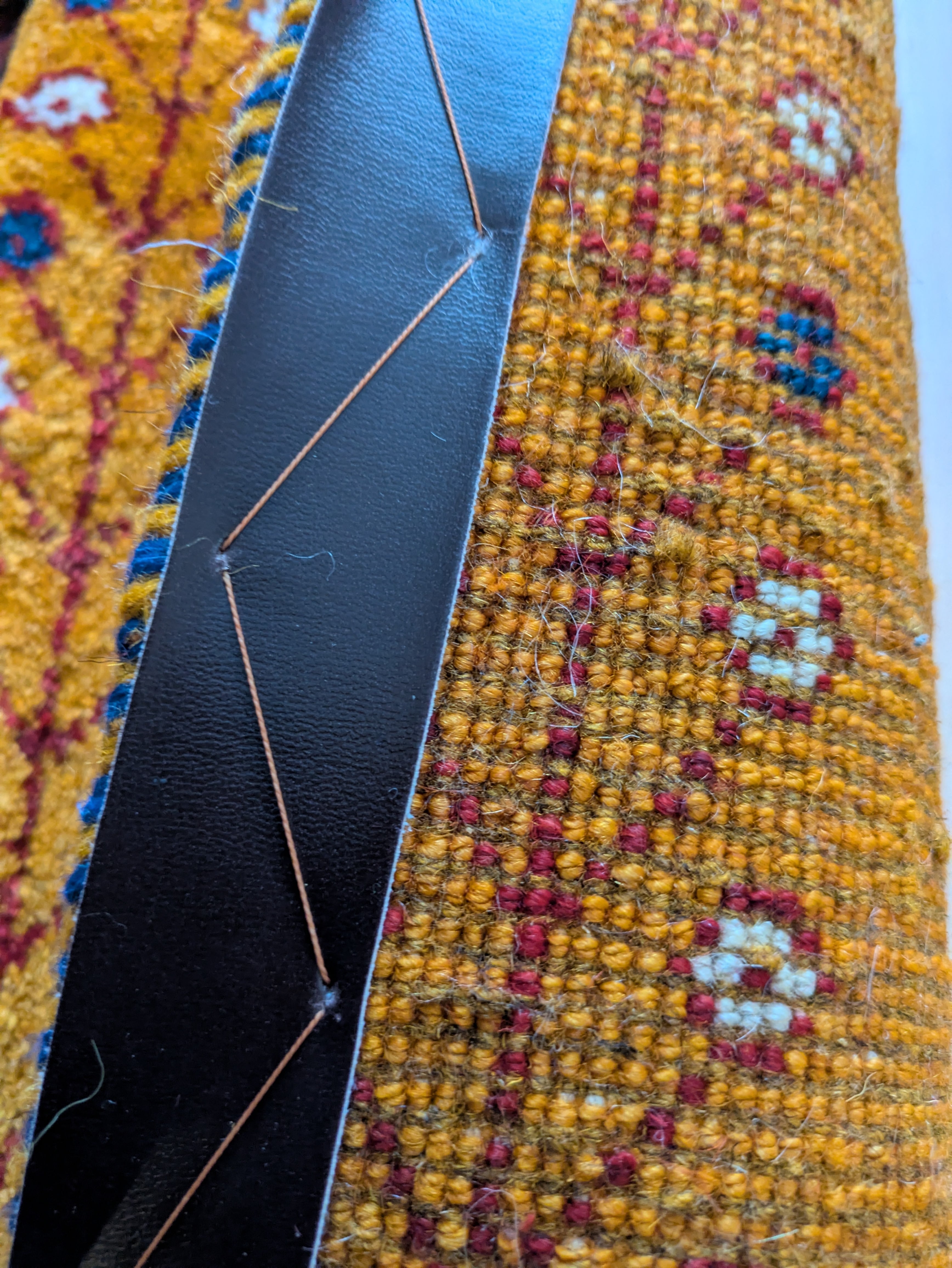 オレンジと藍染の深いブルーが素敵なギャッベです。サイズもいろいろな所に使い回せる、ファーストギャッベにおすすめの大きさです。