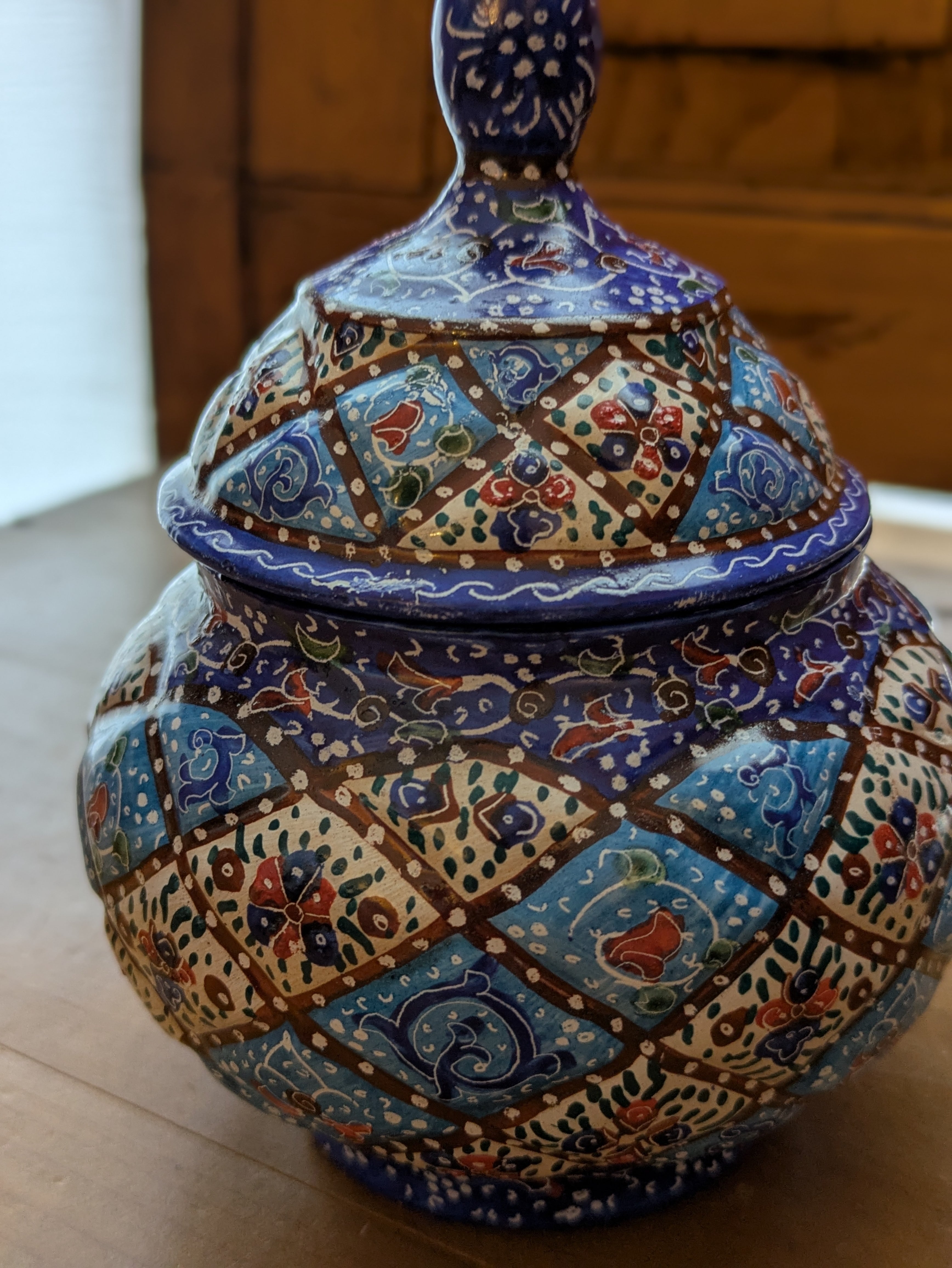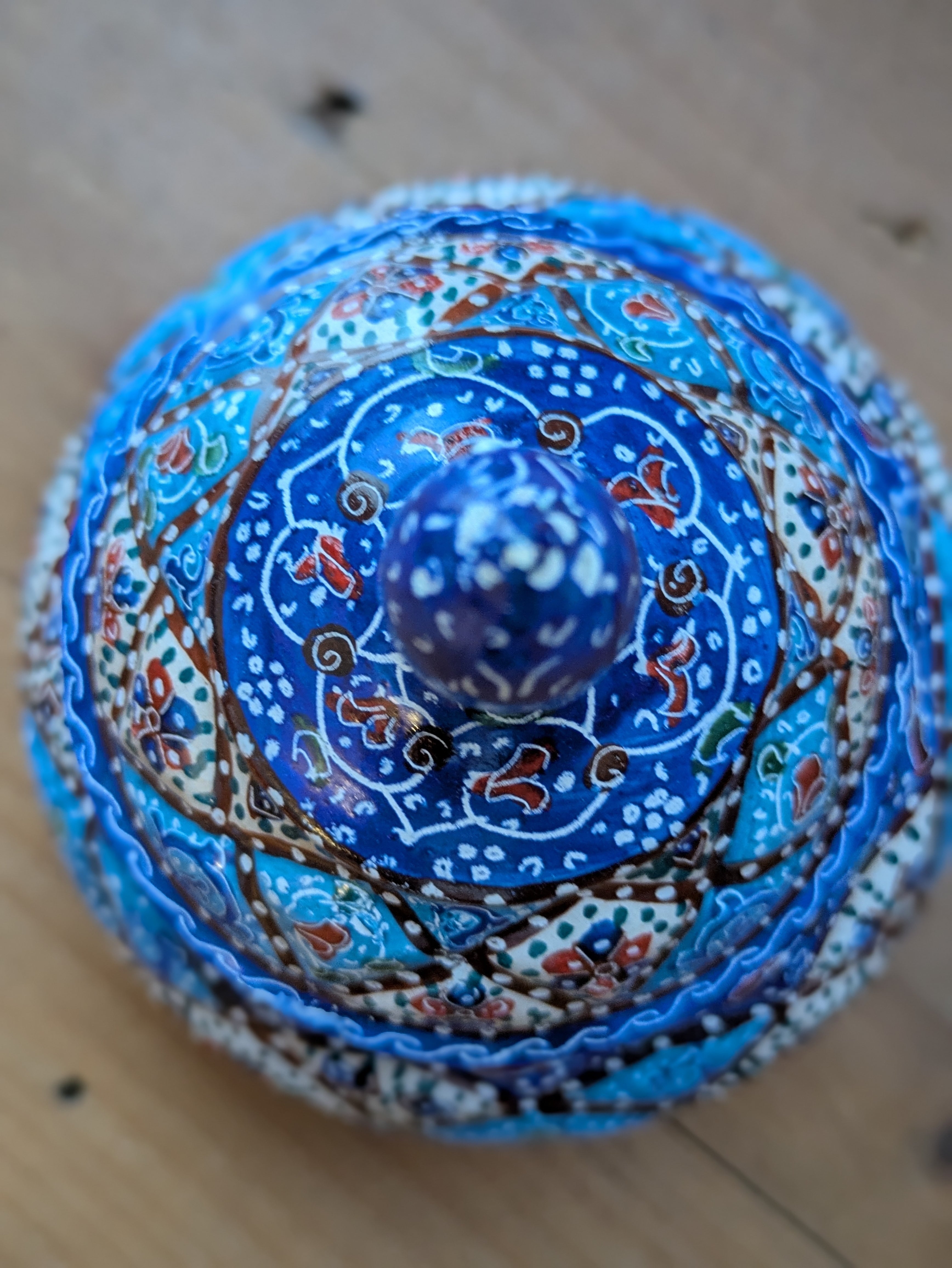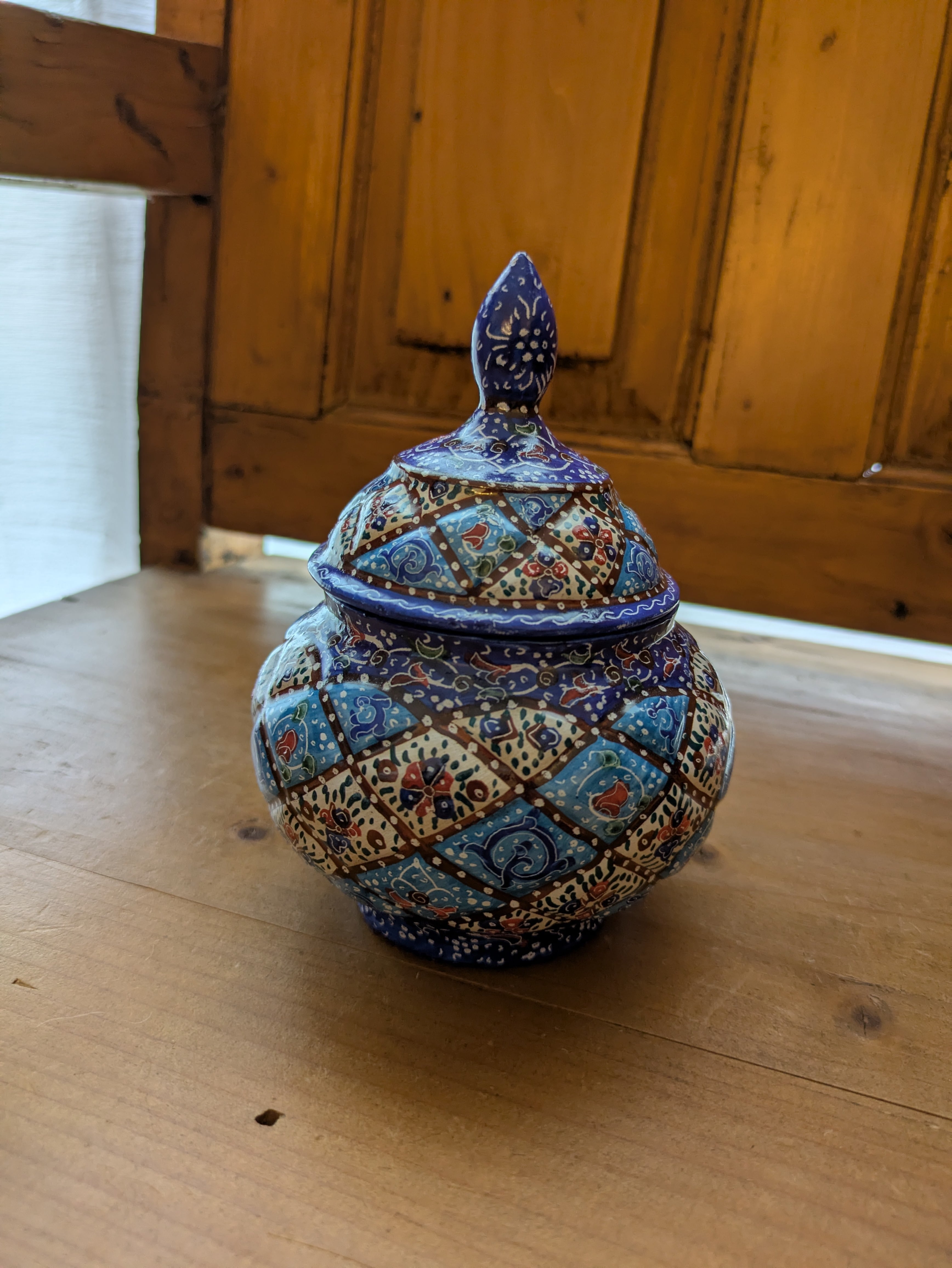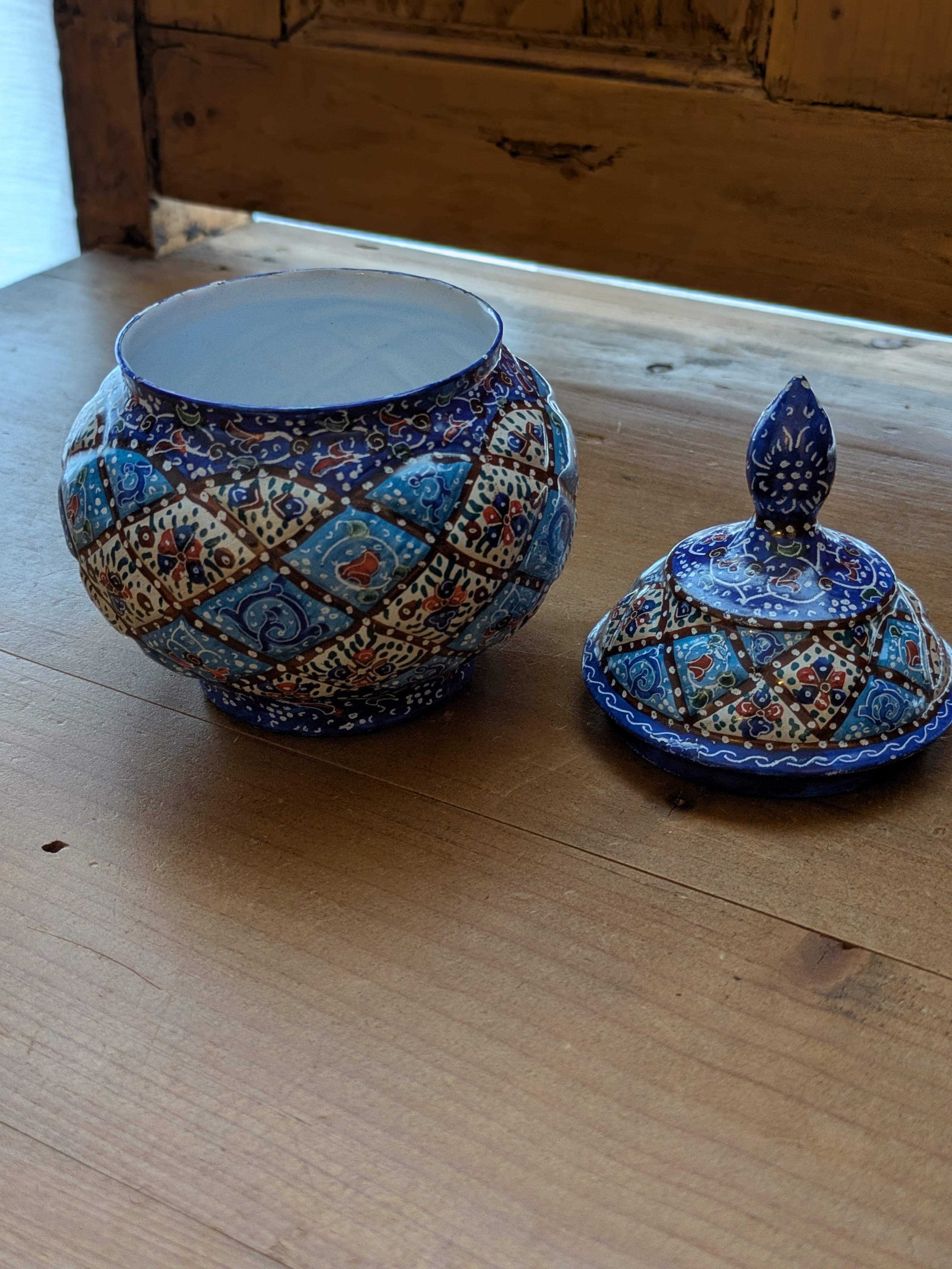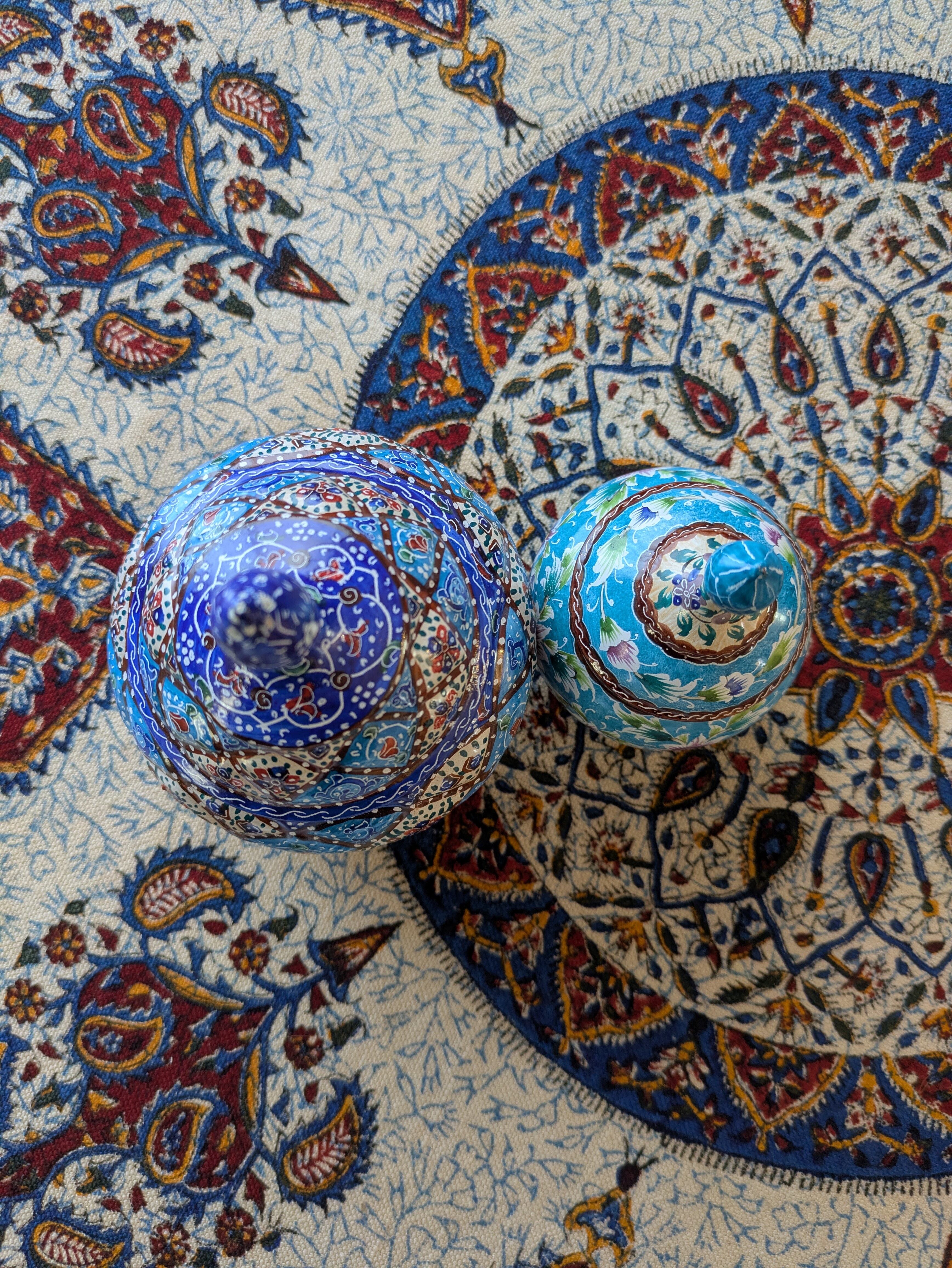 ミーナカーリーとはイランの伝統工芸で、銅で作ったお皿などに釉薬をかけて焼き、さらに手書きでデザインを施して焼き上げたものです。見た目は優雅でとても繊細ですが、丈夫で割れたり傷ついたりしづらく、食洗機や火にかけたりしても色の変化はしづらいそうです。