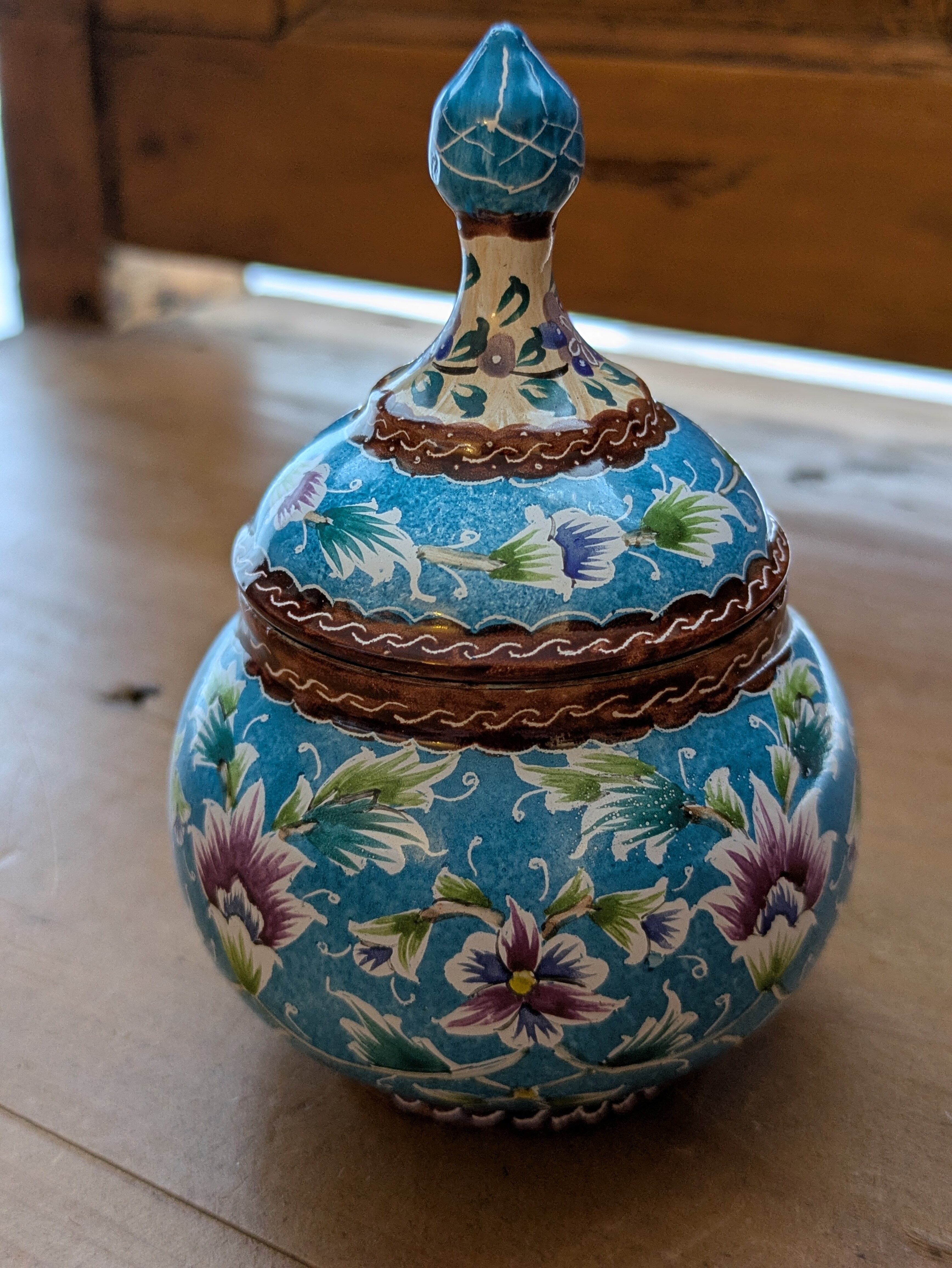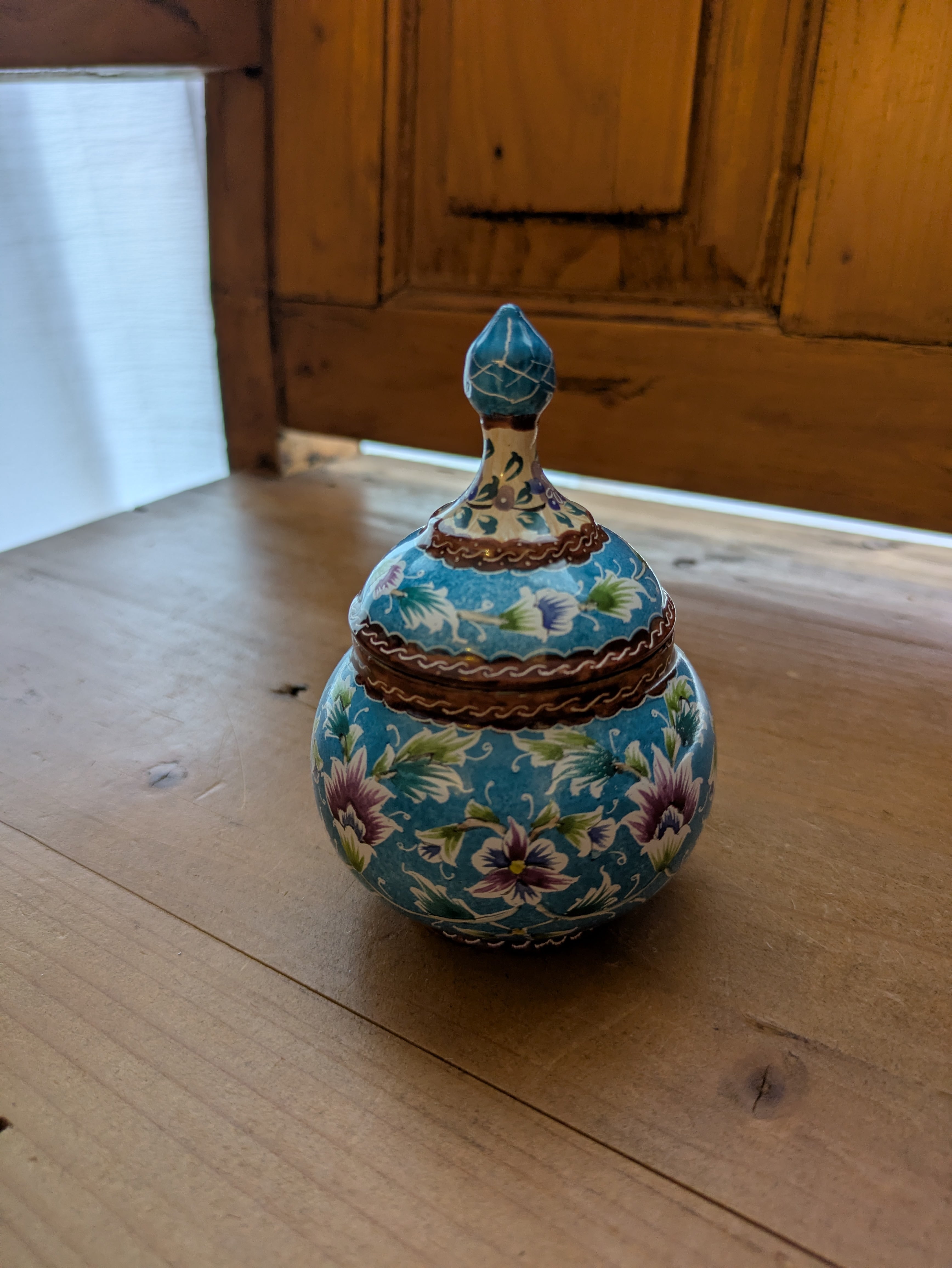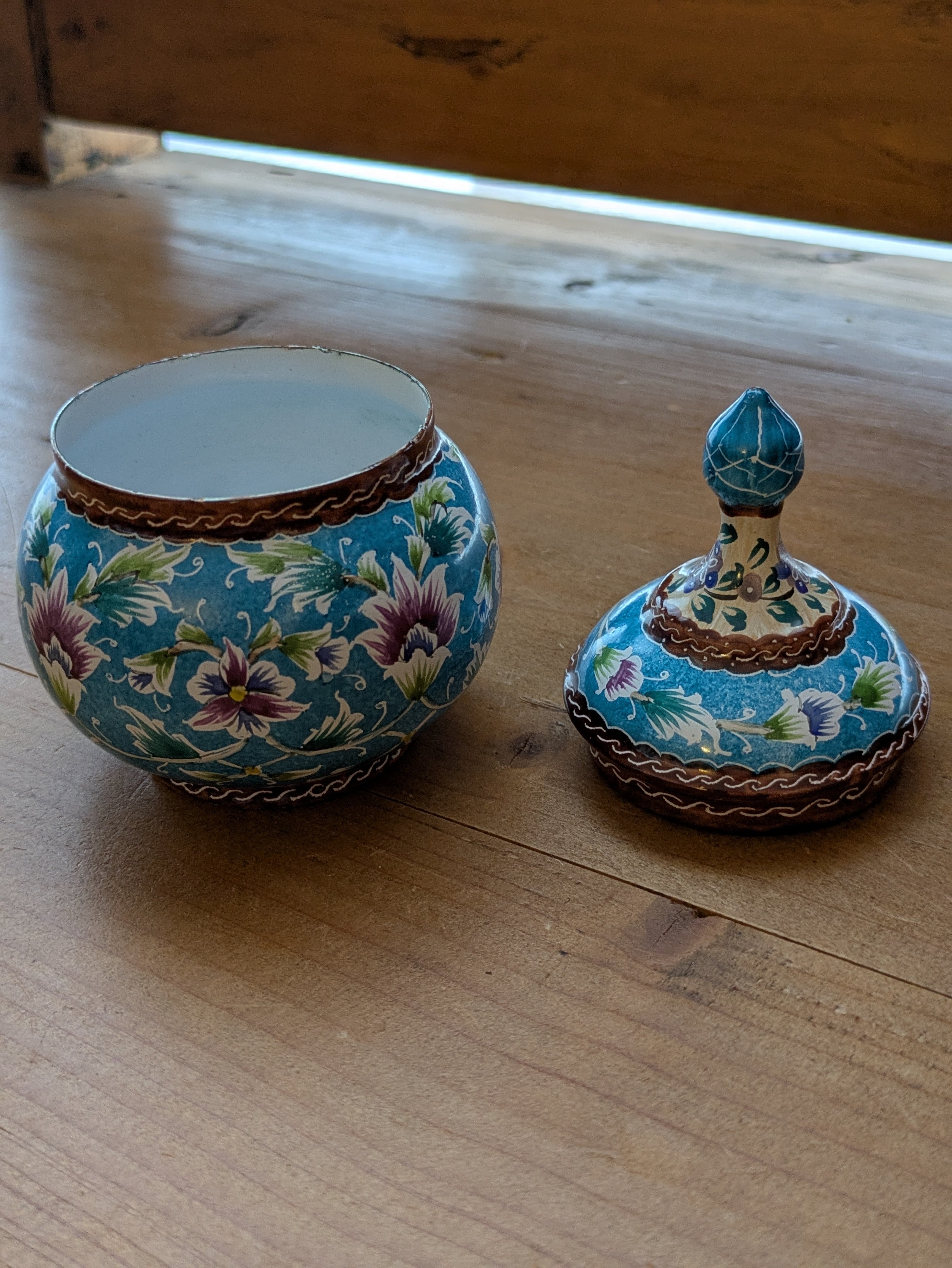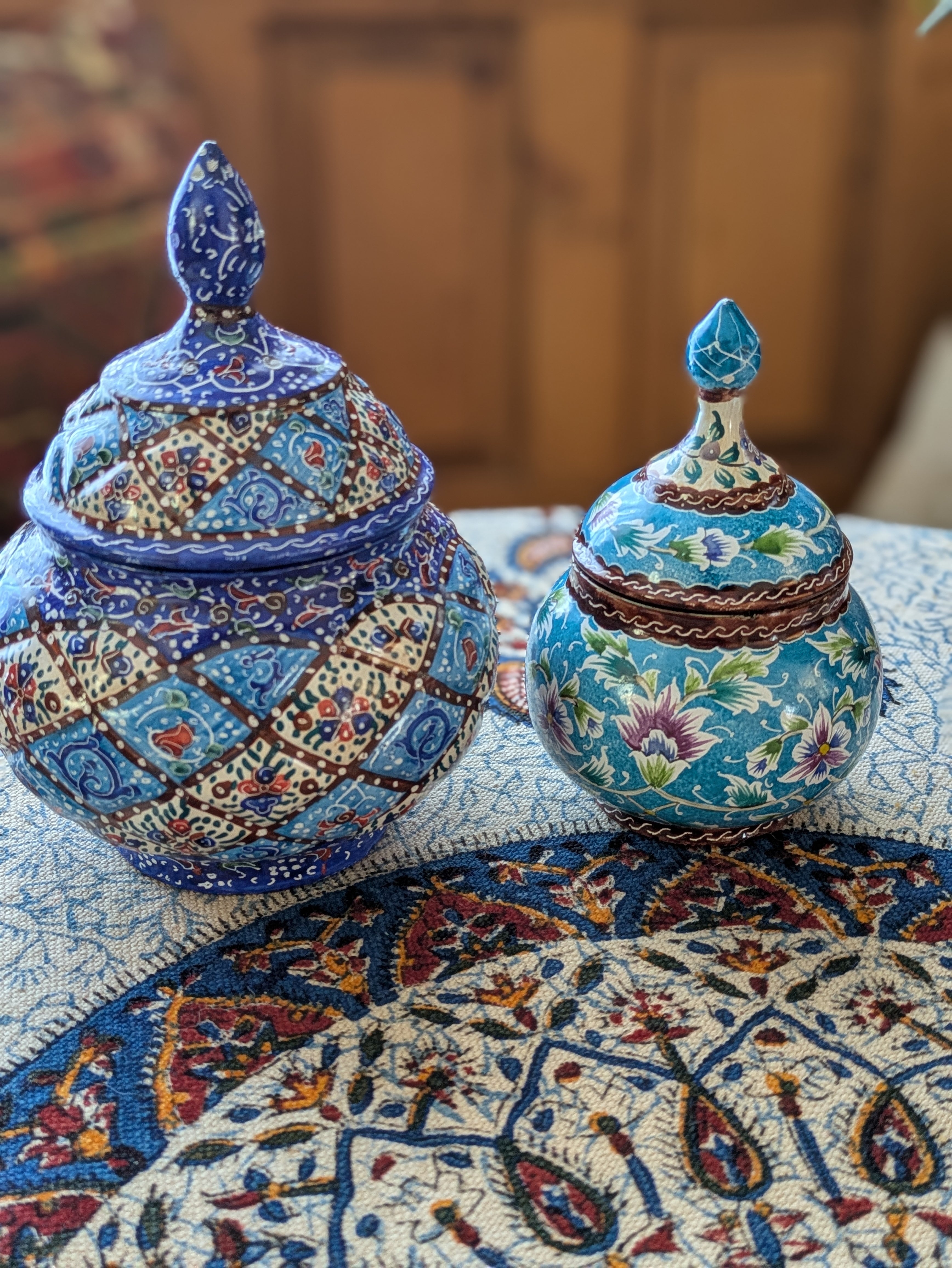 ミーナカーリーとはイランの伝統工芸で、銅で作ったお皿などに釉薬をかけて焼き、さらに手書きでデザインを施して焼き上げたものです。見た目は優雅でとても繊細ですが、丈夫で割れたり傷ついたりしづらく、食洗機や火にかけたりしても色の変化はしづらいそうです。