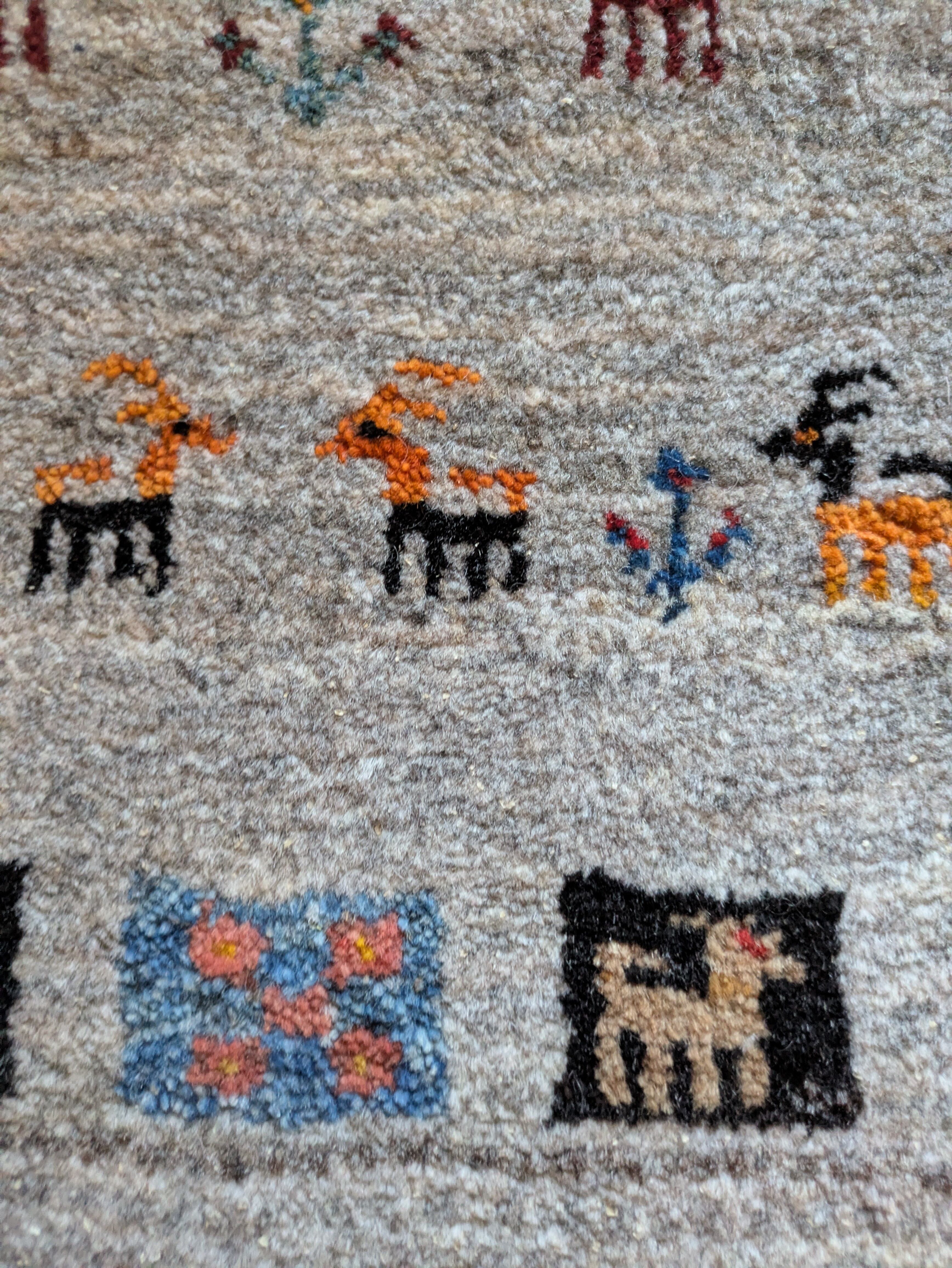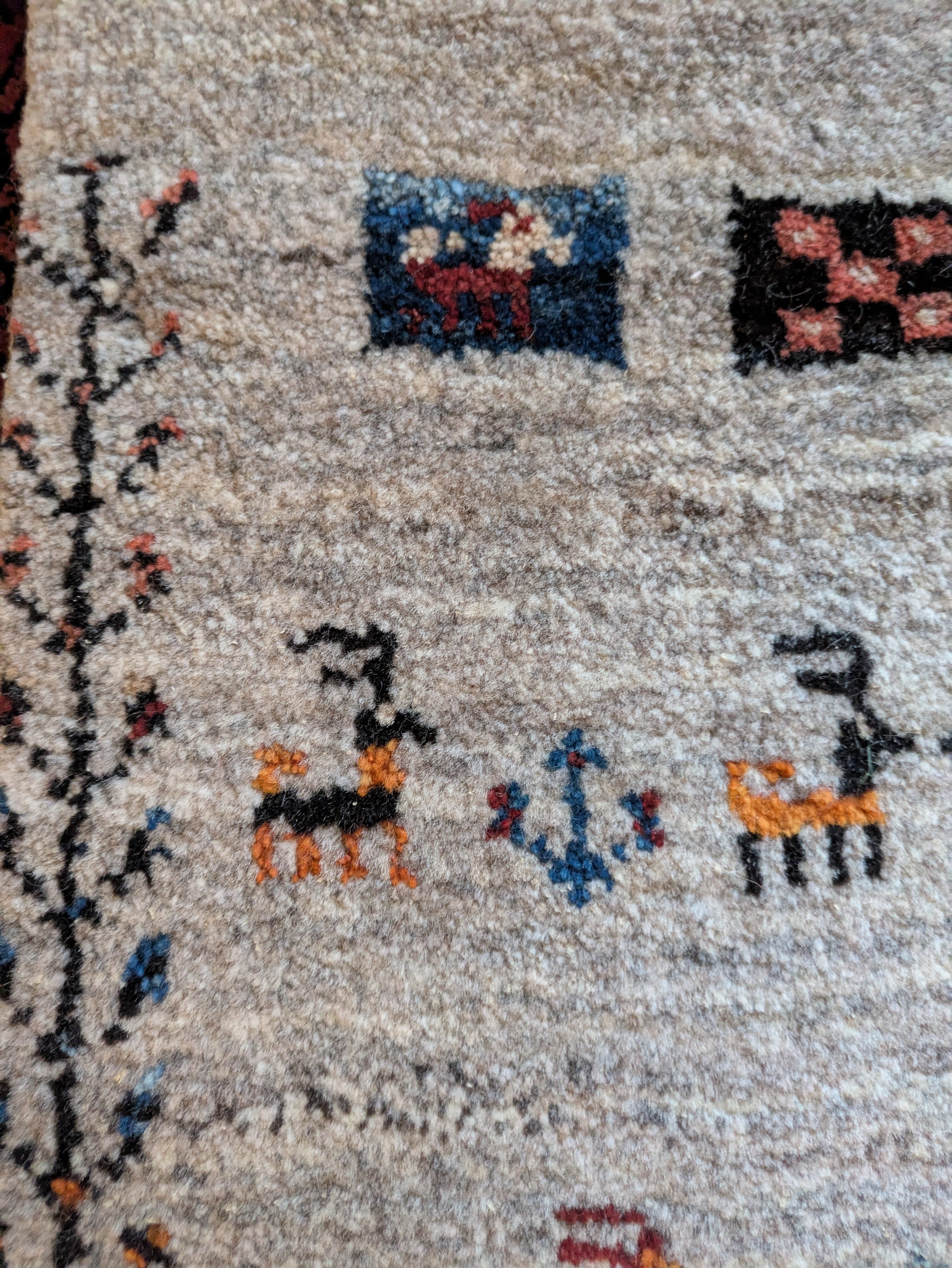 グレーのナチュラルベースに鹿、生命の木、そして少し珍しい窓のような四角いモチーフも織り込まれています。窓からたくさんの幸せが入ってくるようにという願いが込められた柄です。
