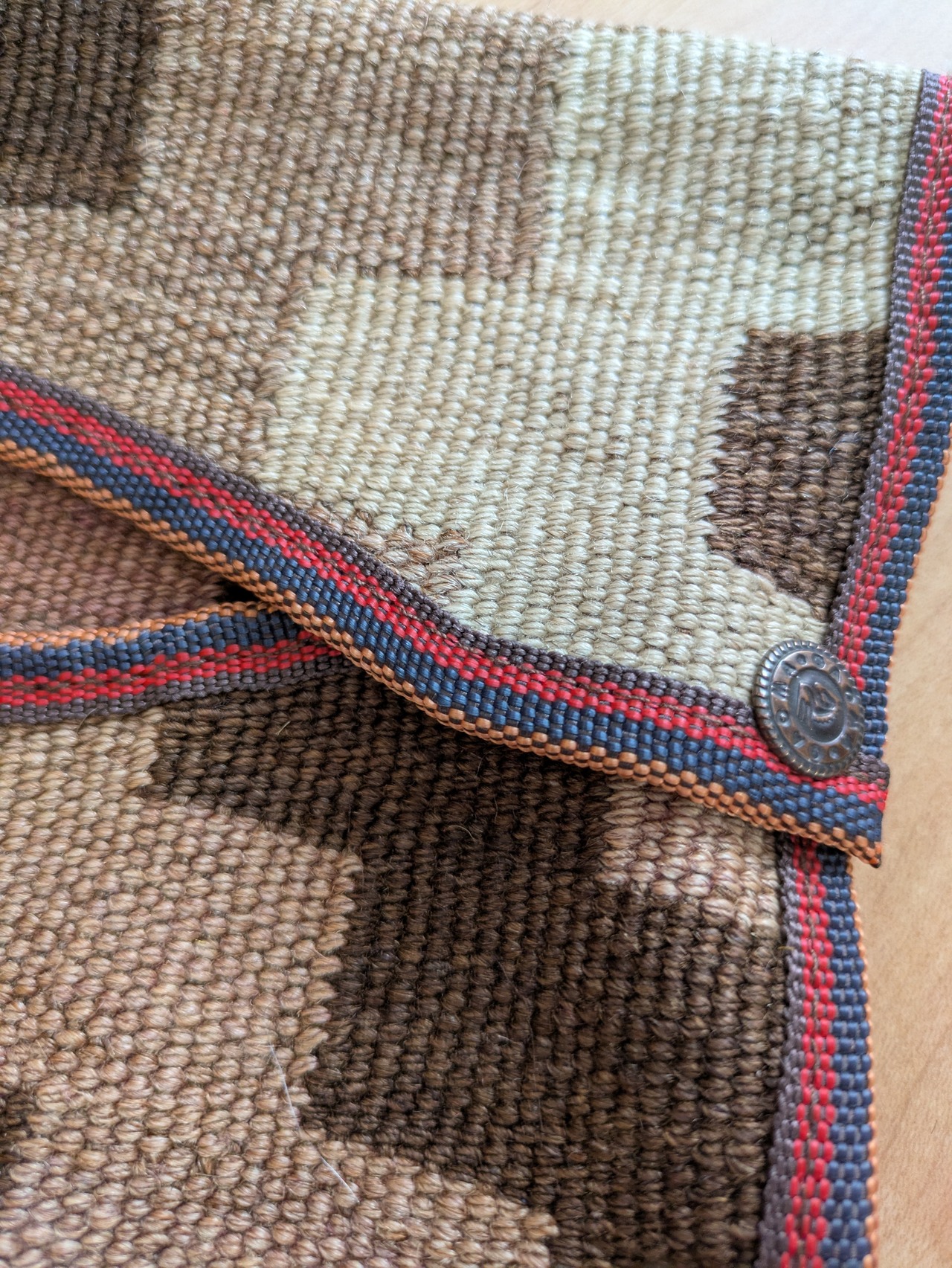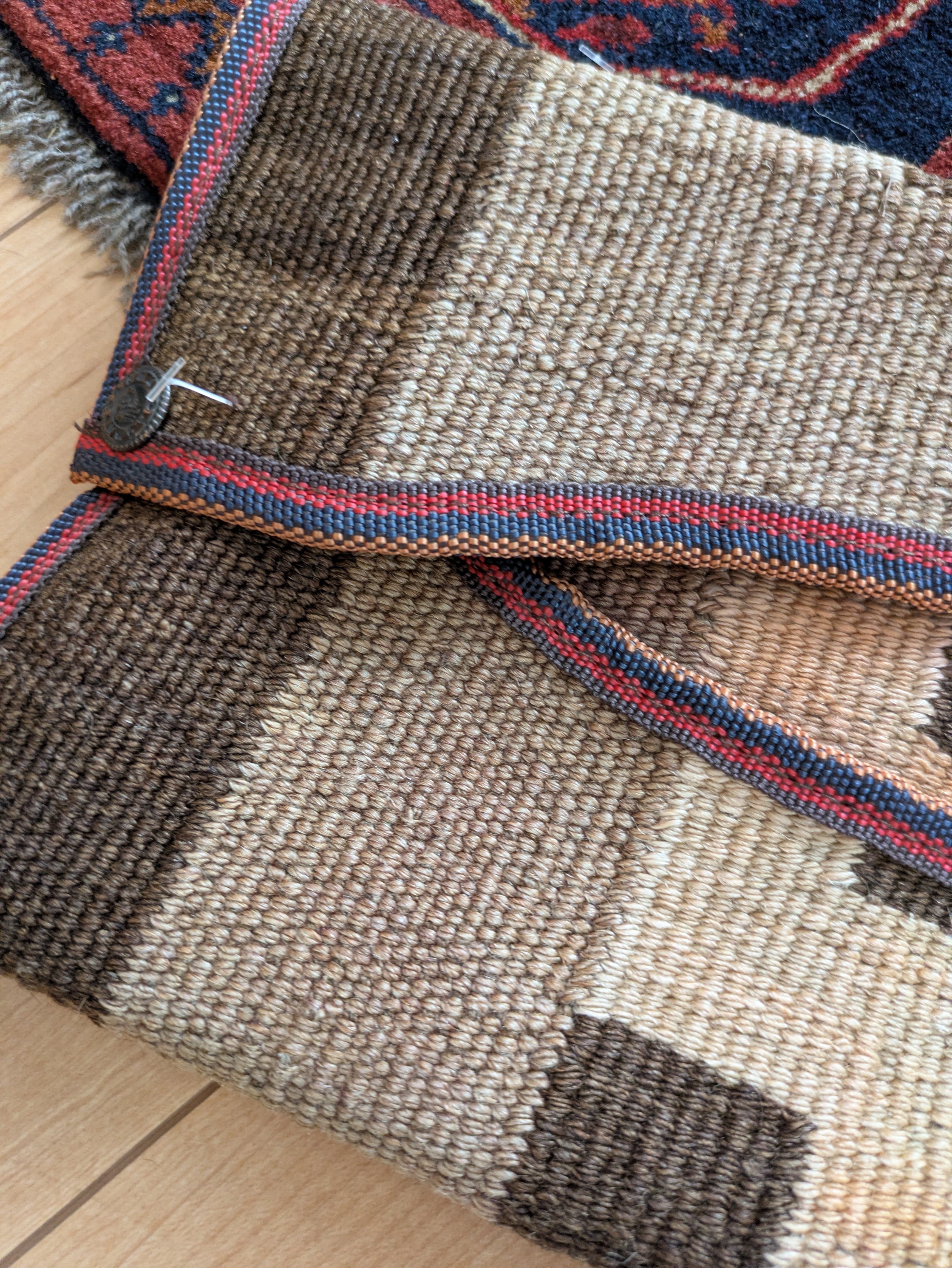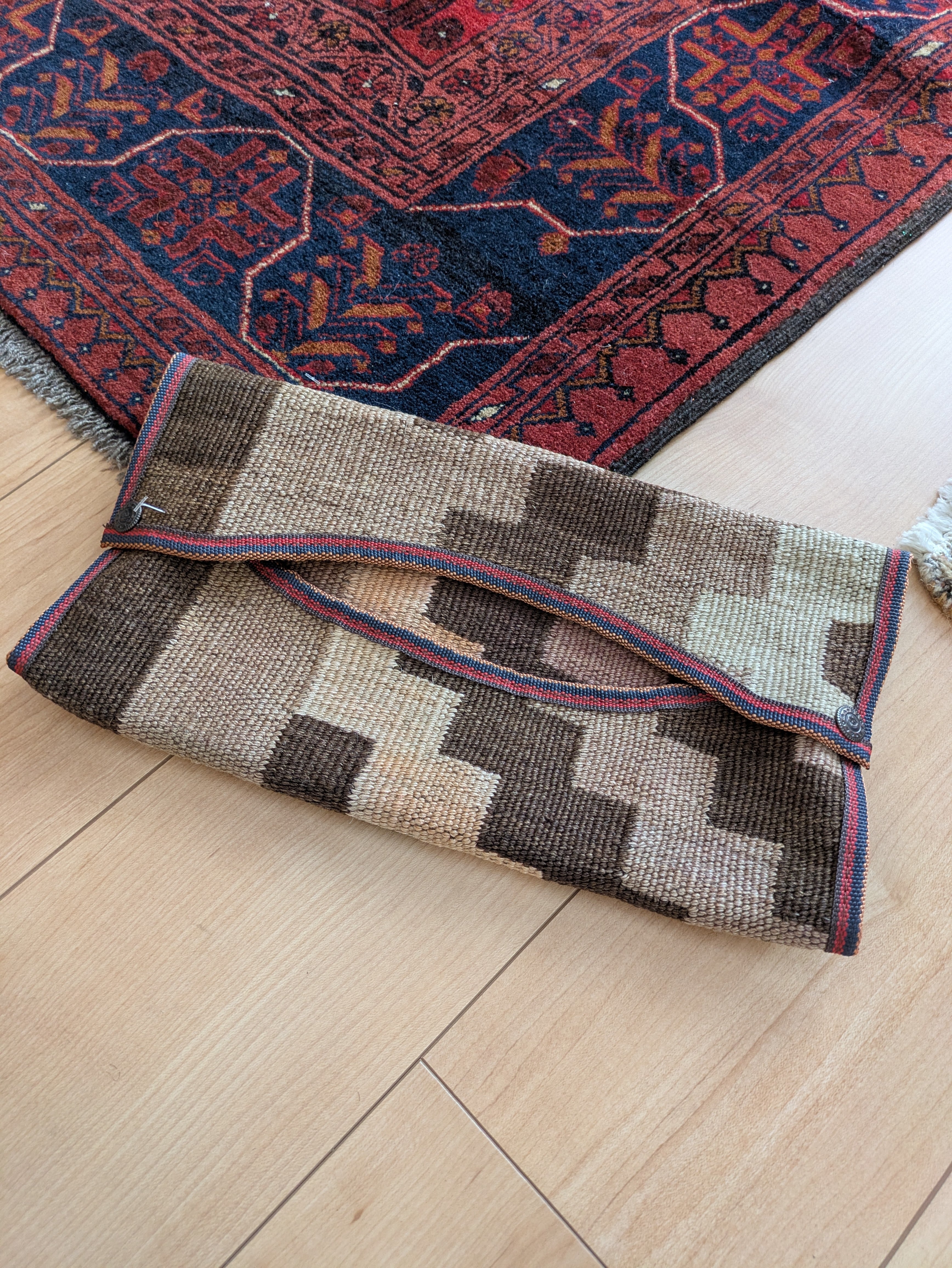 キリムの織り方やデザインは、その土地ごとに異なり、無数の色とりどりの糸が組み合わさった美しい模様が特徴です。その模様を活かし、丁寧に仕上げました。柄の出方がそれぞれ違うので唯一無二の一点ものです。