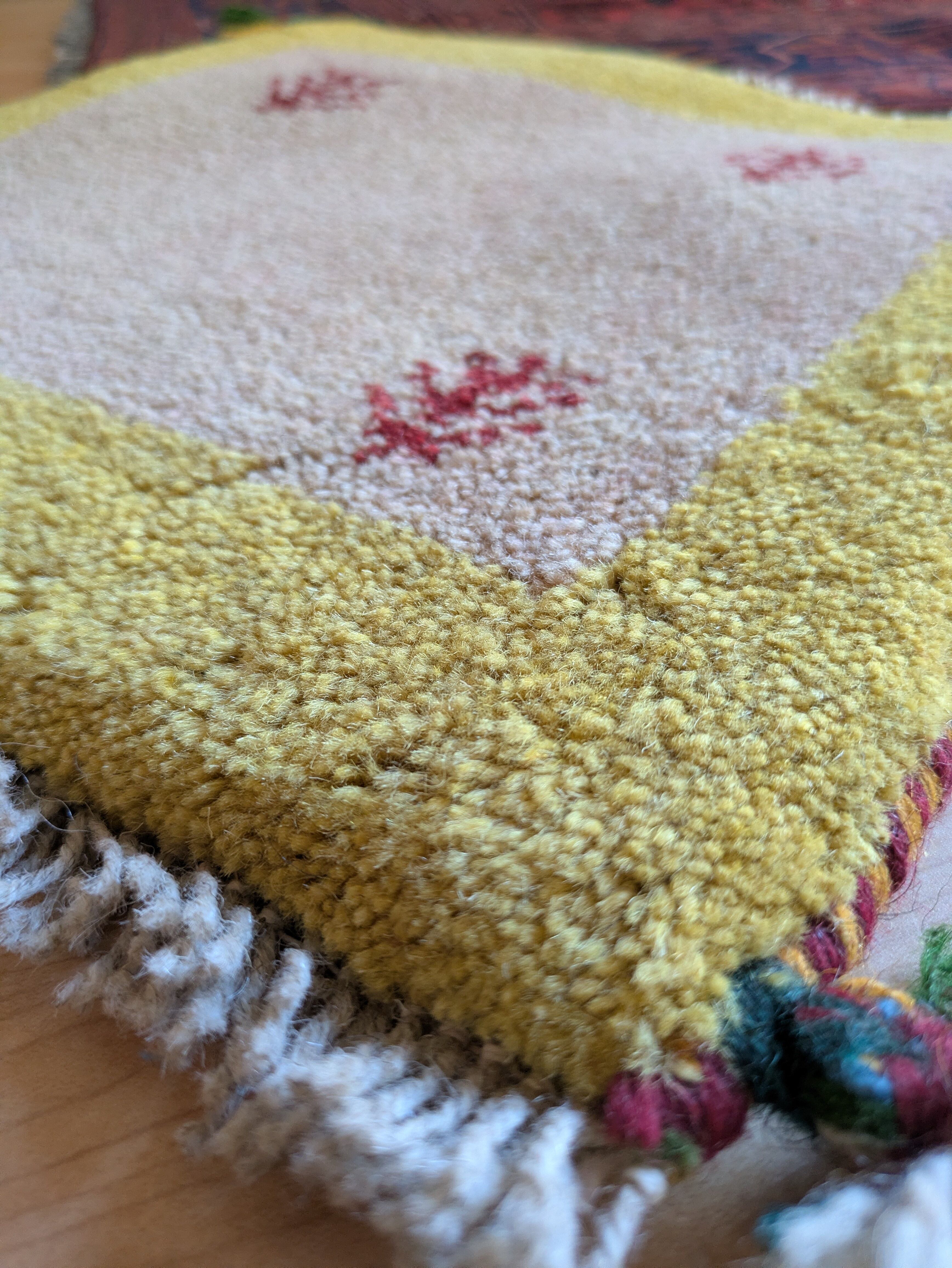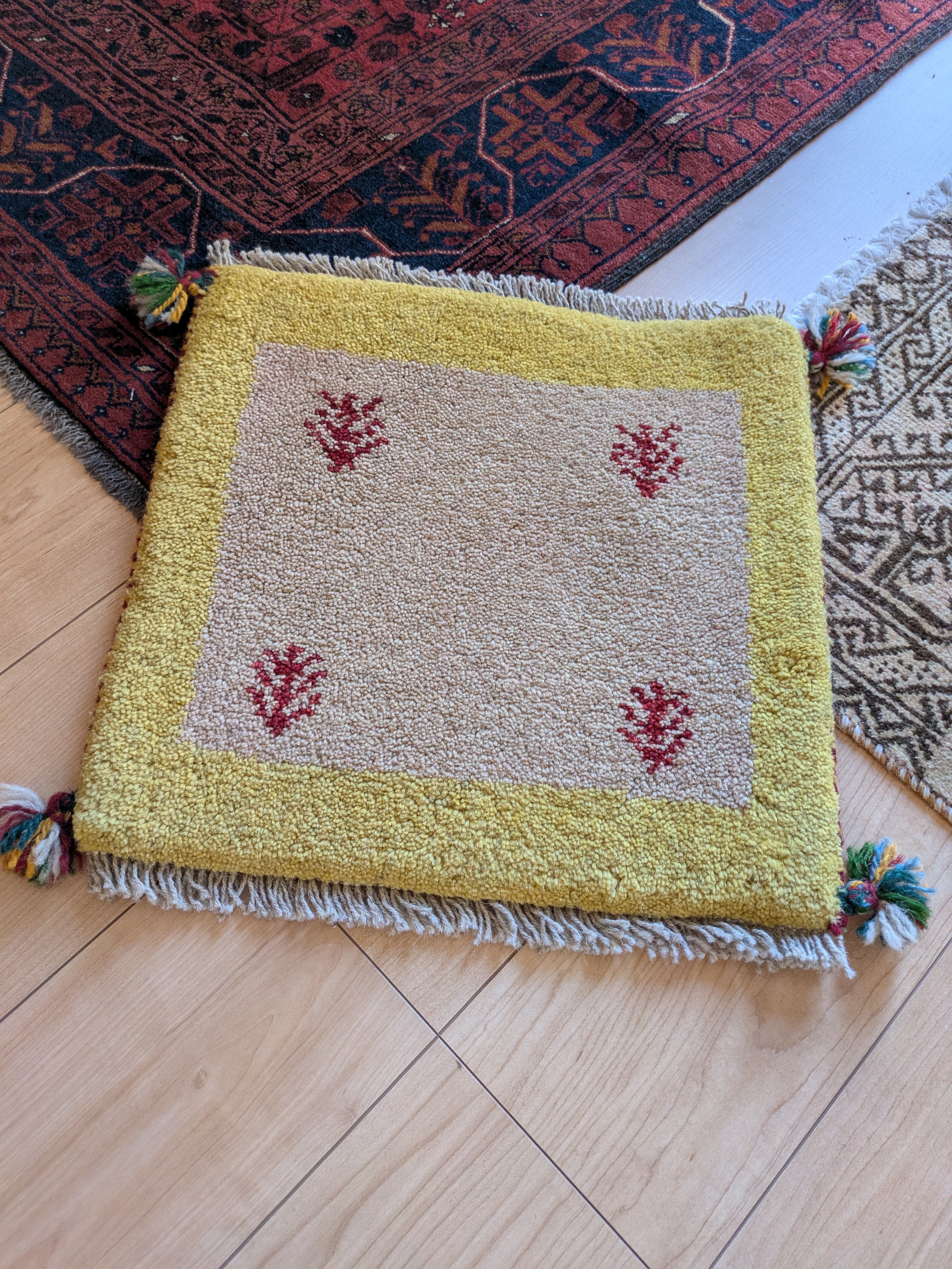 レモンイエローのような軽やかな黄色が珍しいてす。ナチュラルベージュに赤で生命の木の柄も素敵なギャッベてす。