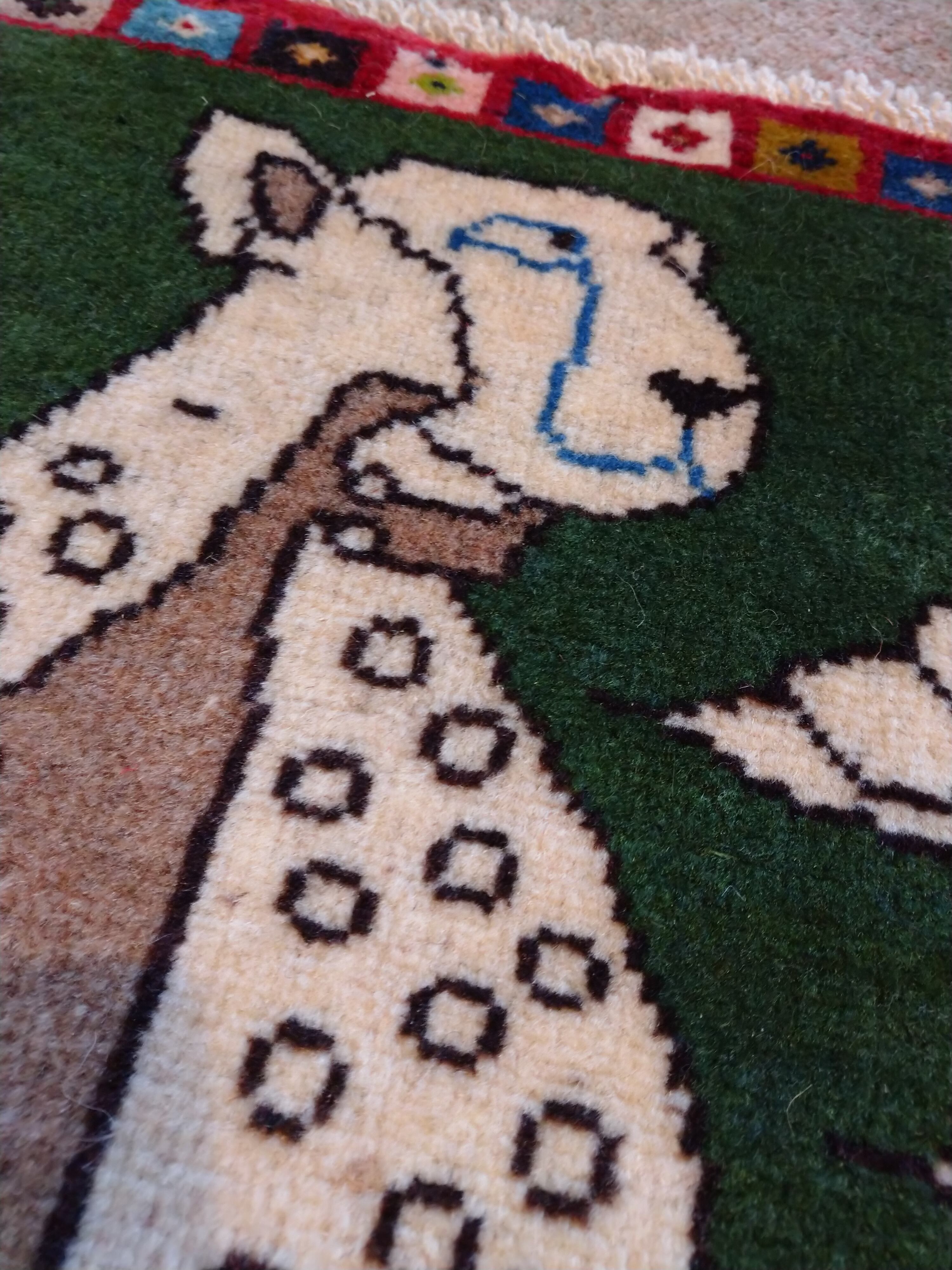 なんとも美しいグリーンとチーター柄が個性的な1枚です。足元はもちろん、壁にタペストリーのように貼ってもカッコいい柄の絨毯です。