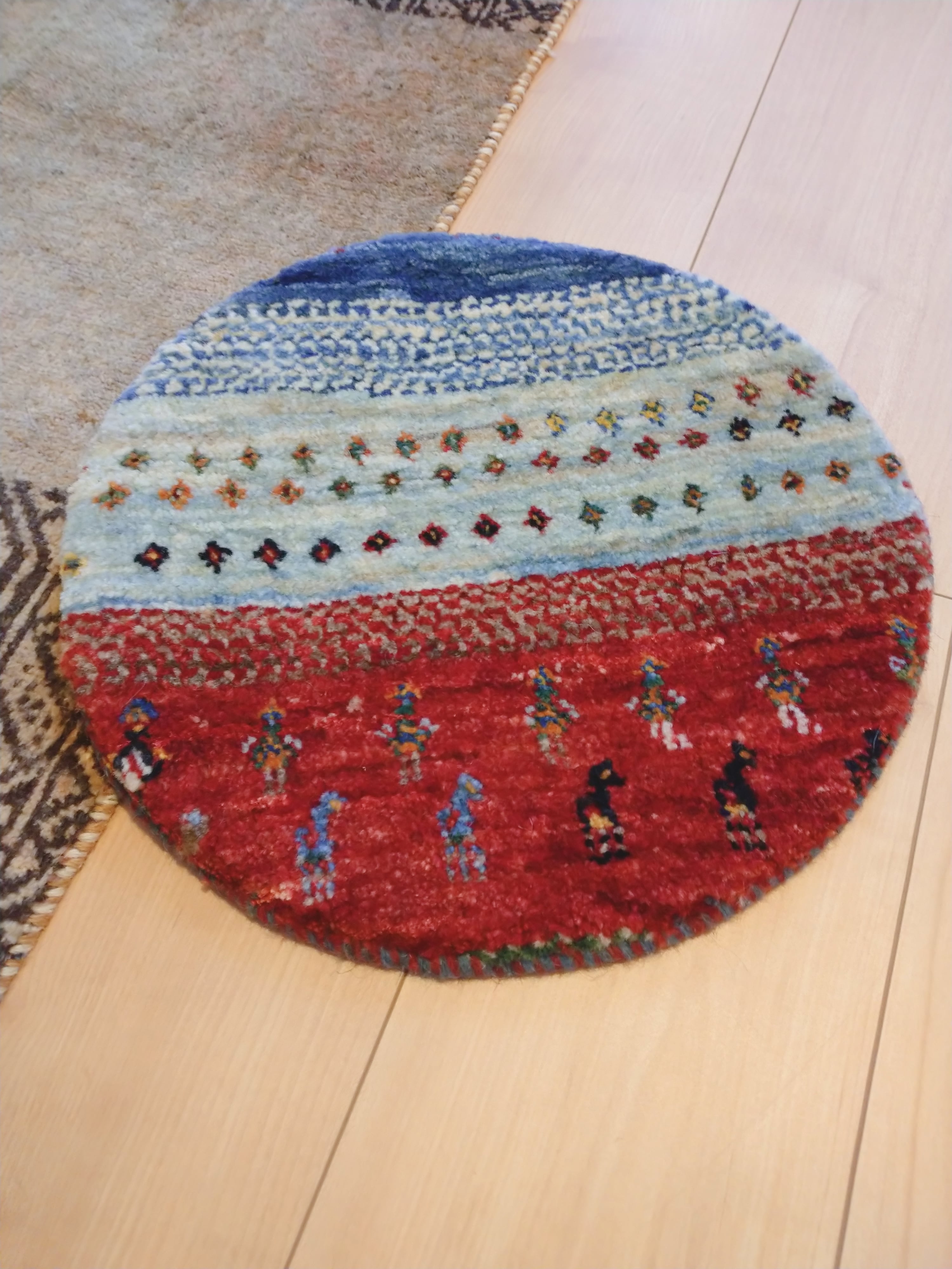 美しい色使いの丸いミニギャッベです。直径35cmの小さなサイズですが、緻密な柄と鮮やかな色合いが特徴です。手編みされた絨毯は、丁寧な手仕事が宿る一枚です。どんなお部屋にも合わせやすく、置くだけで高級感が漂います。