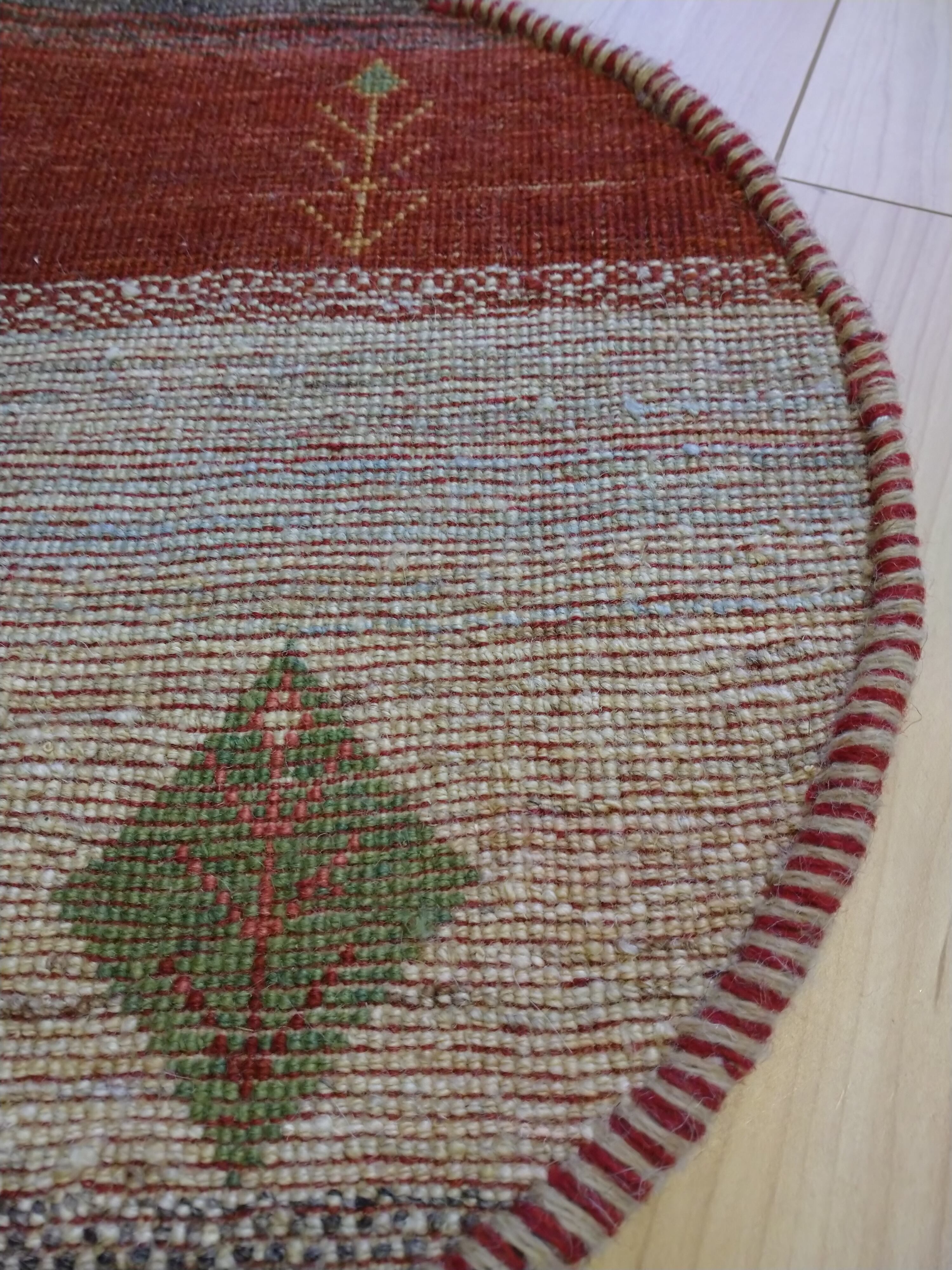 小さなサイズながら、存在感抜群のミニギャッベです!直径44cmのコンパクトさながら、細部まで表現された美しいデザインが特徴です。手織りの繊細さと、モダンなカラーリングが絶妙に調和した一枚は、どんなお部屋にもぴったりです。
