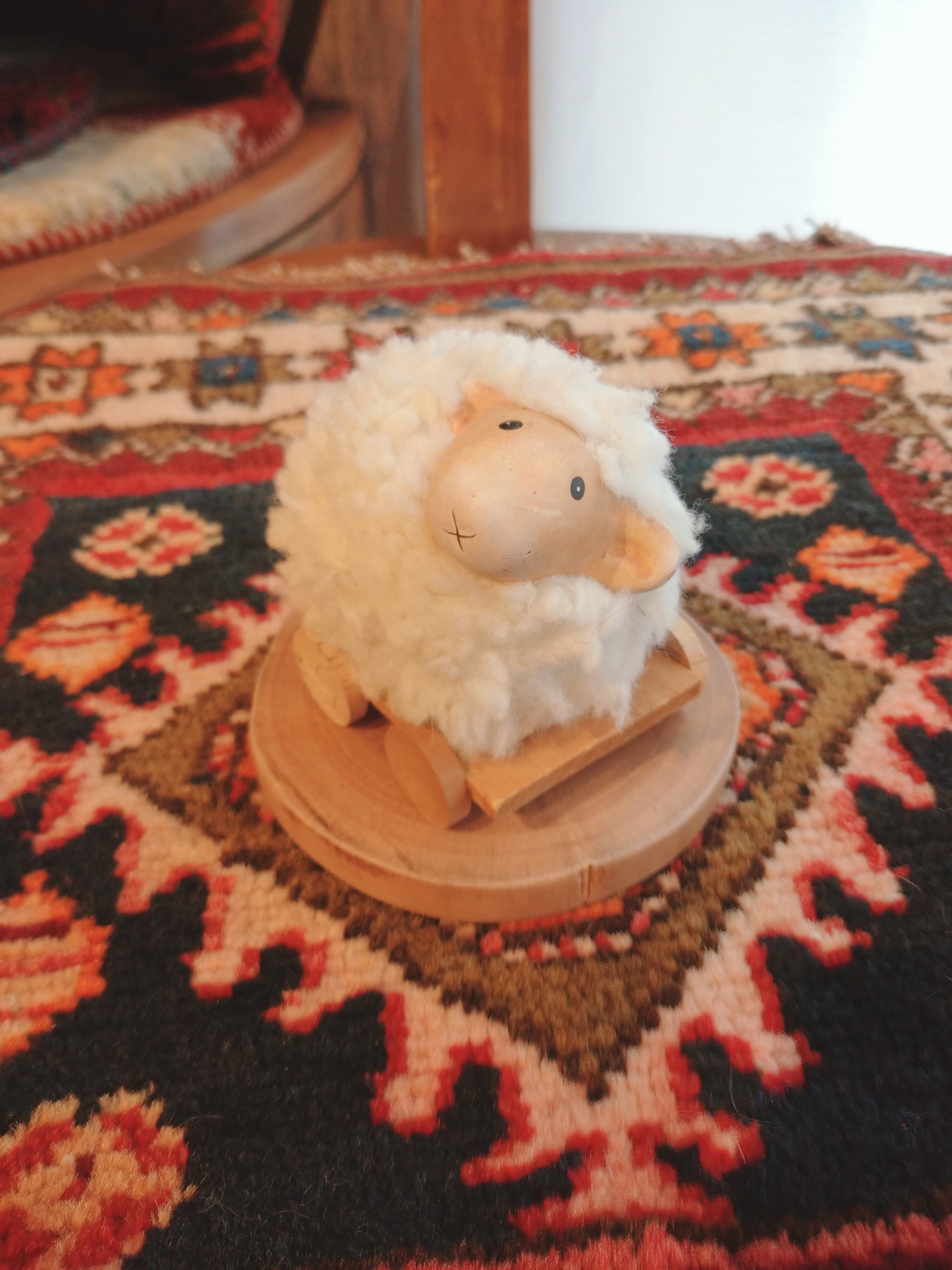 体はモフモフで顔と足の代わり?についている車輪の部分は木製です。