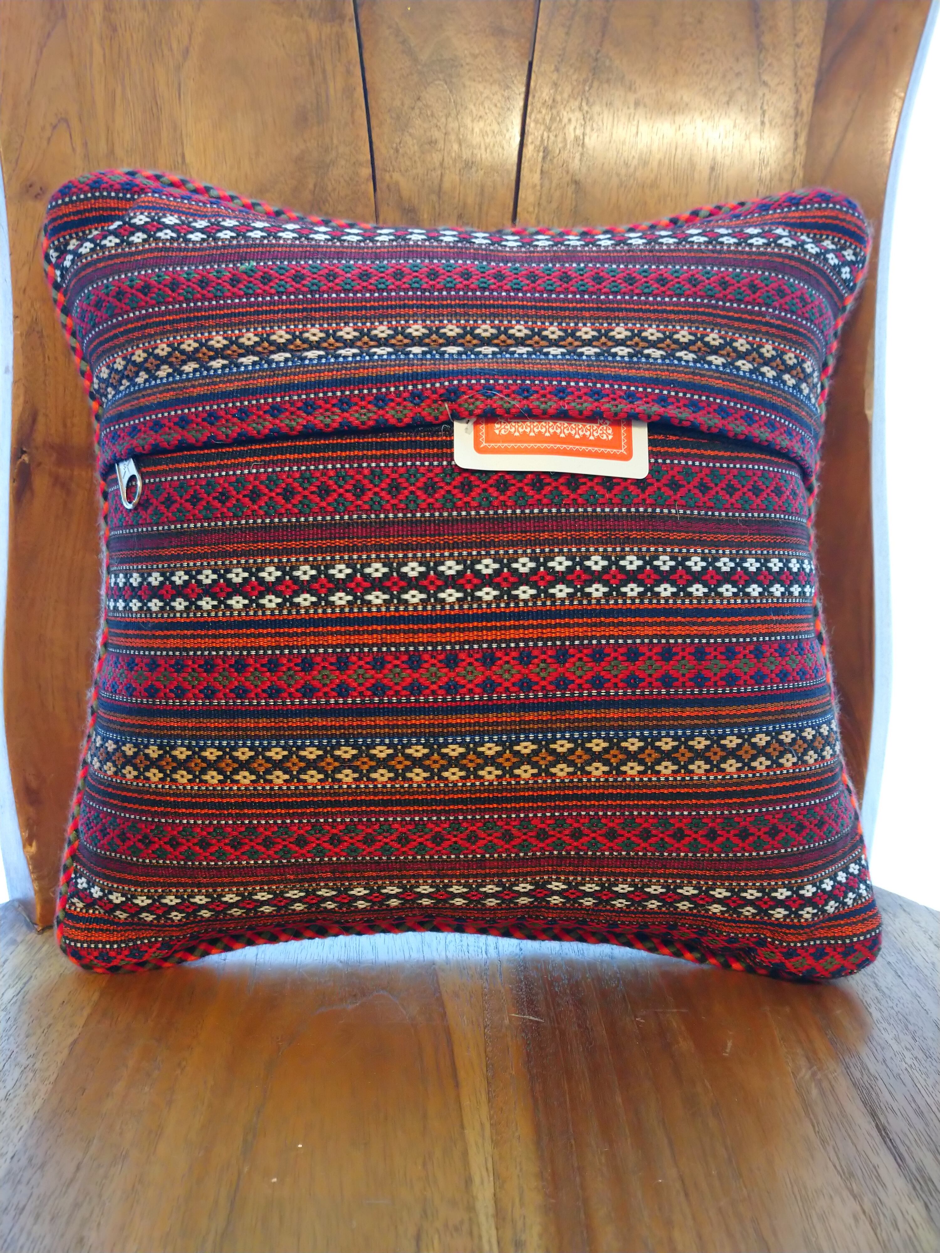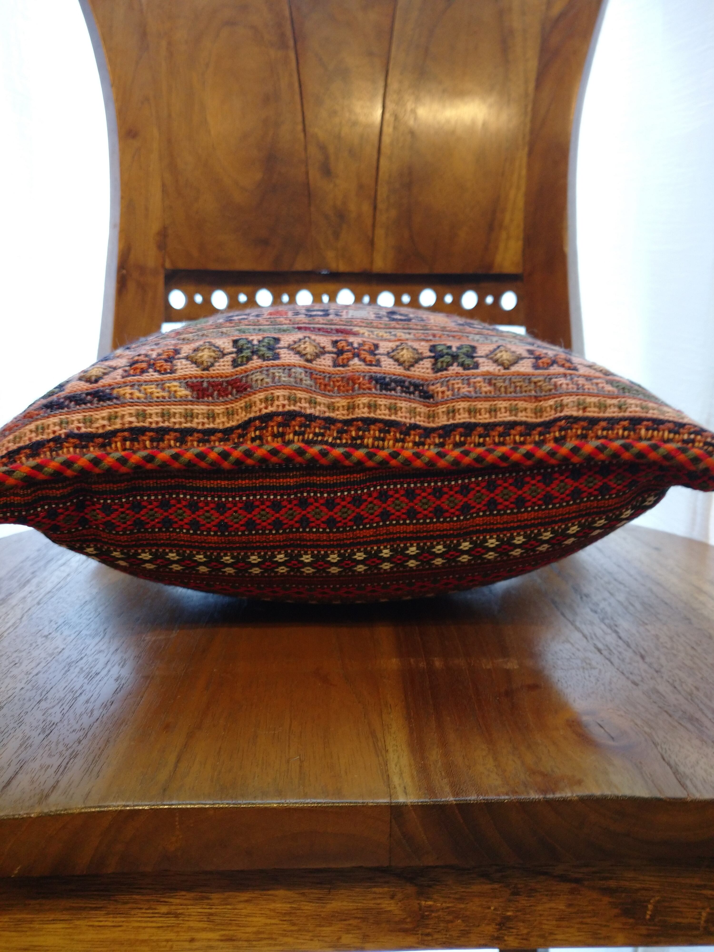 28×27cmのコンパクトなサイズながら、その存在感は抜群。手織りの技法で作られたキリムの織物が特徴で、独自の柄があなたのお部屋を彩ります。
