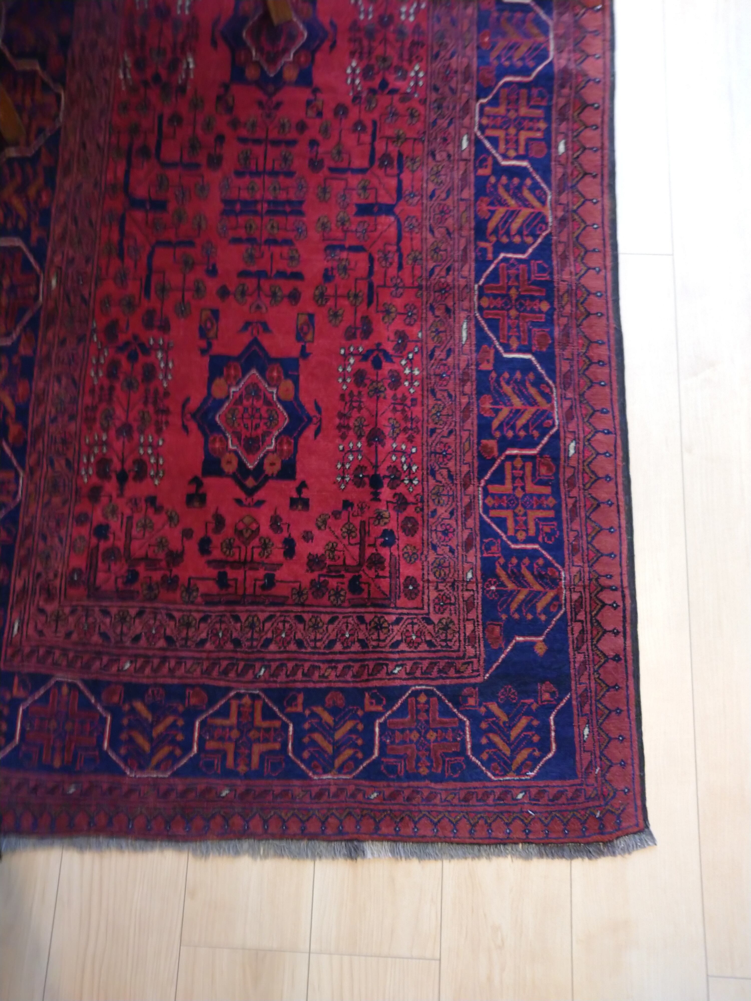 深い赤がかっこいい、バルーチ産のヴィンテージらぐです。お部屋のアクセントにぴったりの存在感を放ち、一枚で空間を彩ります。何かしらの縁があってこそ魅せる、そんな唯一無二の一枚を、あなたのお部屋でお楽しみください。