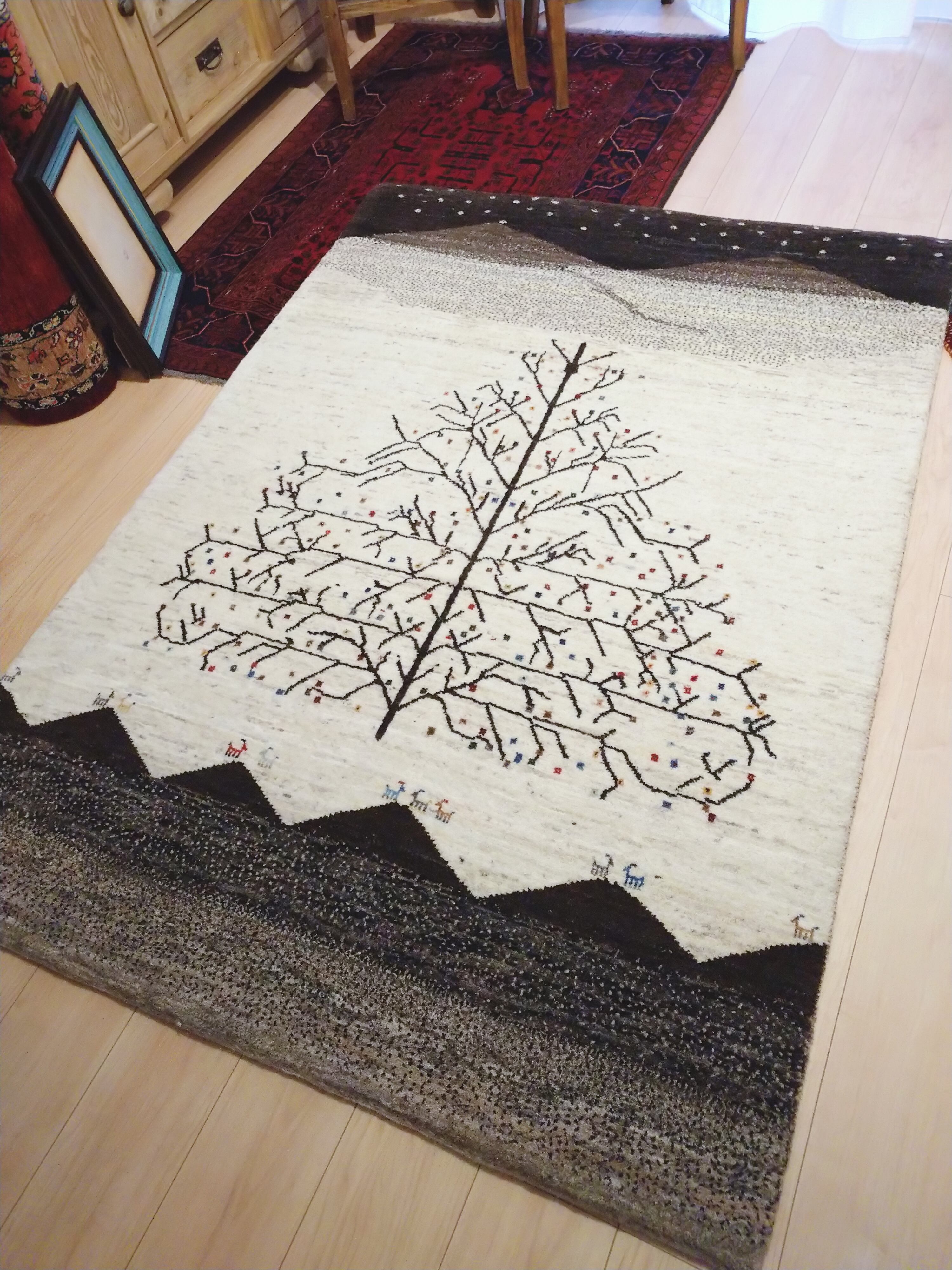 染めていないナチュラルウールをベースに大きな生命の木が織り込まれた1枚。
