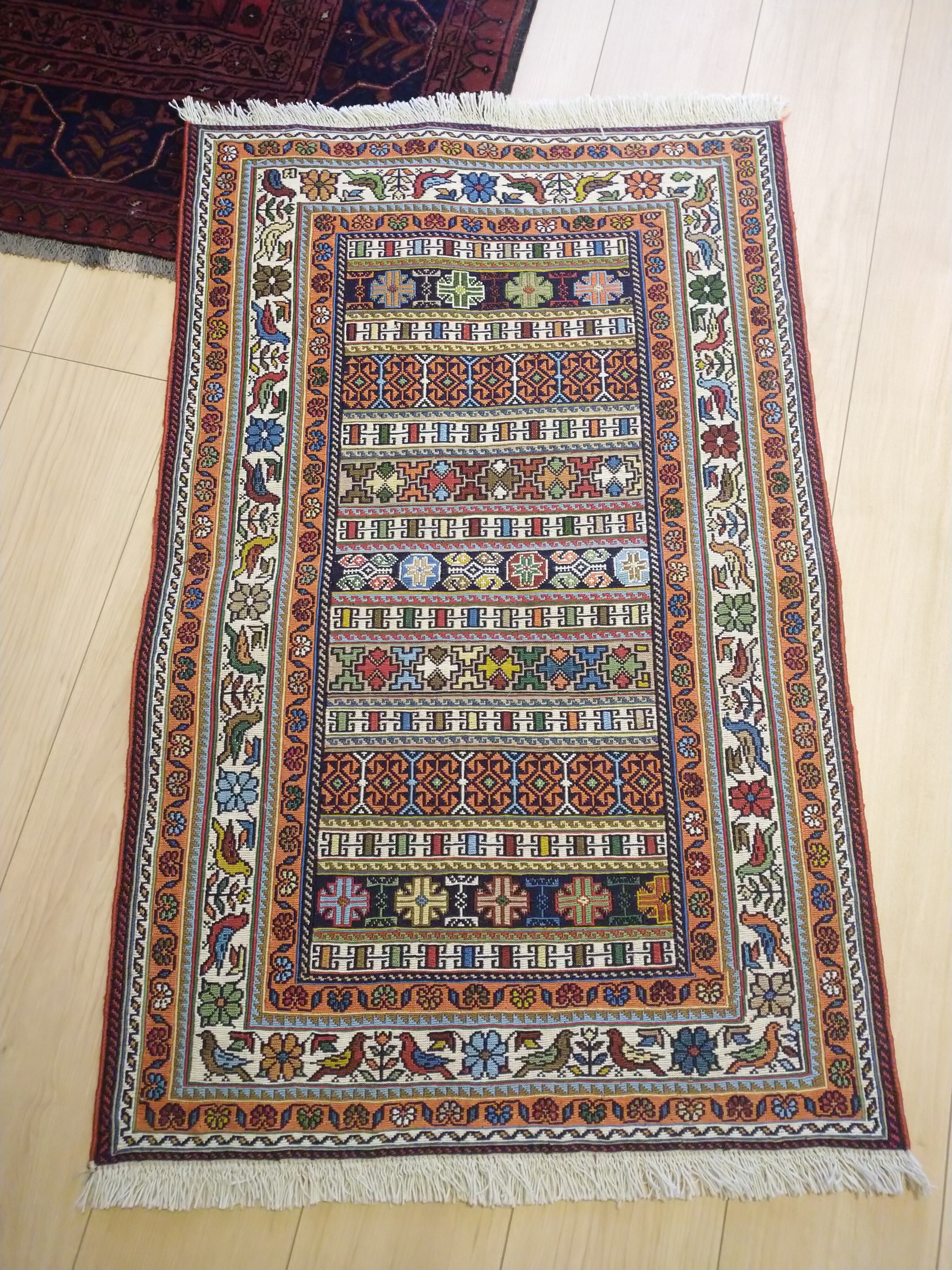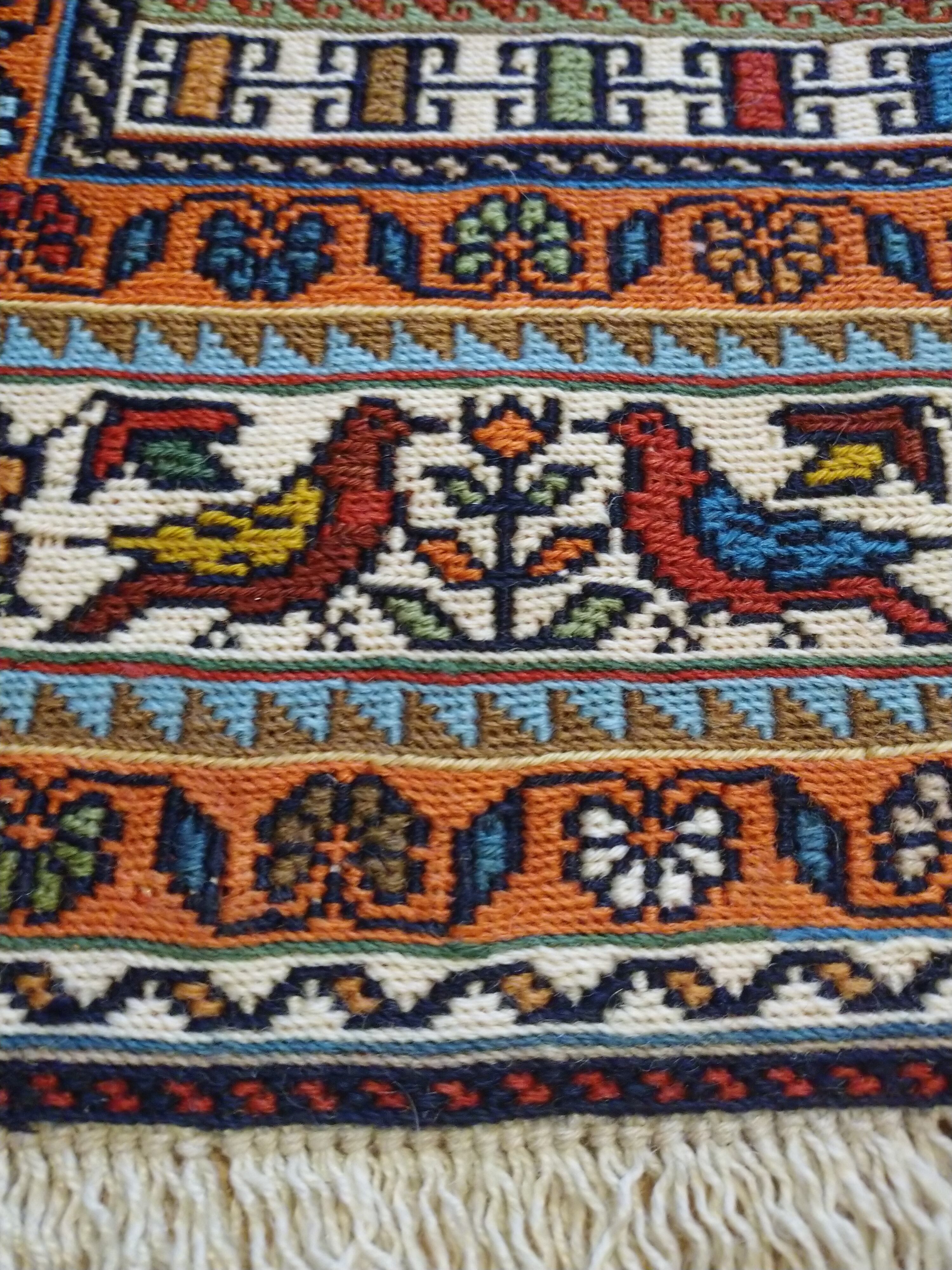 鳥柄とカラフルな色が大変可愛らしいシルジャンキリム。織りが細かく整っており、とても上質で貴重な1枚です。壁にタペストリーのように貼っていただくのもおすすめです。