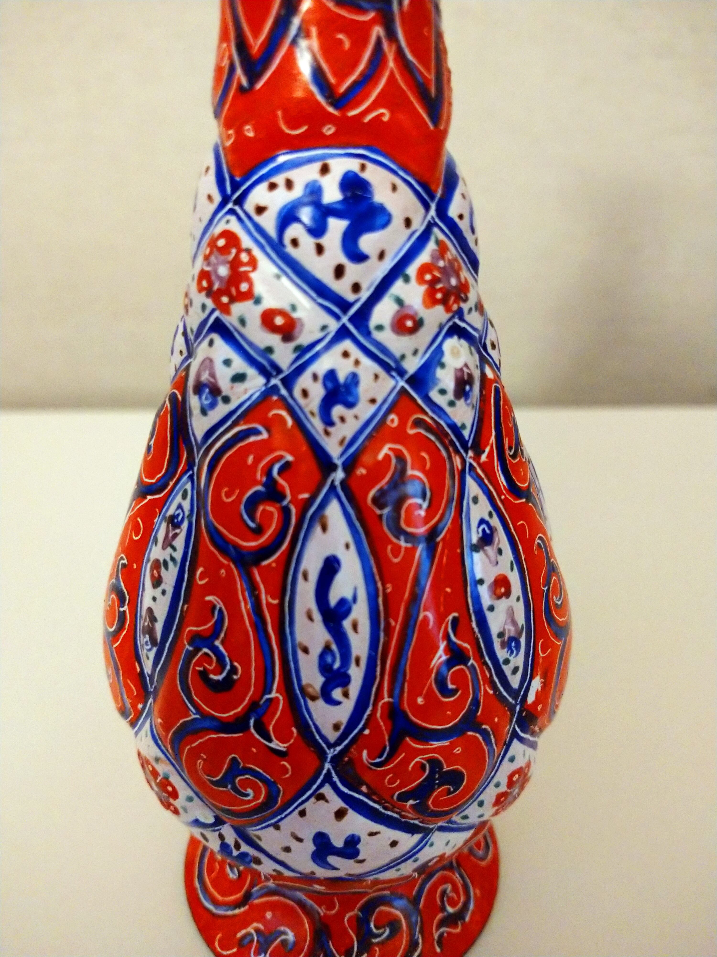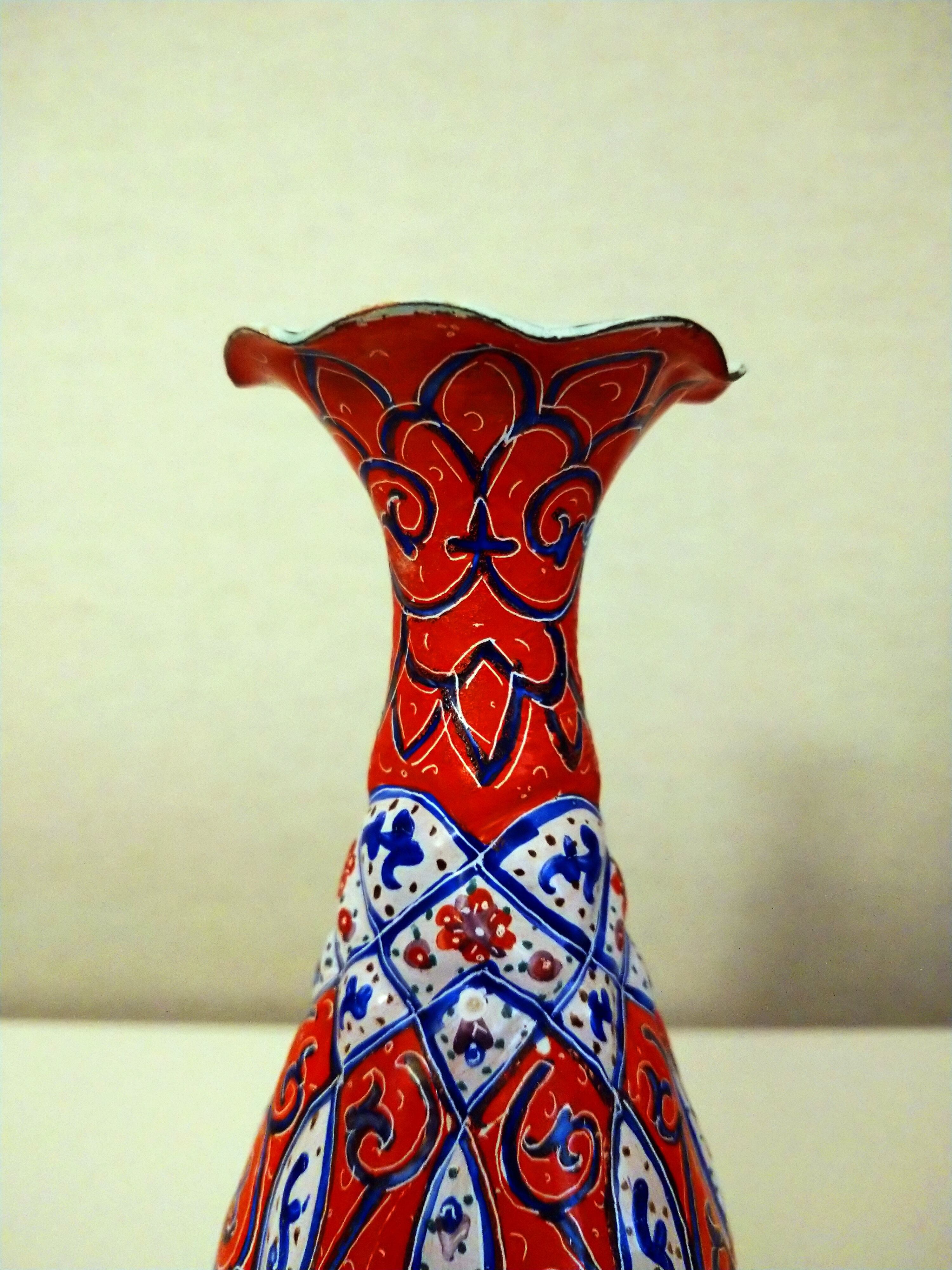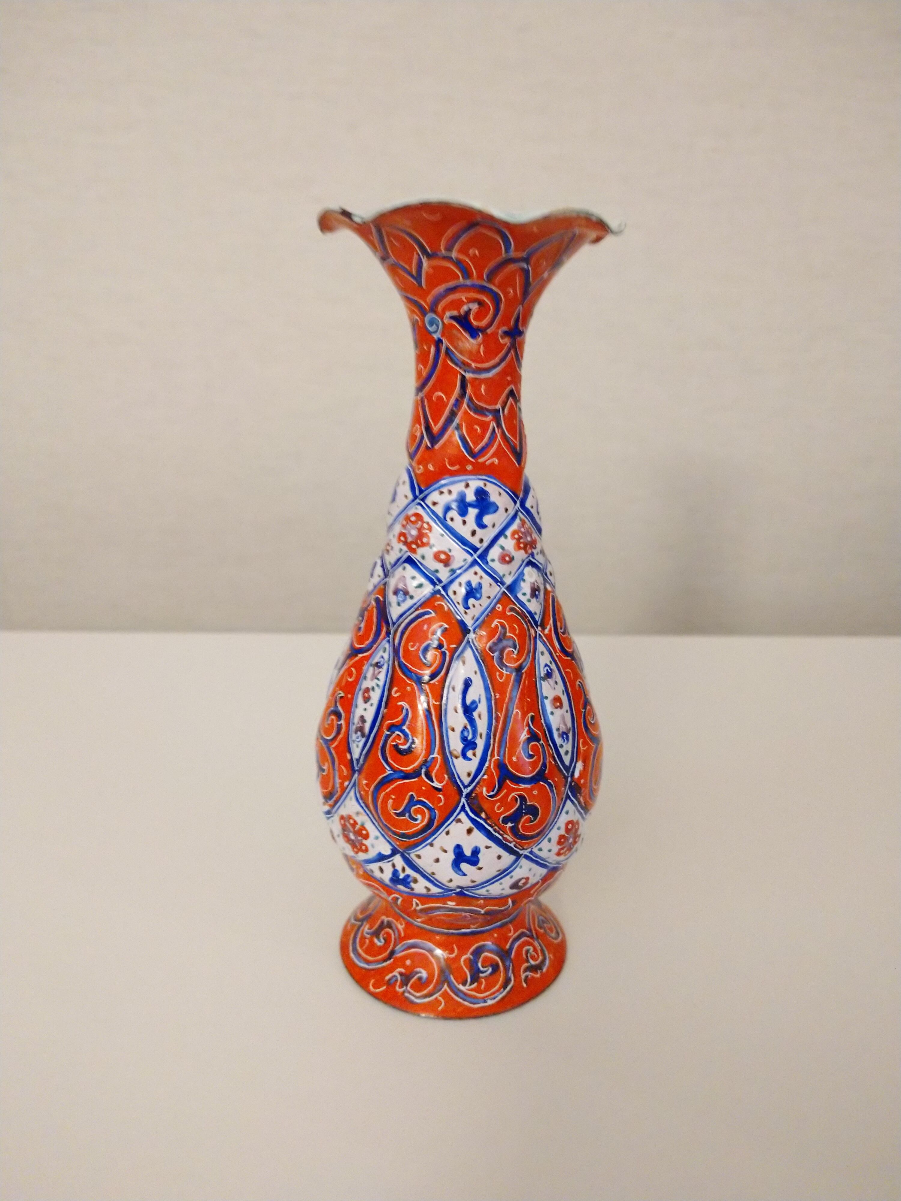 ミーナカーリーとはイランの伝統工芸で、銅で作ったお皿などに釉薬をかけて焼き、さらに手書きでデザインを施して焼き上げたものです。見た目は優雅でとても繊細ですが、丈夫で割れたり傷ついたりしづらく、食洗機や火にかけたりしても色の変化はしづらいそうです。