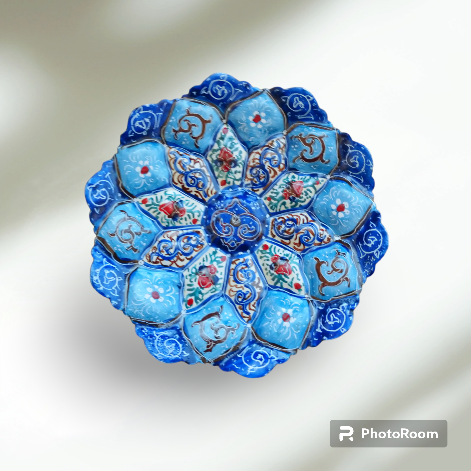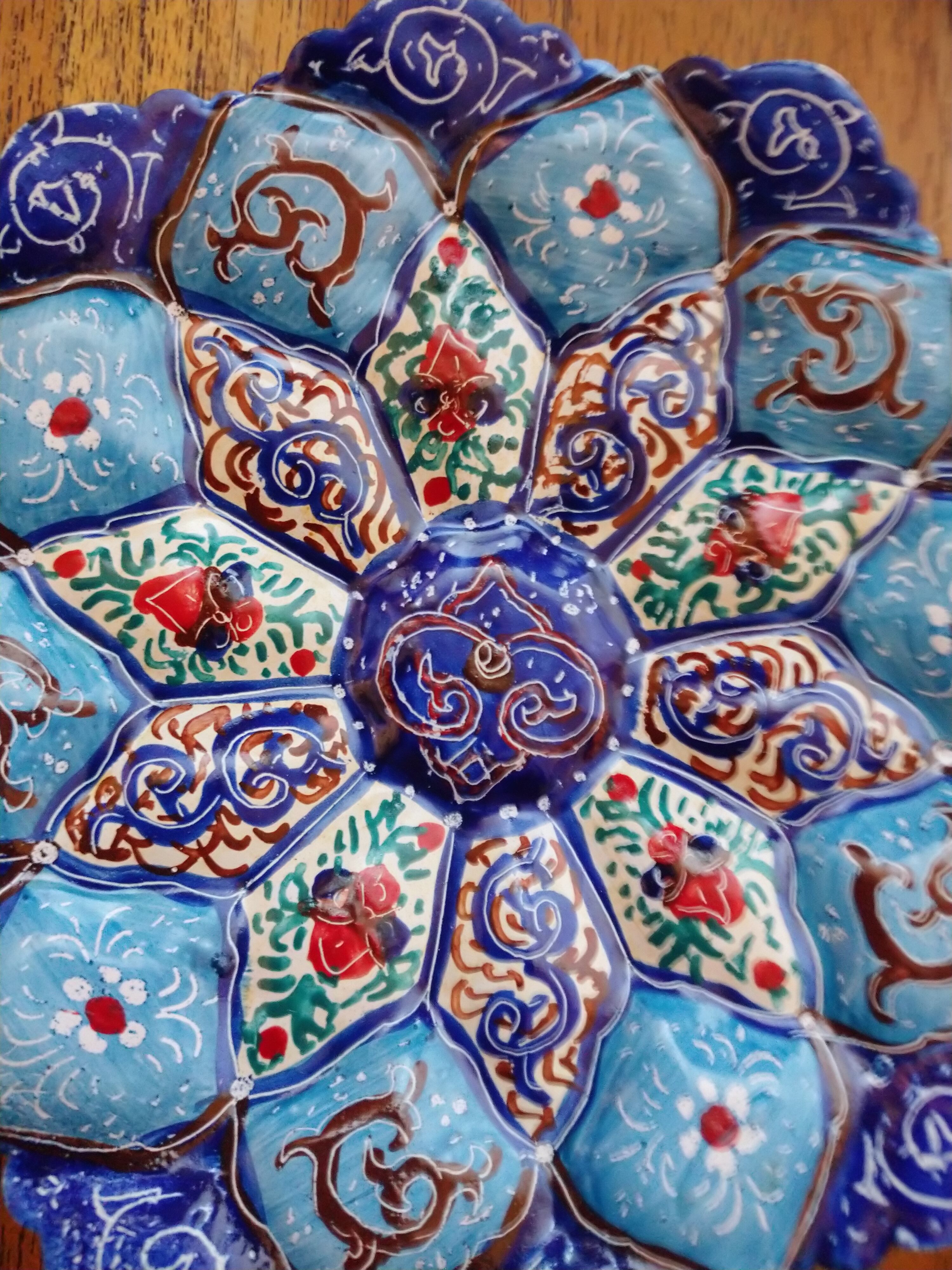 ミーナカーリーとはイランの伝統工芸で、銅で作ったお皿などに釉薬をかけて焼き、さらに手書きでデザインを施して焼き上げたものです。見た目は優雅でとても繊細ですが、丈夫で割れたり傷ついたりしづらく、食洗機や火にかけたりしても色の変化はしづらいそうです。