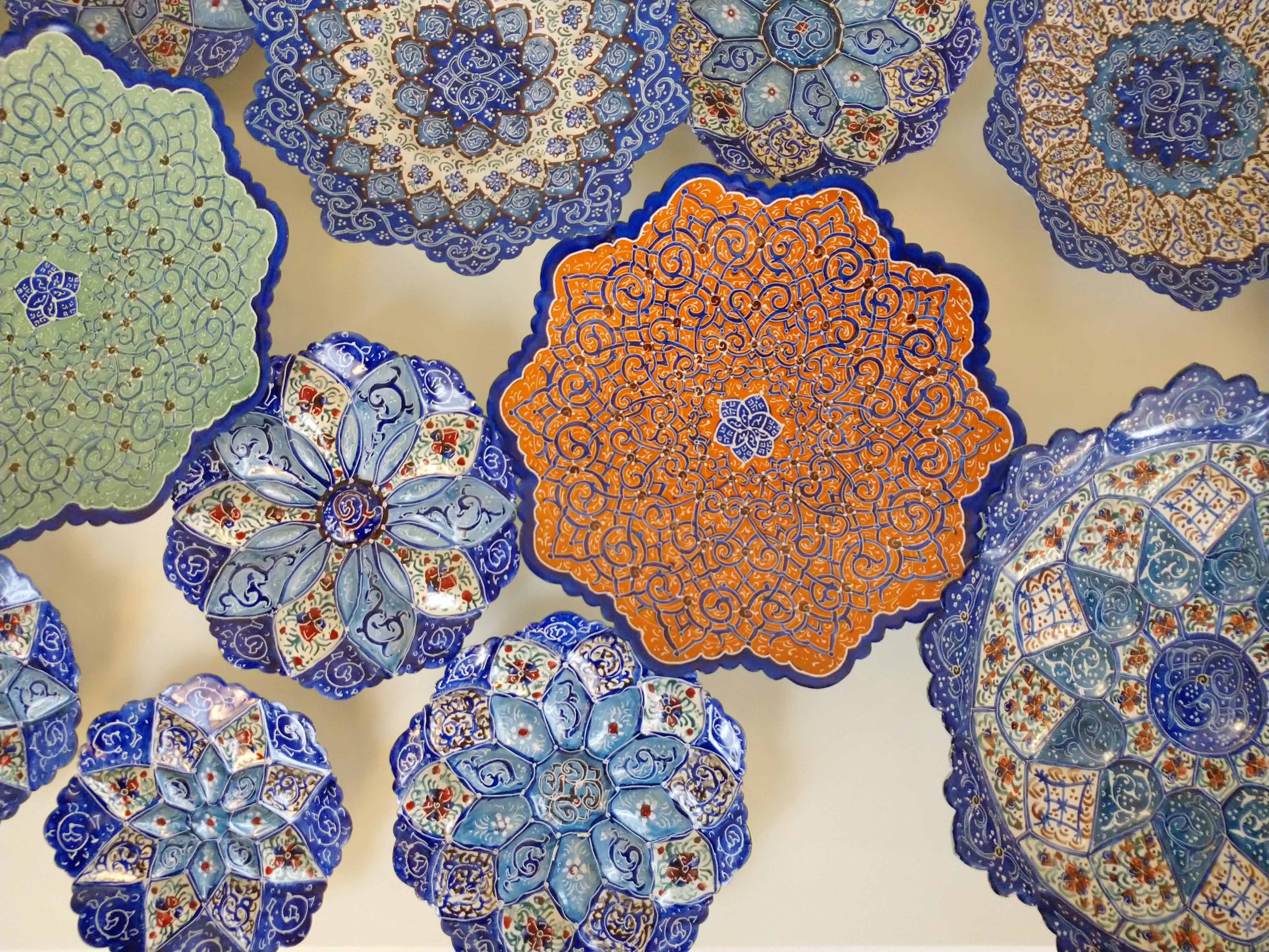 ミーナカーリーとはイランの伝統工芸で、銅で作ったお皿などに釉薬をかけて焼き、さらに手書きでデザインを施して焼き上げたものです。見た目は優雅でとても繊細ですが、丈夫で割れたり傷ついたりしづらく、食洗機や火にかけたりしても色の変化はしづらいそうです。