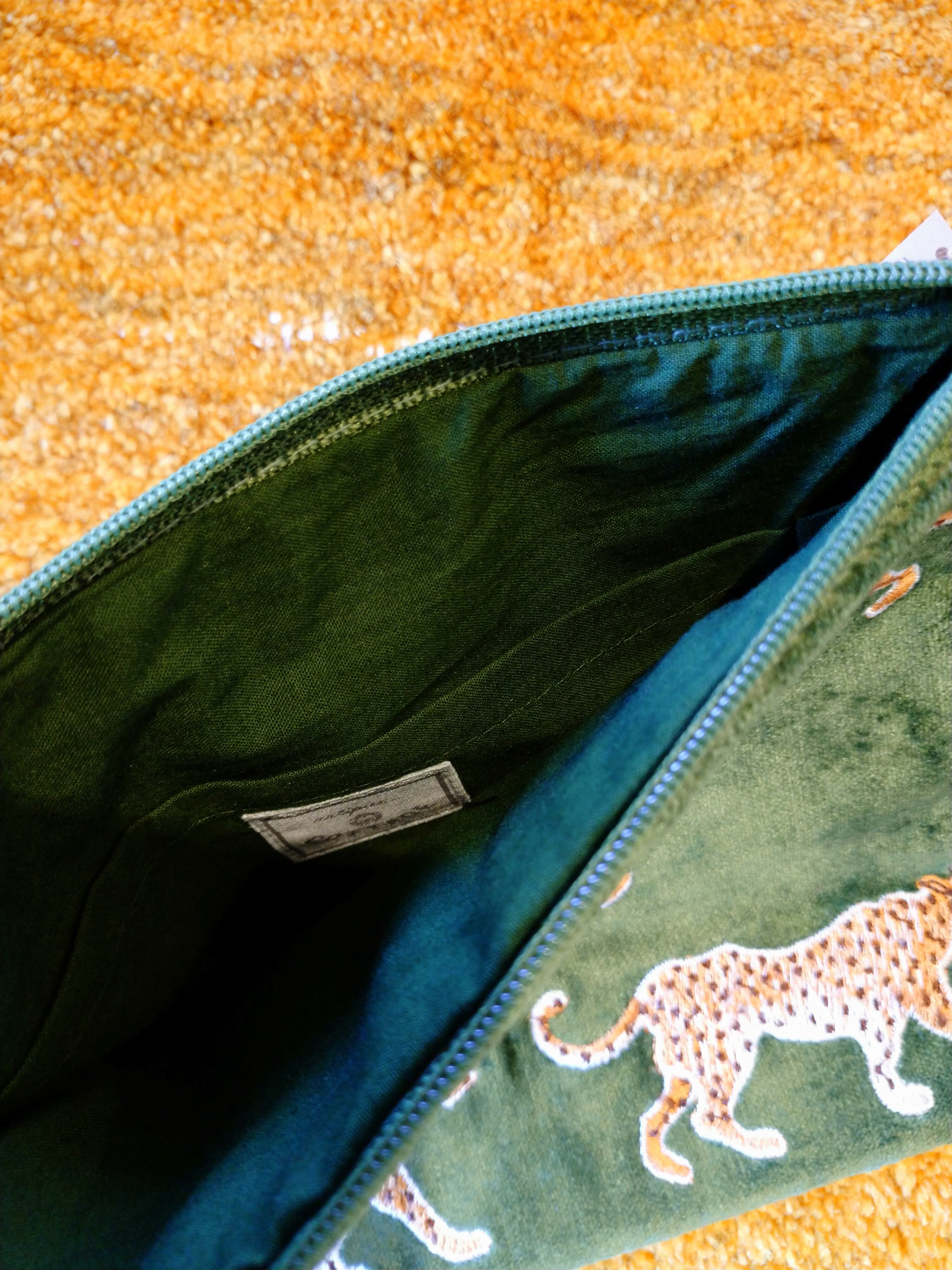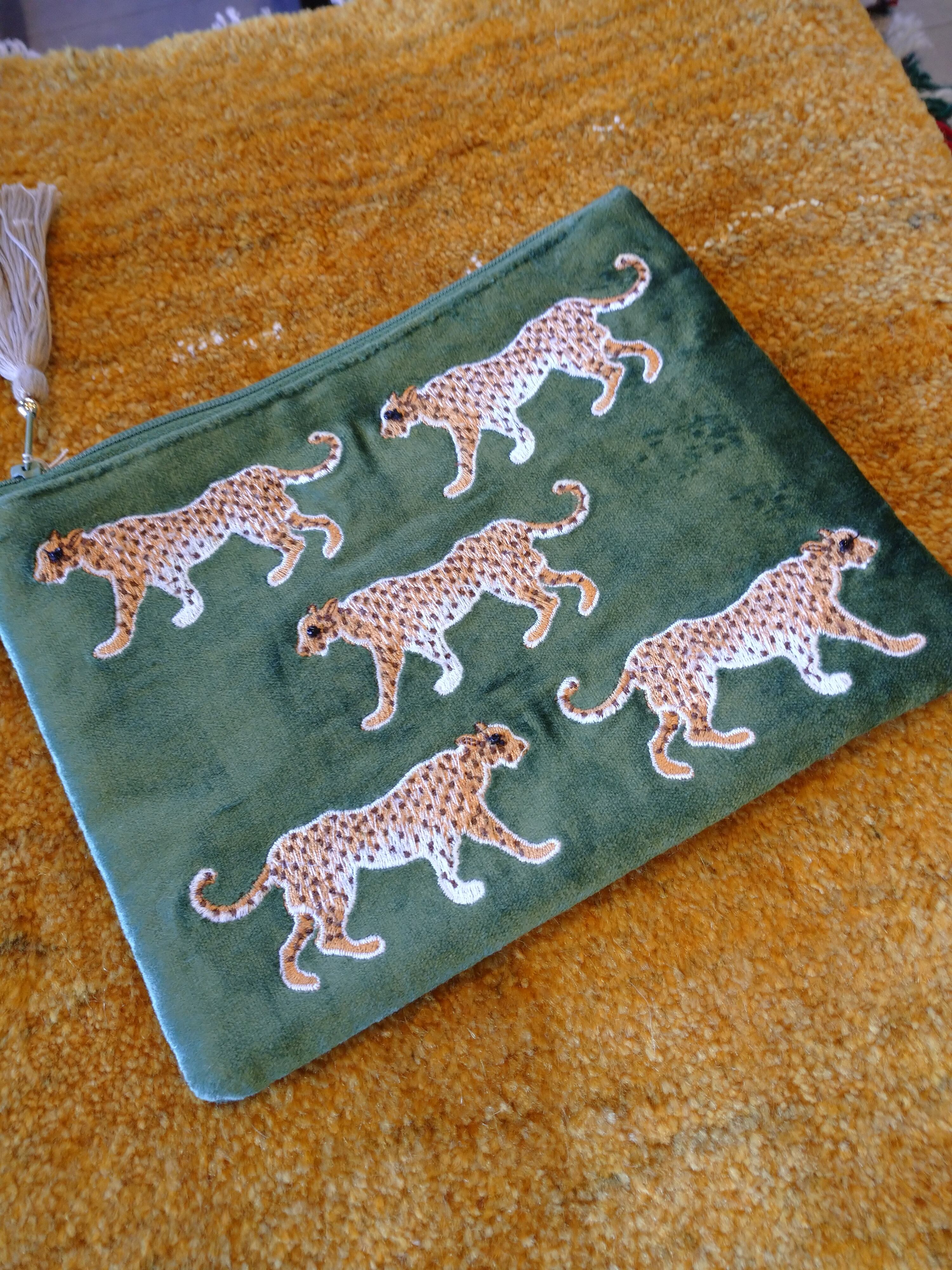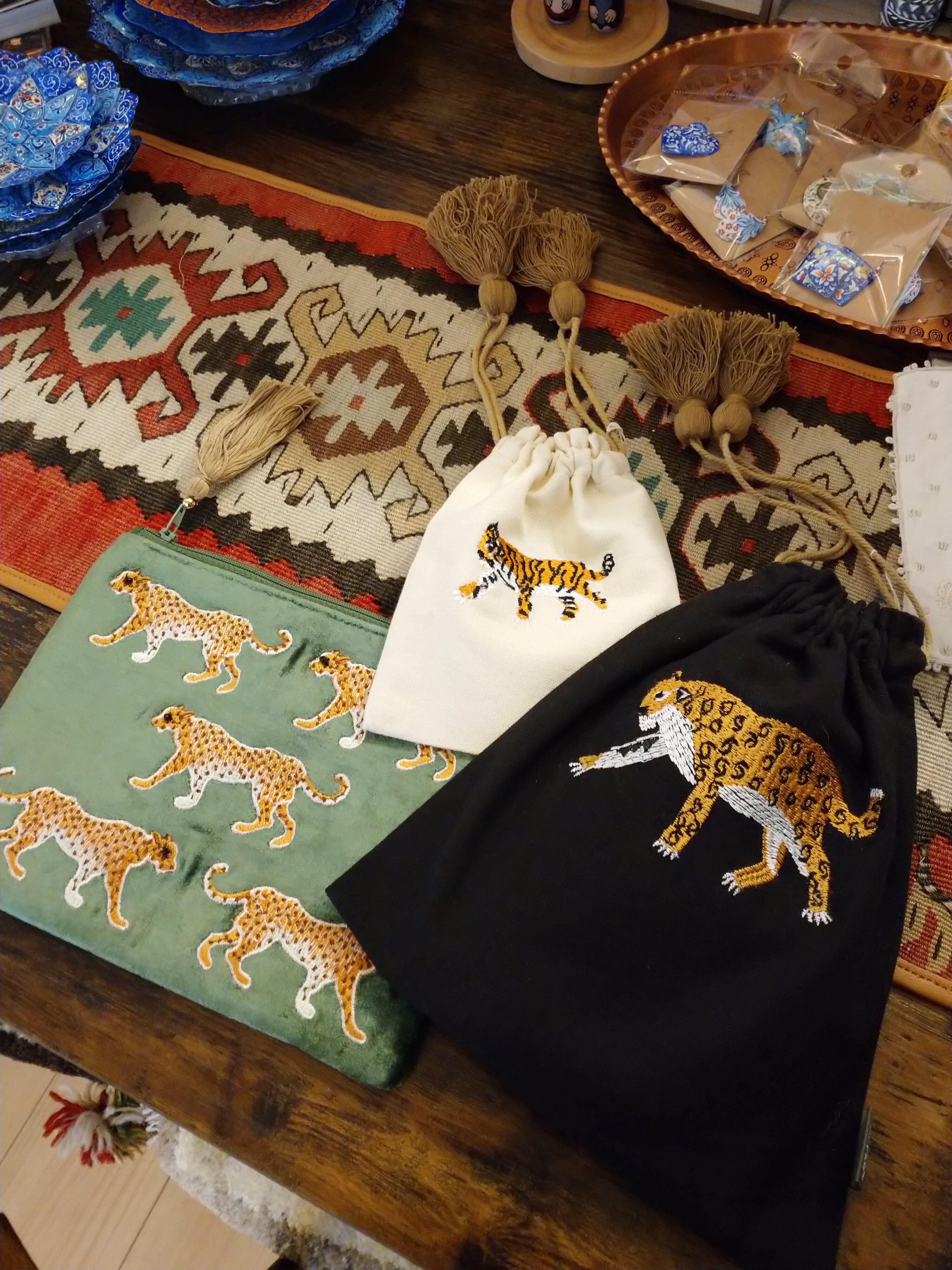 チーターモチーフの刺繍が施され、上品なアクセントになるポーチです。柔らかく手触りの良いベロア素材とフリンジが、おしゃれなポイントに。小物入れとしてだけでなく、外出時にもぴったりのサイズ感で、バッグの中を整理整頓するのにも便利です。大人可愛いデザインなので、プレゼントにもおすすめです。
