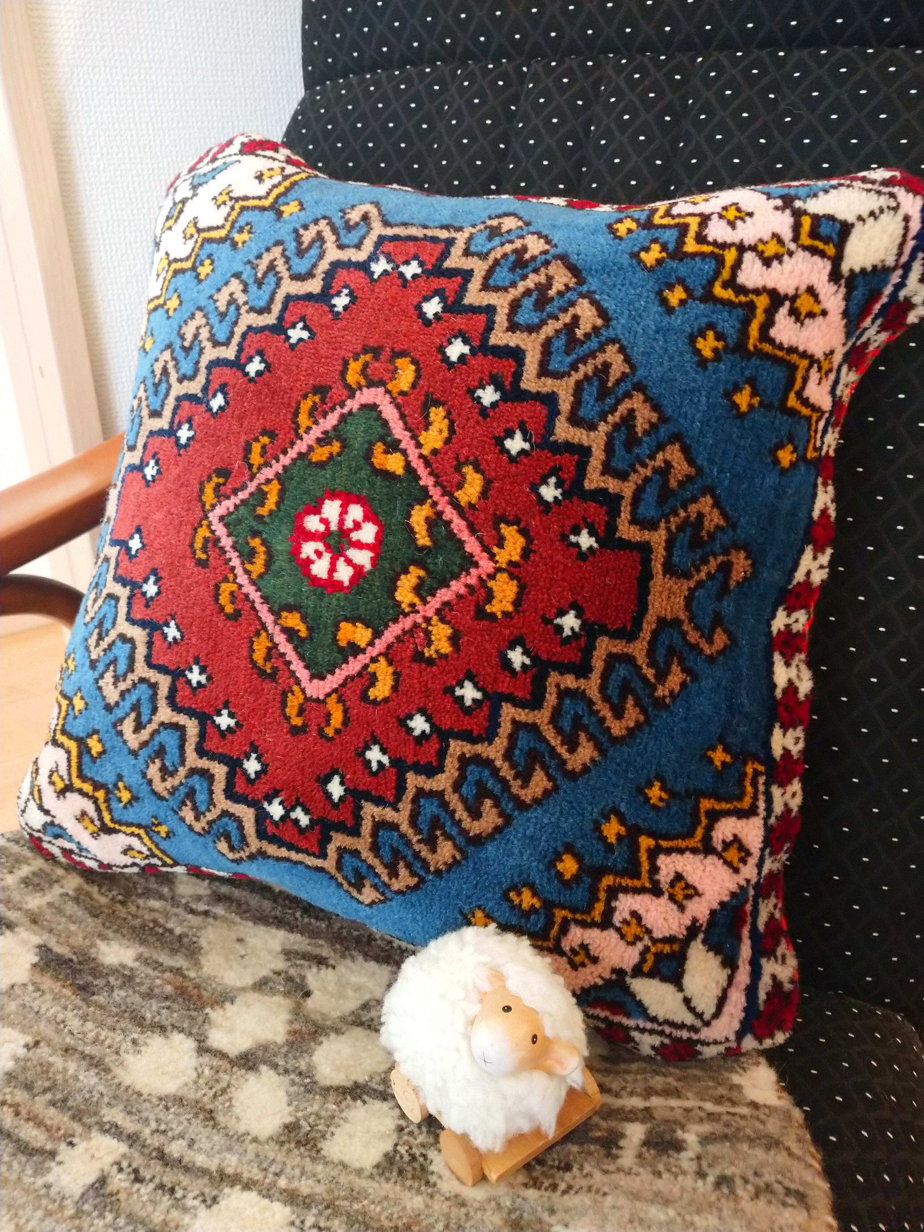 色艶がとても素晴らしいヤラメ絨毯のクッションです。深くて落ち着いたブルーと、四つ角の薄いピンクの組み合わせがとても美しいです。