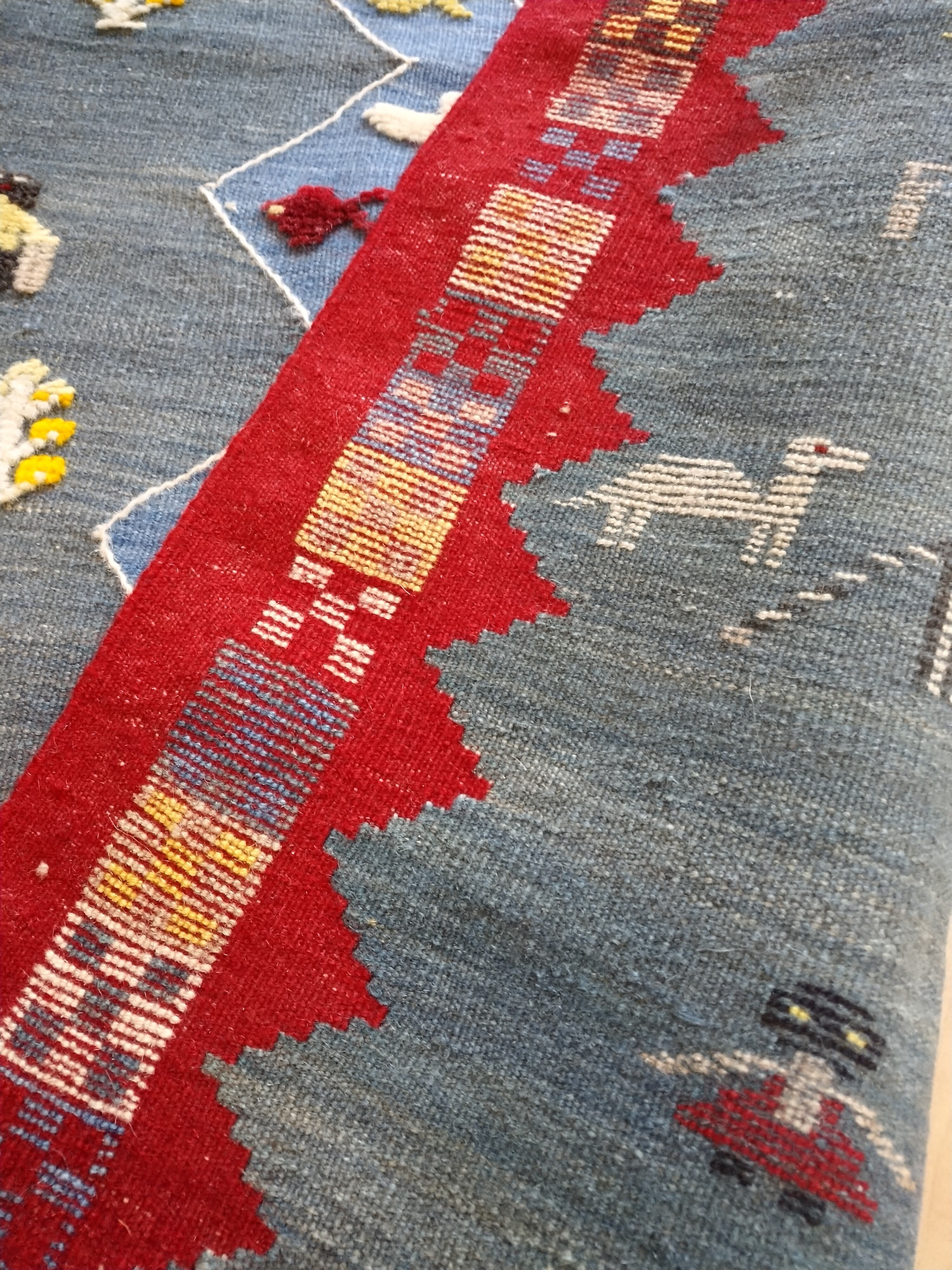 ランドスケープ柄には、テントや人々、鹿や生命の木など遊牧生活の風景と、真ん中の川のようなところに魚と水鳥がいるのは 願望や妄想の世界が描かれているようです。