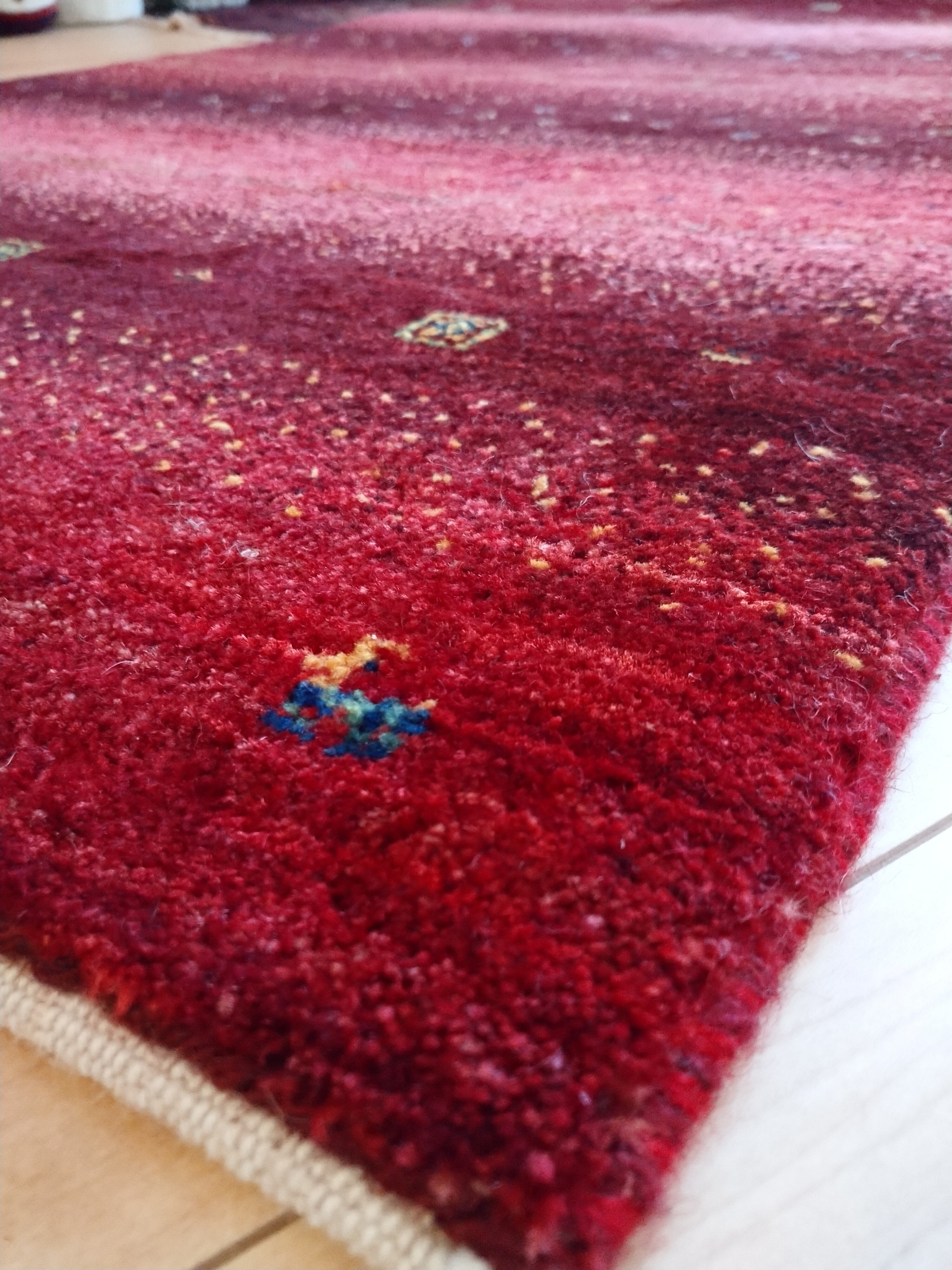 赤のグラデーションがとても美しいギャッベです。よく見ると とても細かく控えめに柄が入っています。鹿と生命の木も。とても素敵な1枚です。