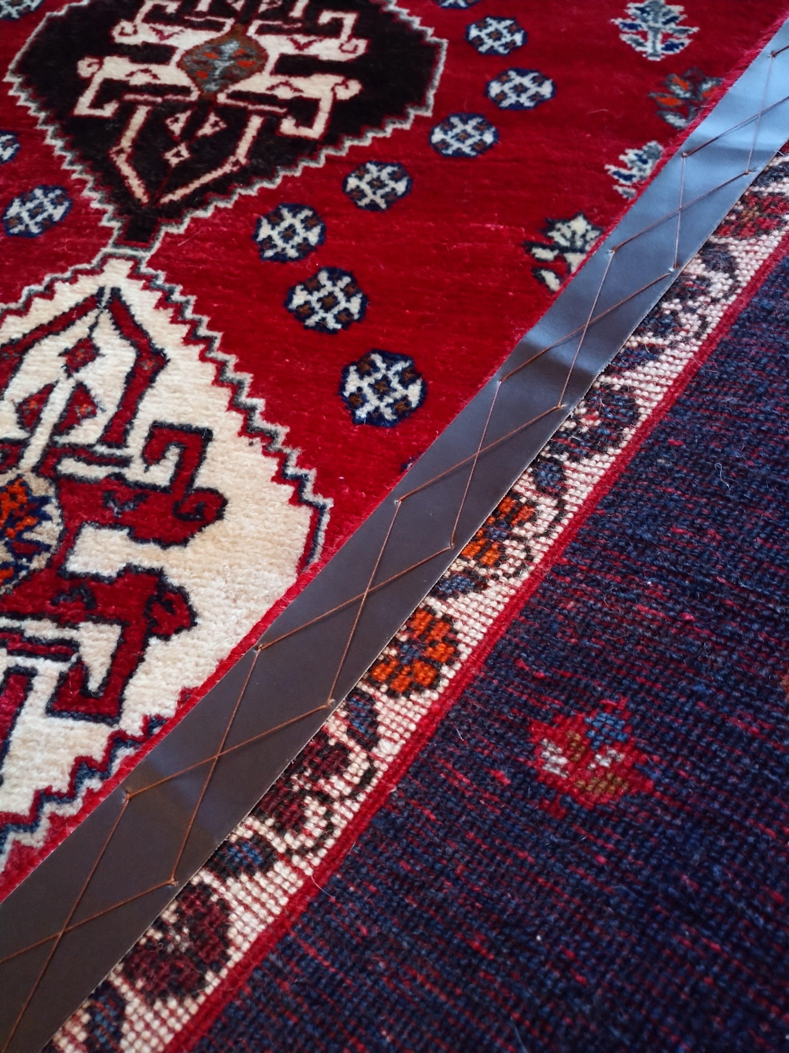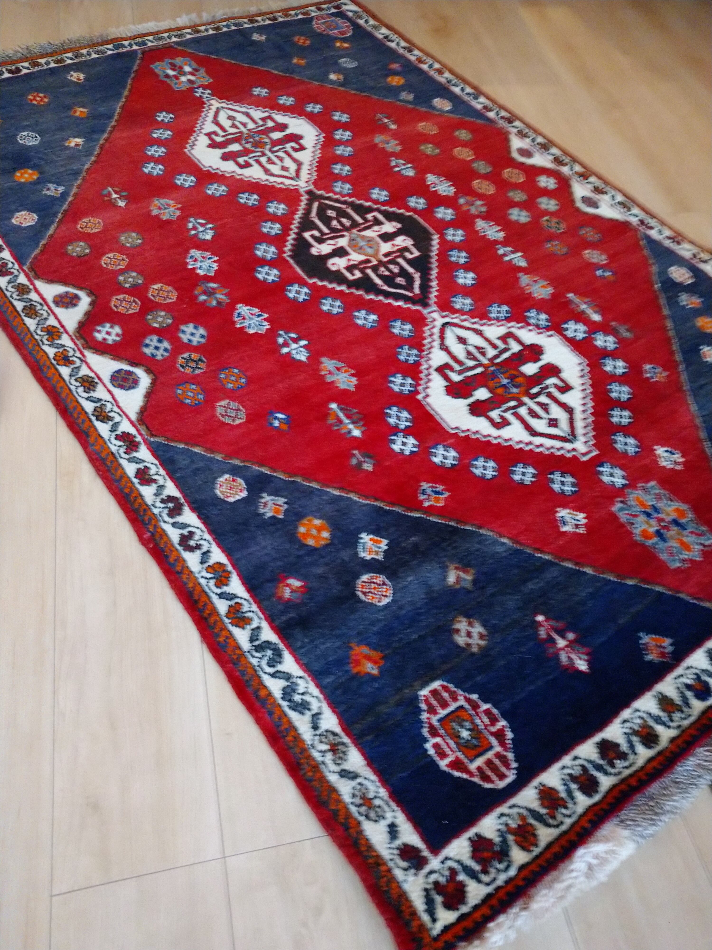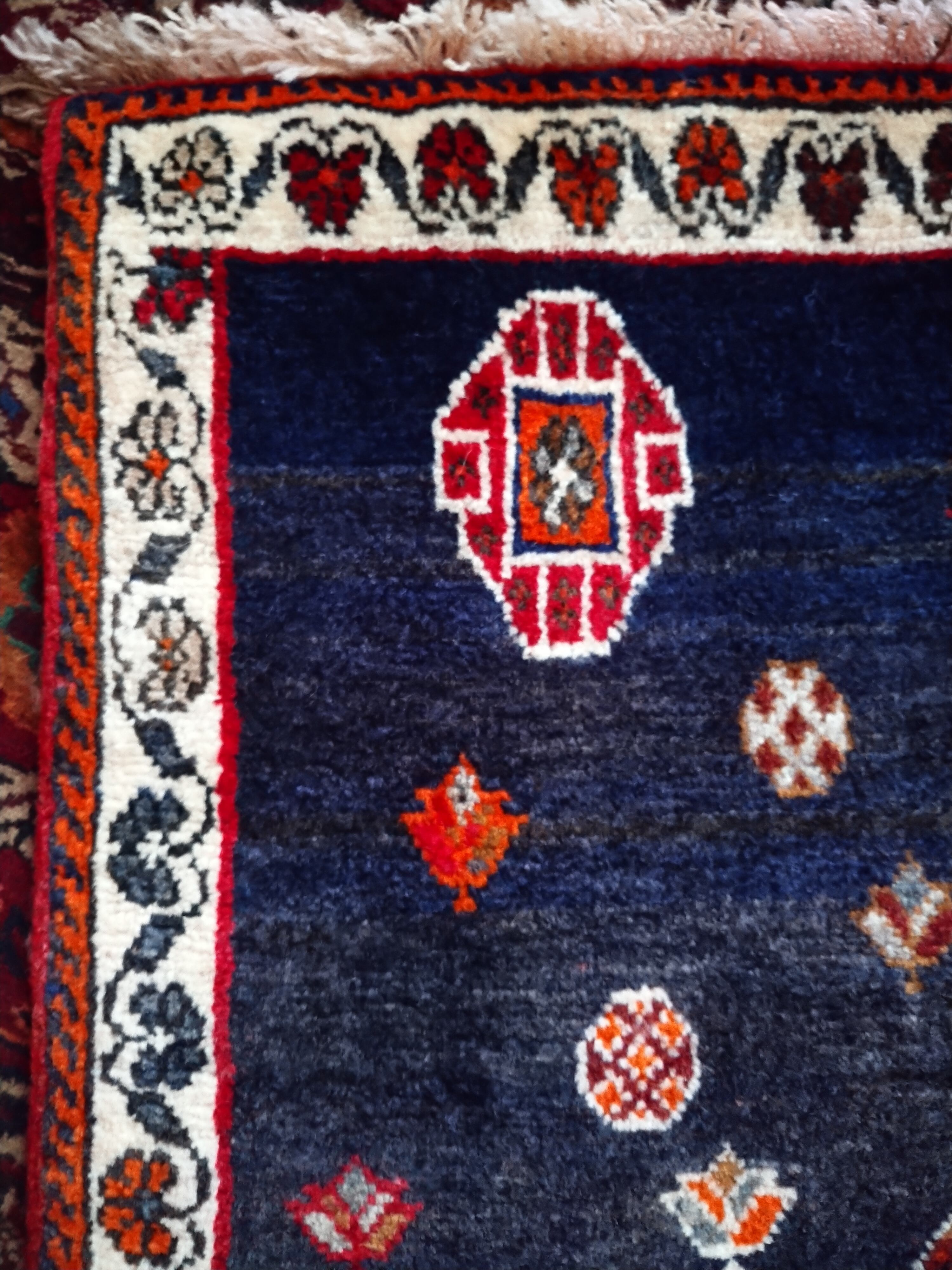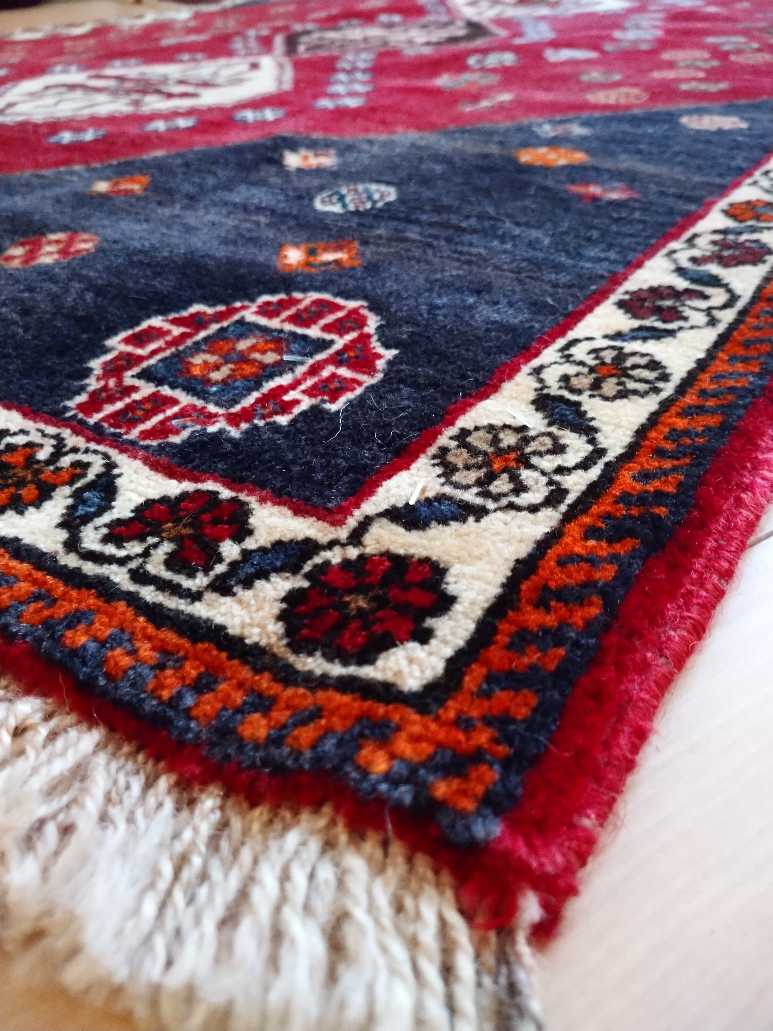 ネイビーと赤のはっきりとしたコントラストがかっこいい絨毯です。ヴィンテージとは思えないほど肌触りが柔らかです。フサの一部が色が違うところも素敵です。回りのお花柄の枠も美しく、よく見るとかわいらしいのです。