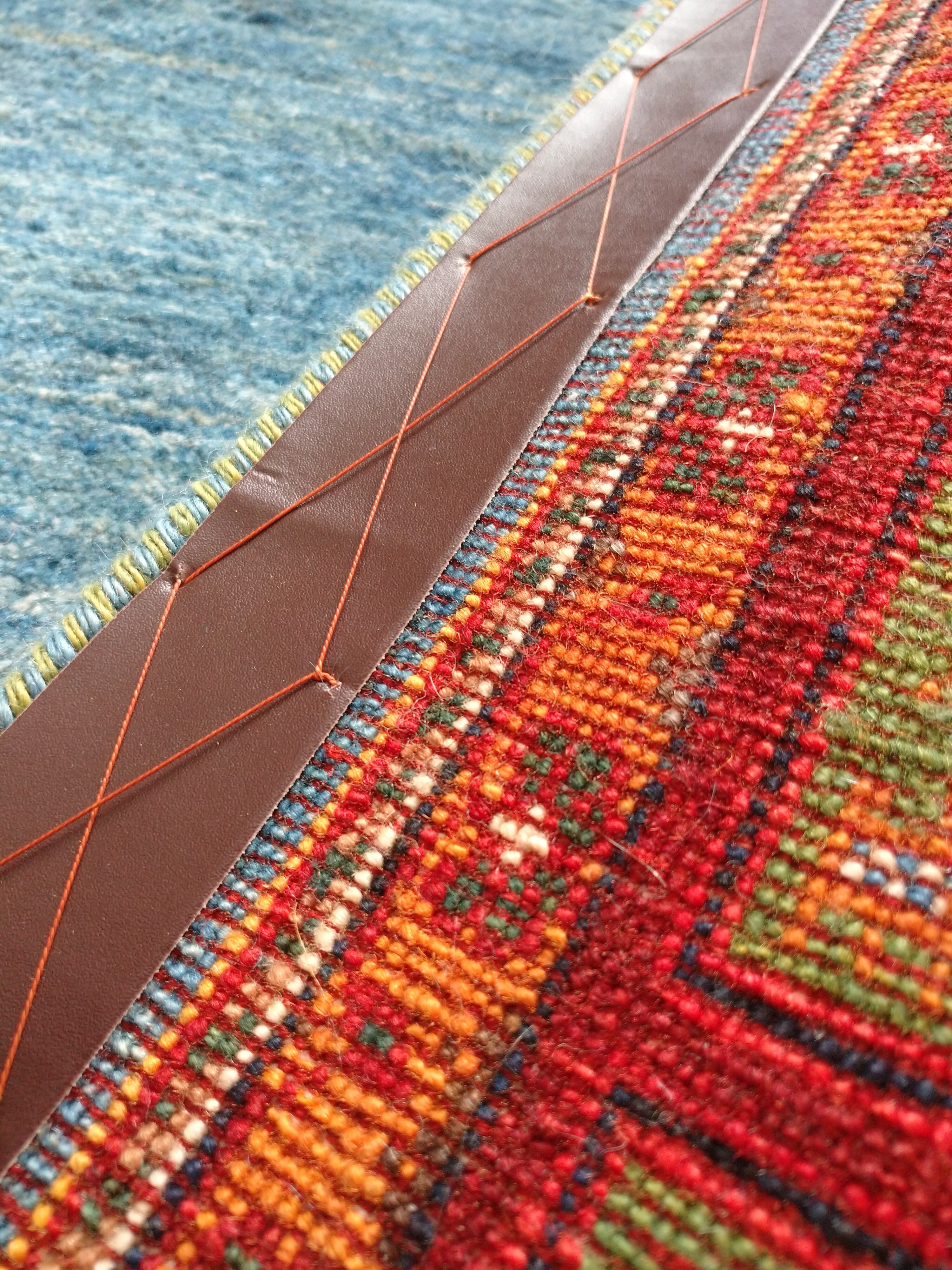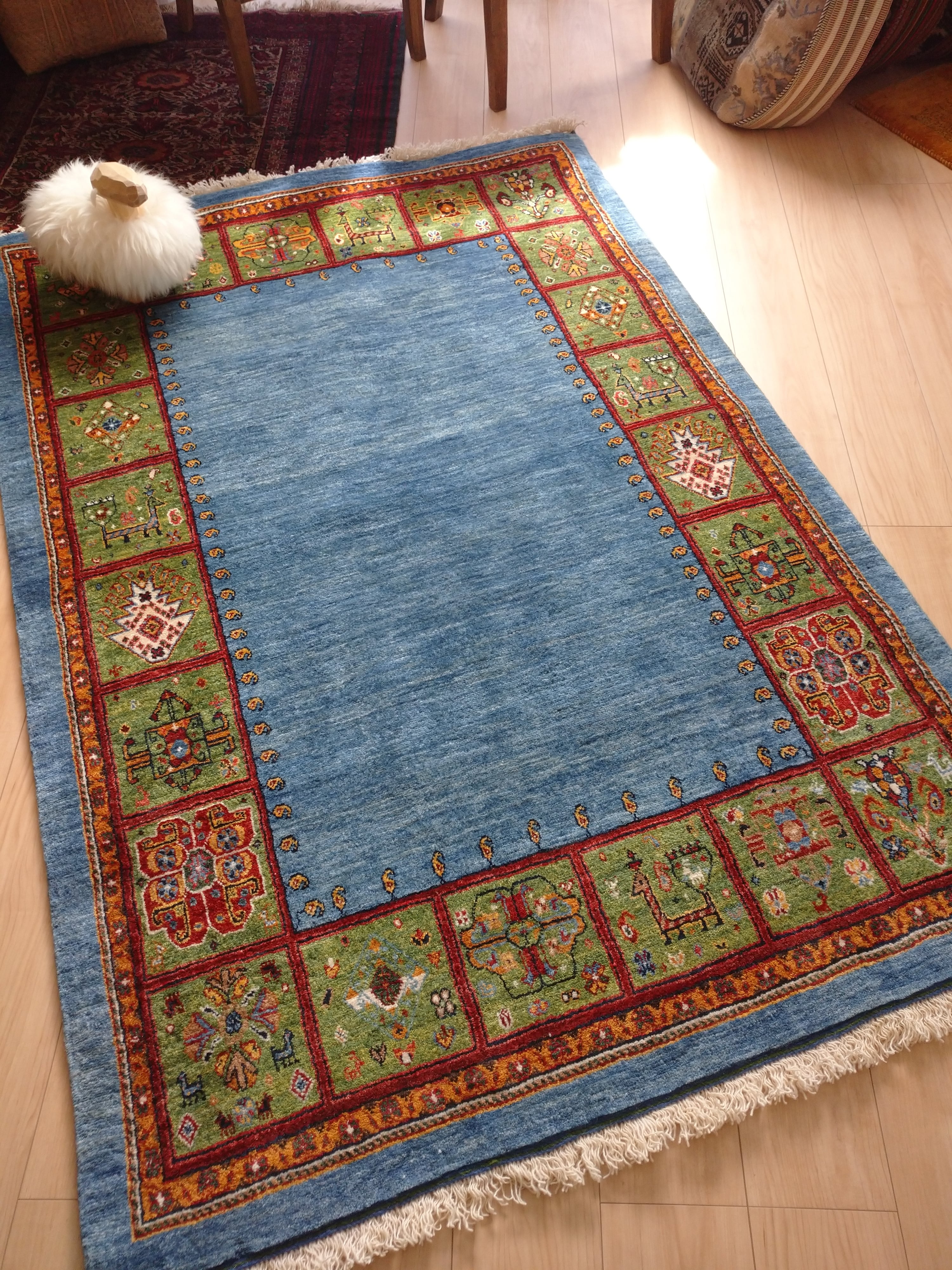 藍染のブルーが大変美しいエクセレントギャッベです。足を乗せていただくと、そのウールの上質さがわかります。グリーンベースの縁取りの枠の中にとても細かく鳥や動物たち、その他いろいろな柄が細かく織り込まれています。