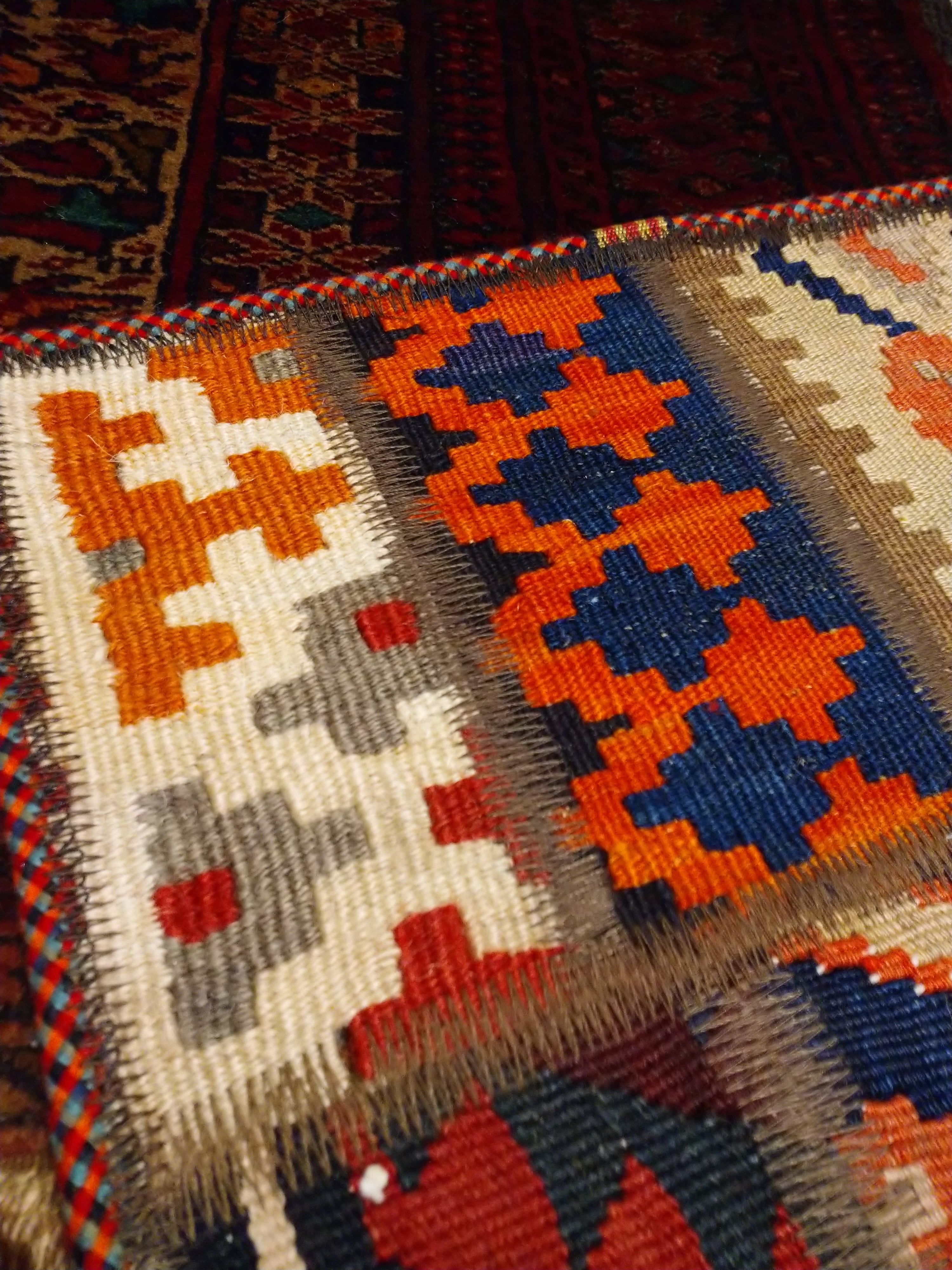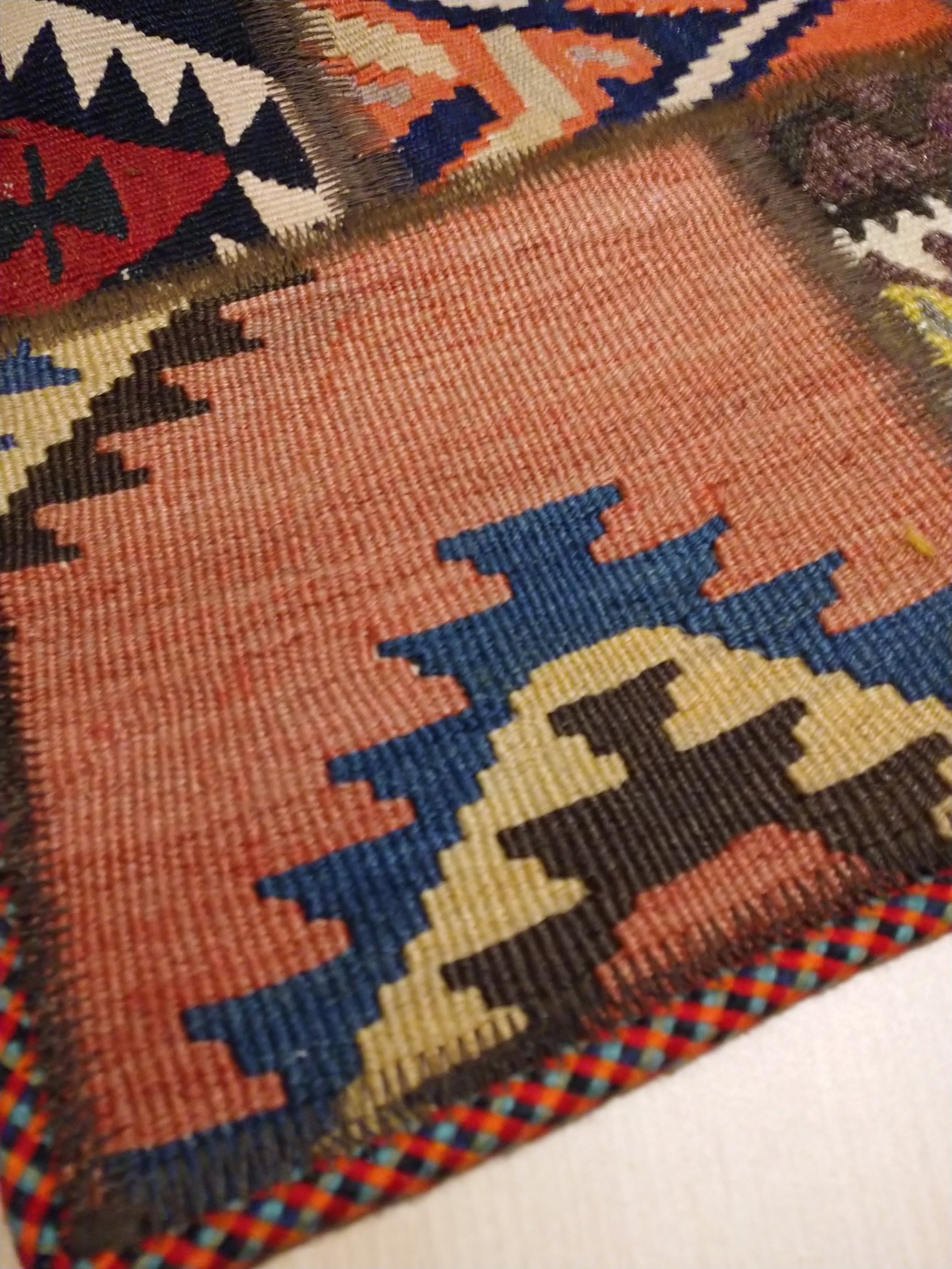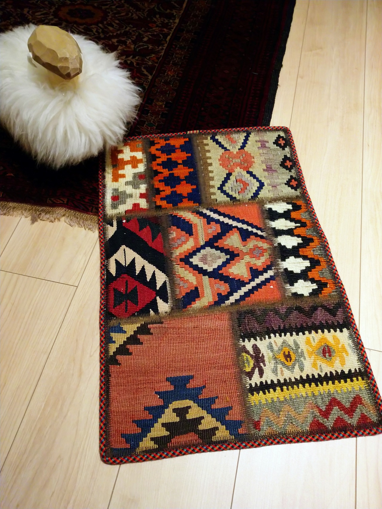 ヴィンテージのキリムをパッチワークしてリメイクしたマットです。
